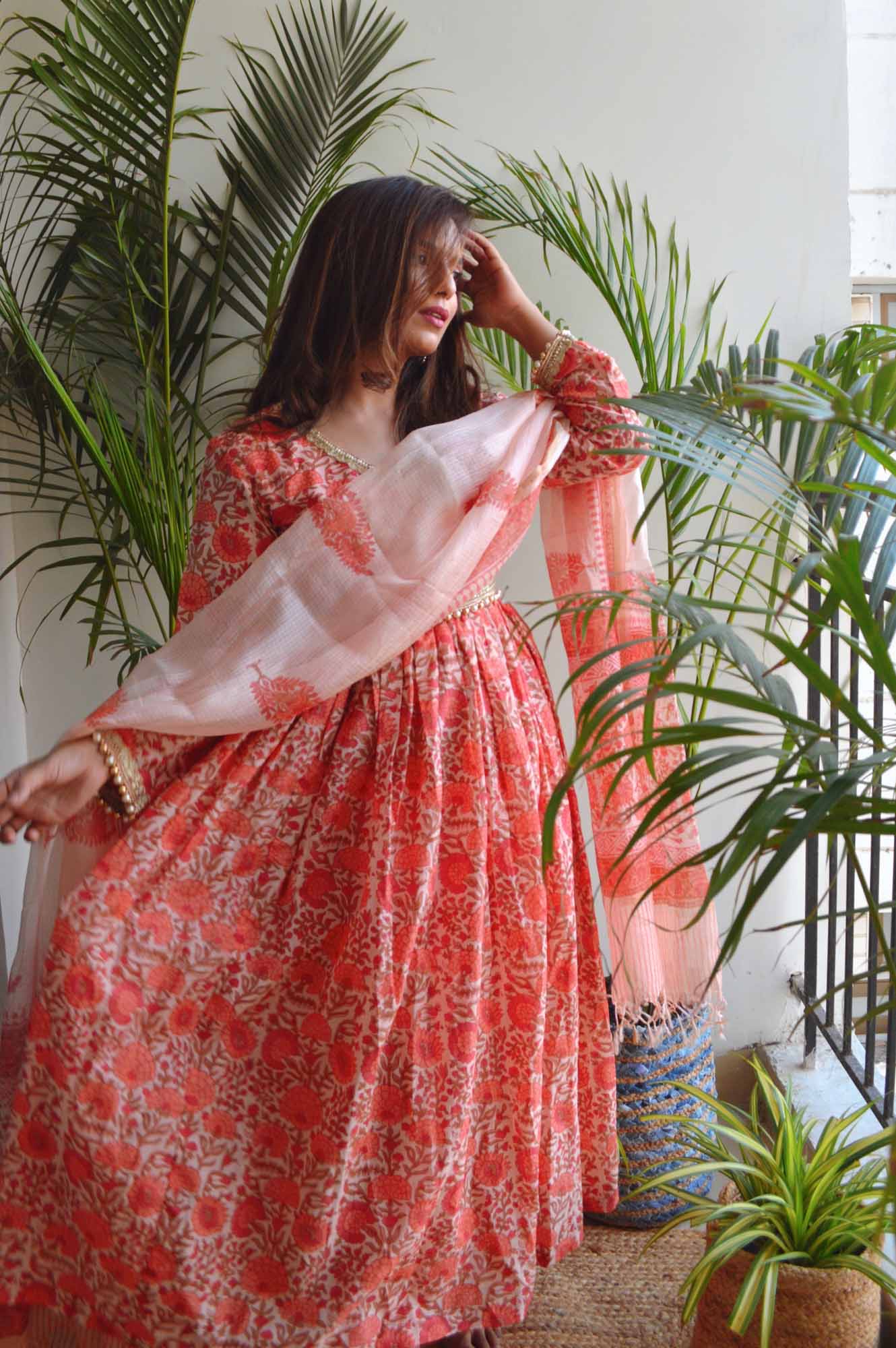 A cream and blue suit set with mulmul dupatta block printed in mughal motifs.