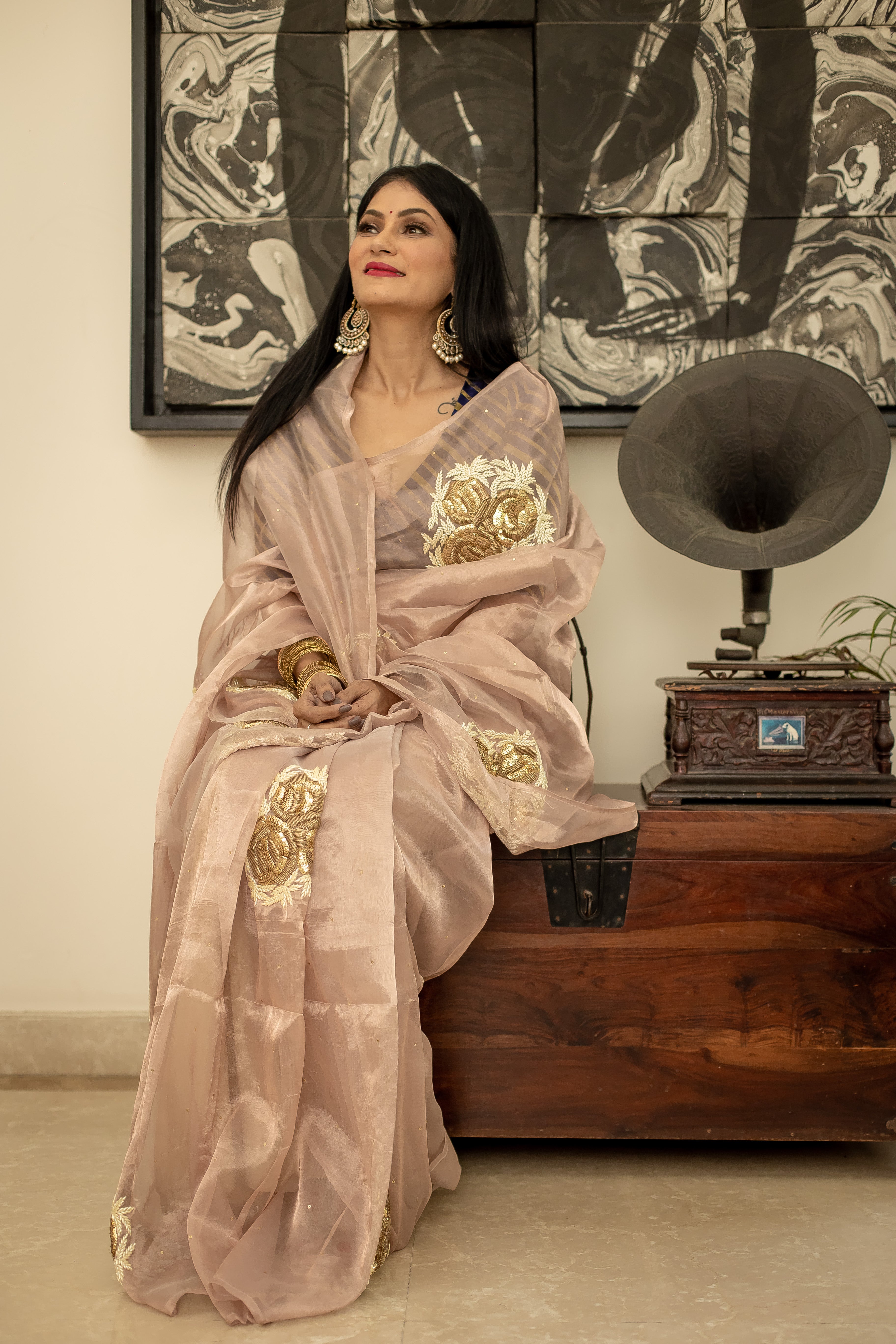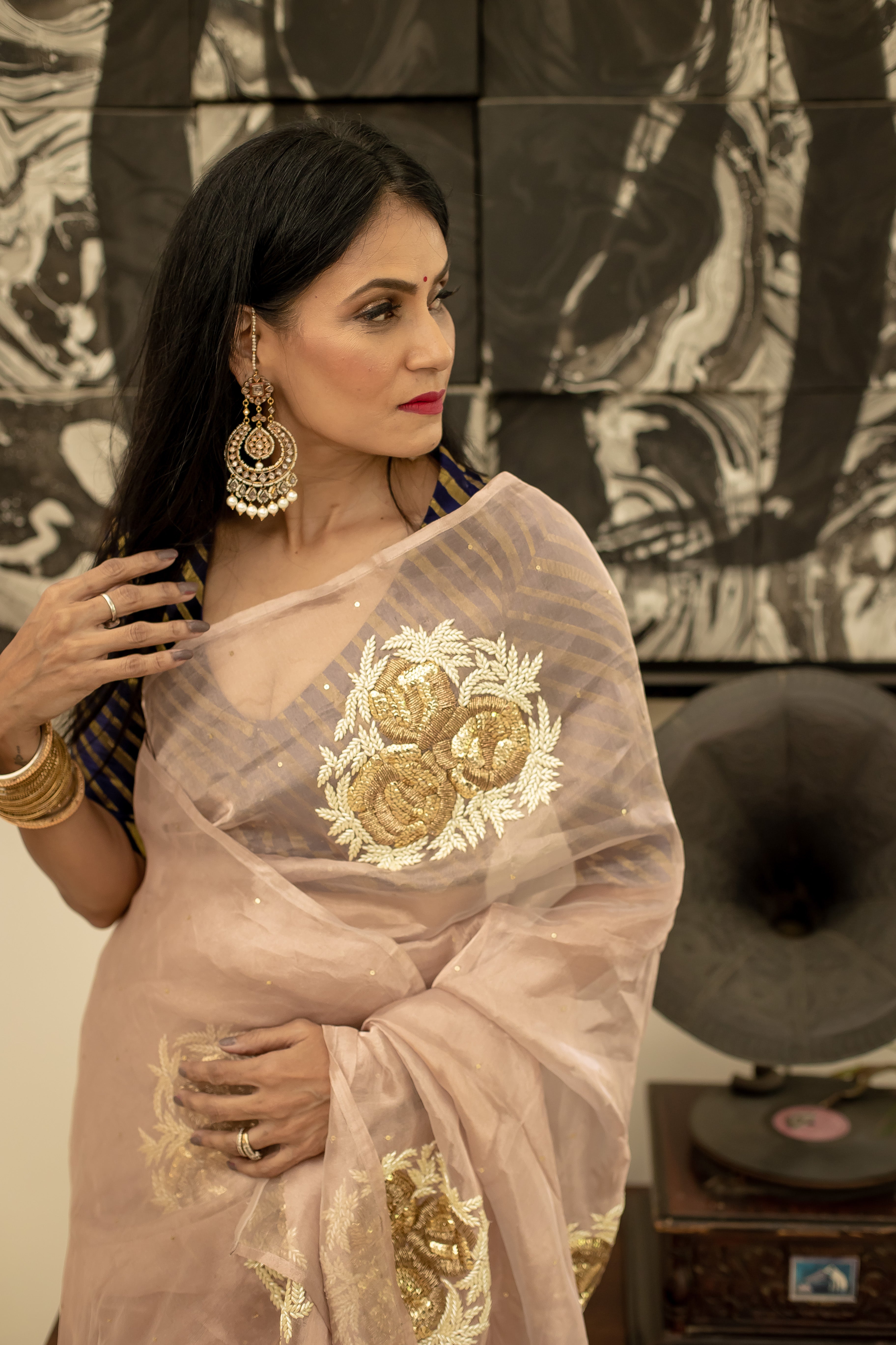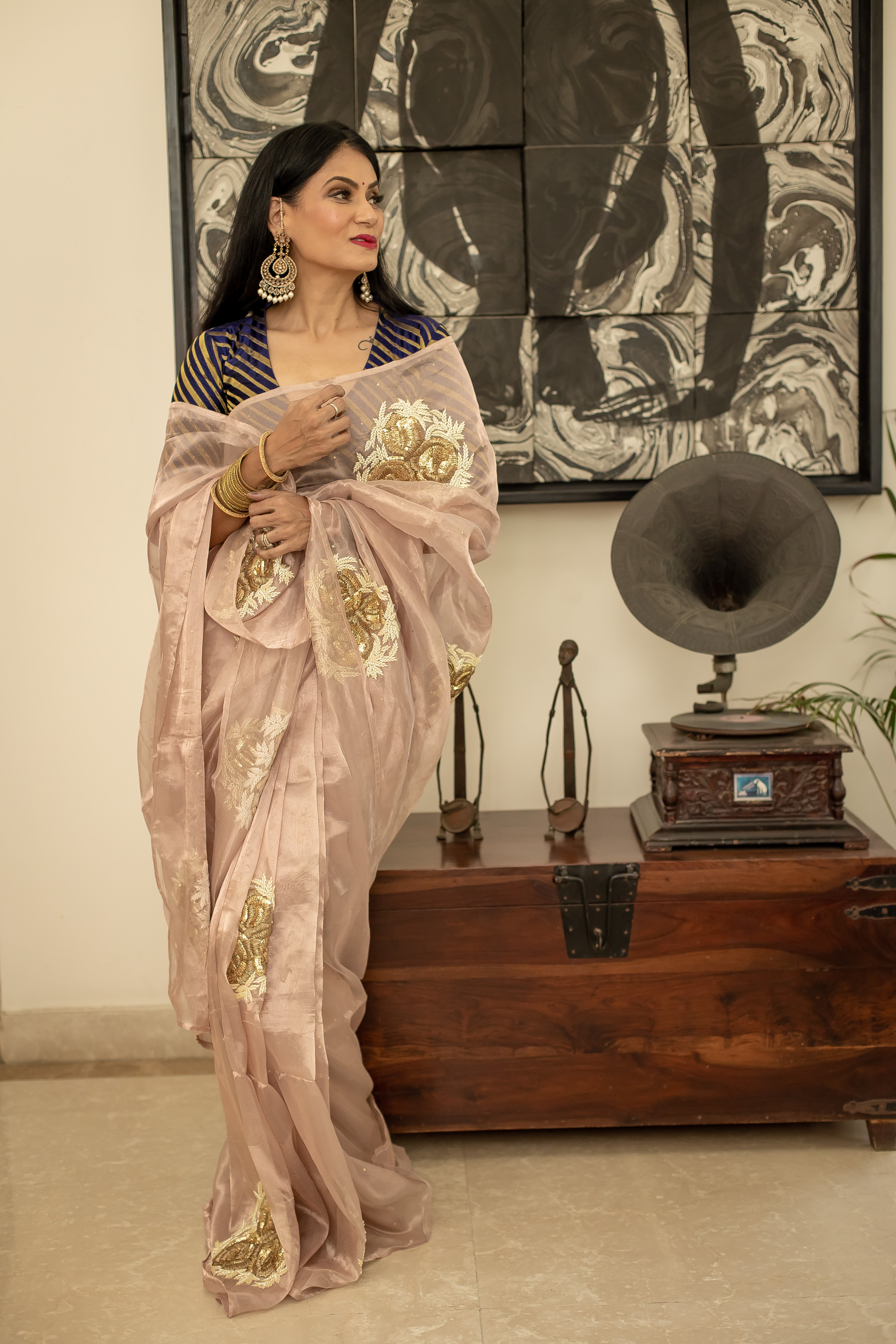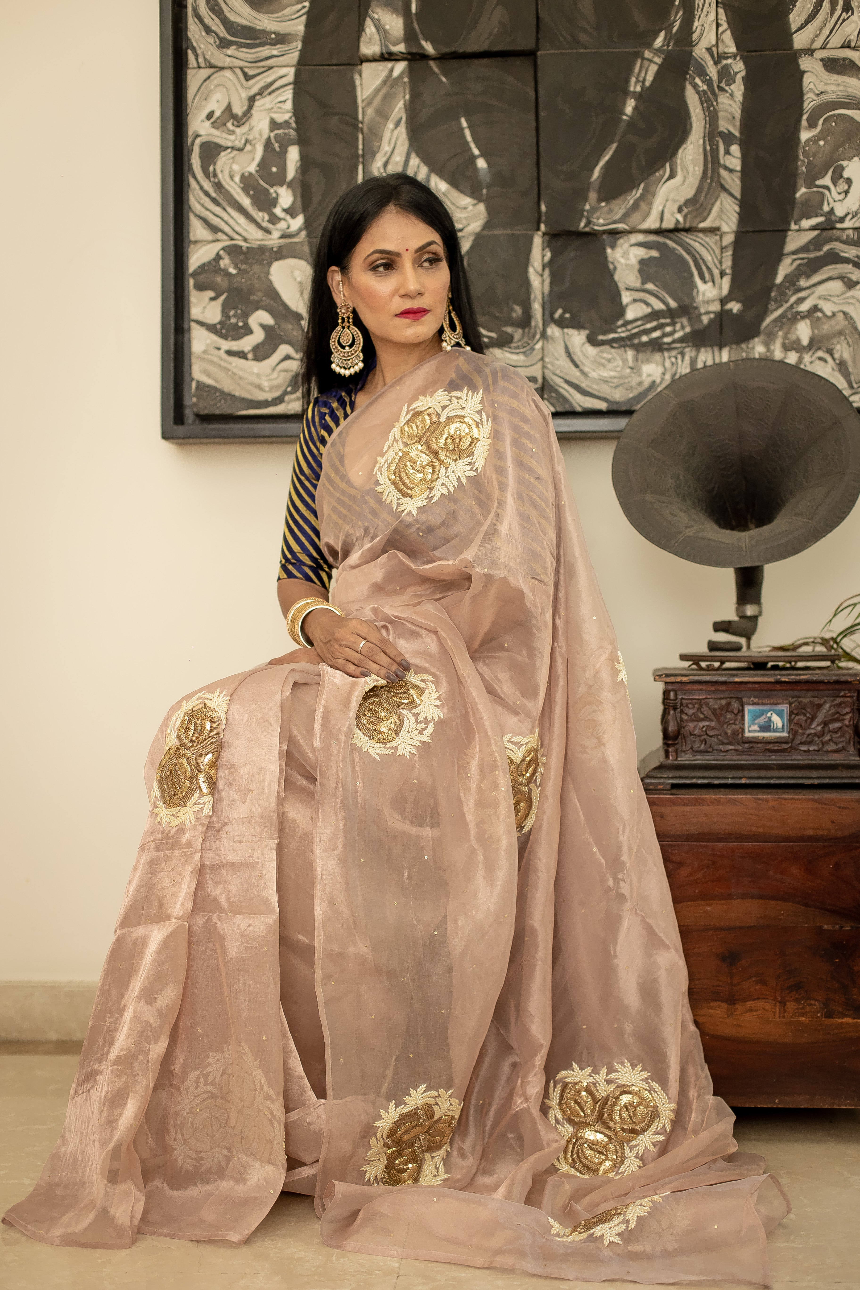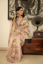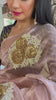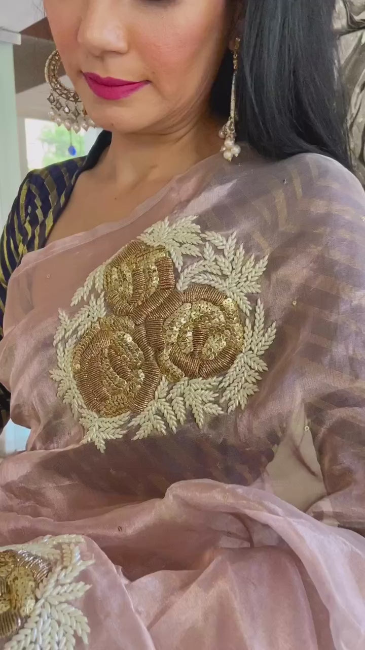 Motifs of roses and pearls on a beautiful rose gold tissue saree.