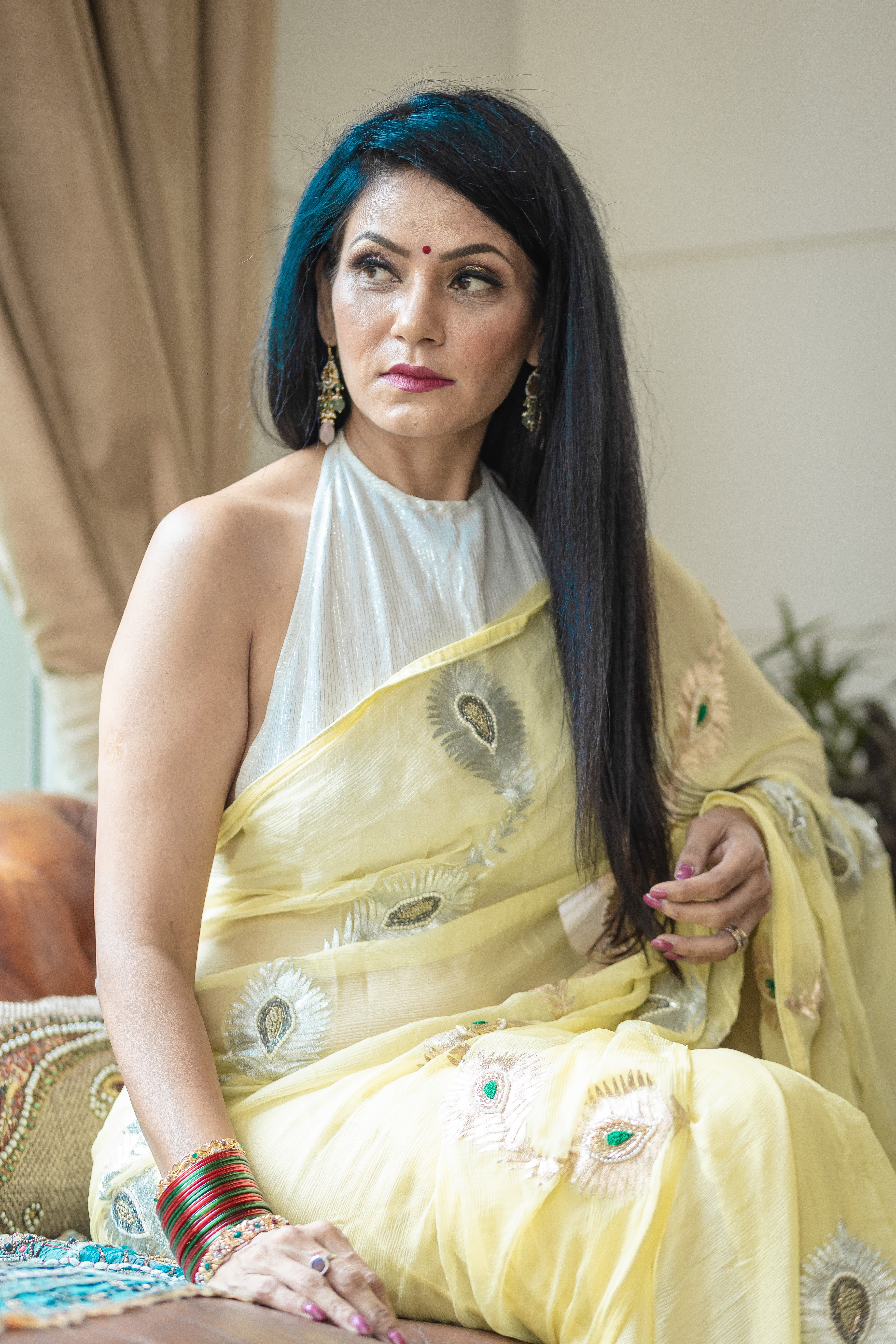 A baby yellow chiffon hand embroidered with metallic peacock feathers.