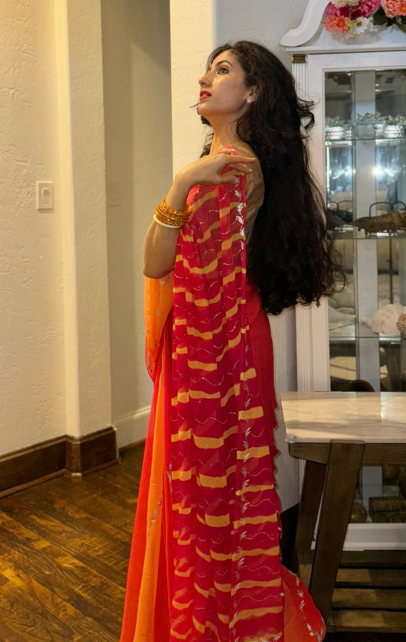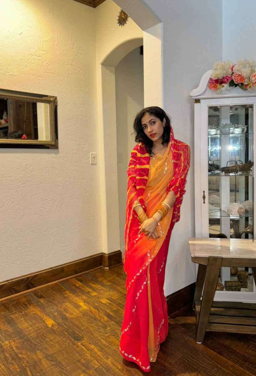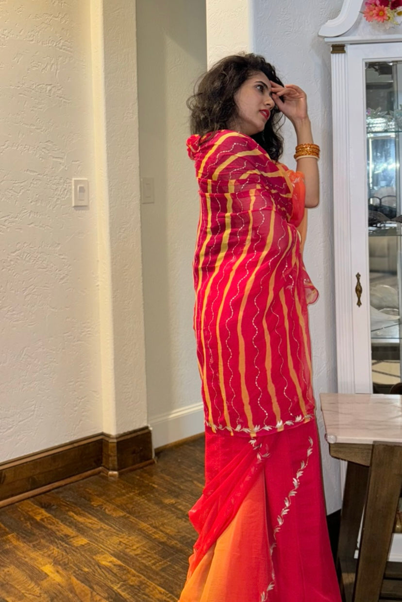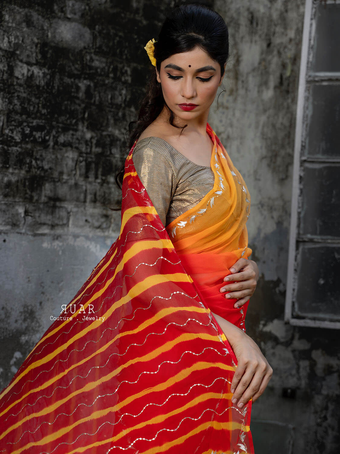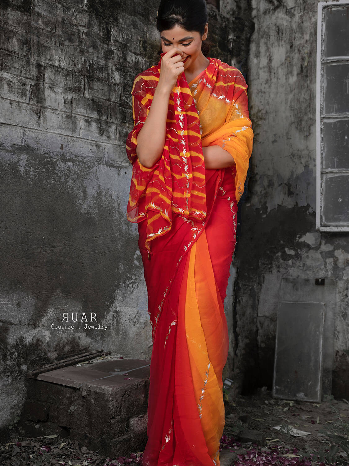 Amalgamating the tie and dye (leheriya) art with the craft of aari embroidery on chiffon.