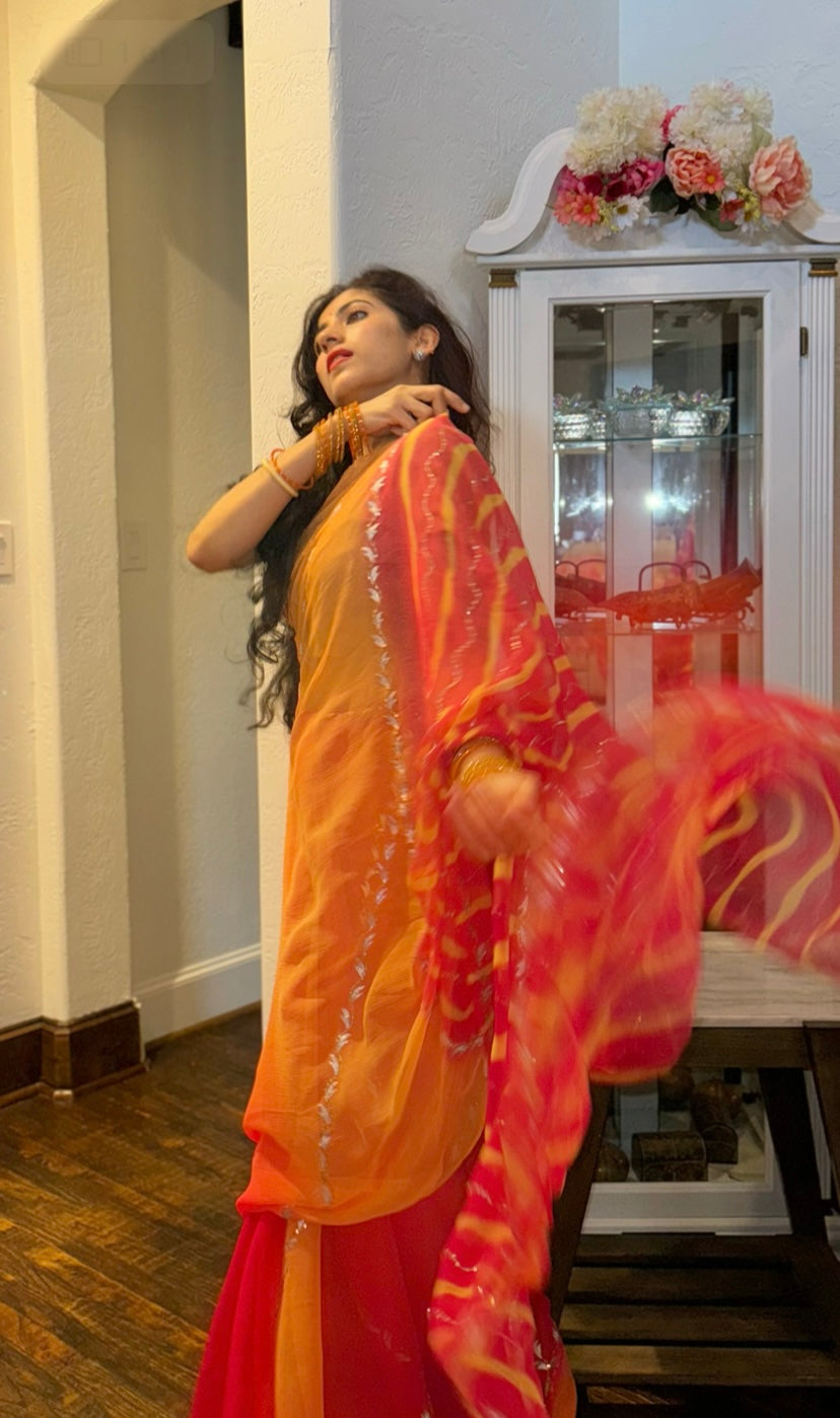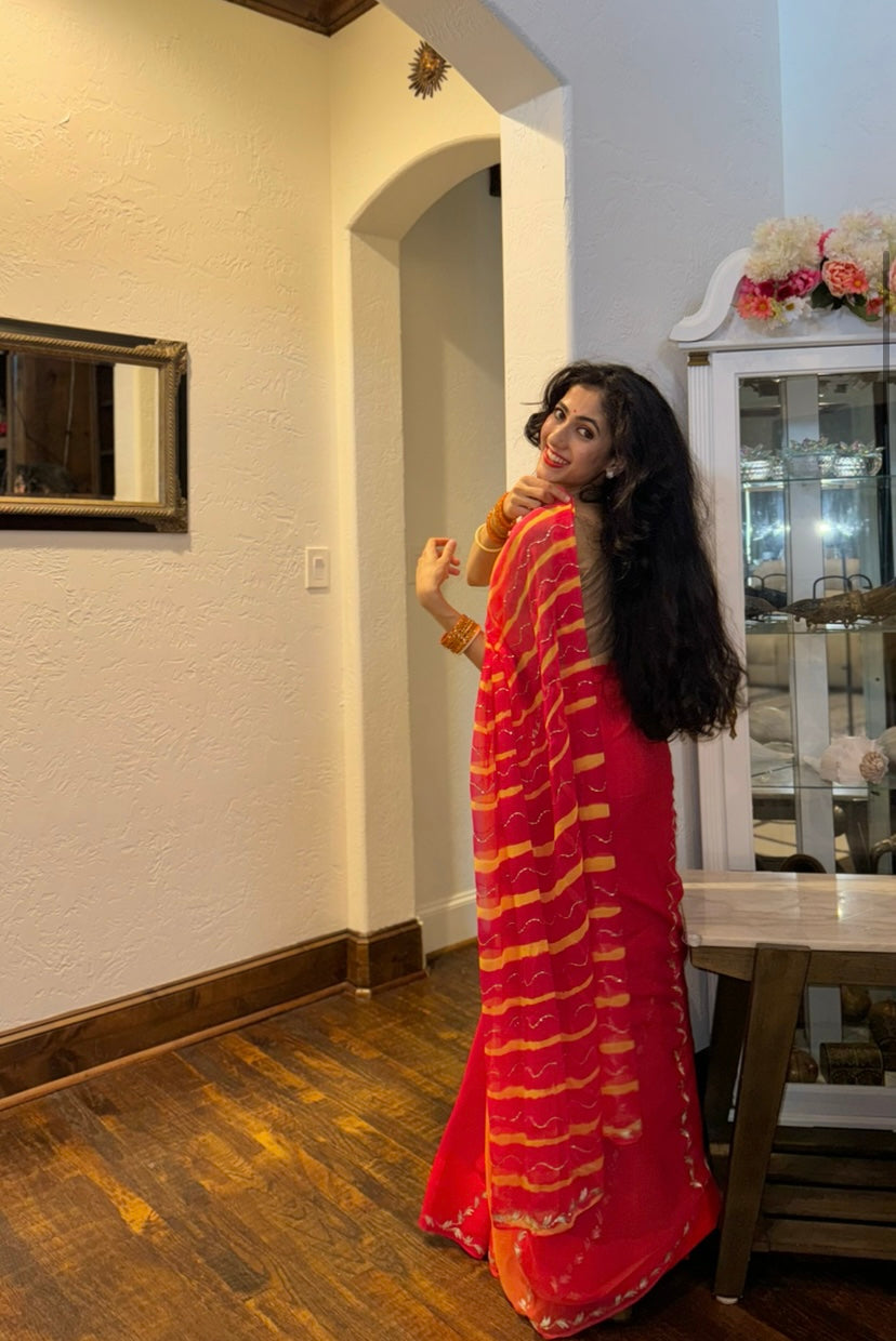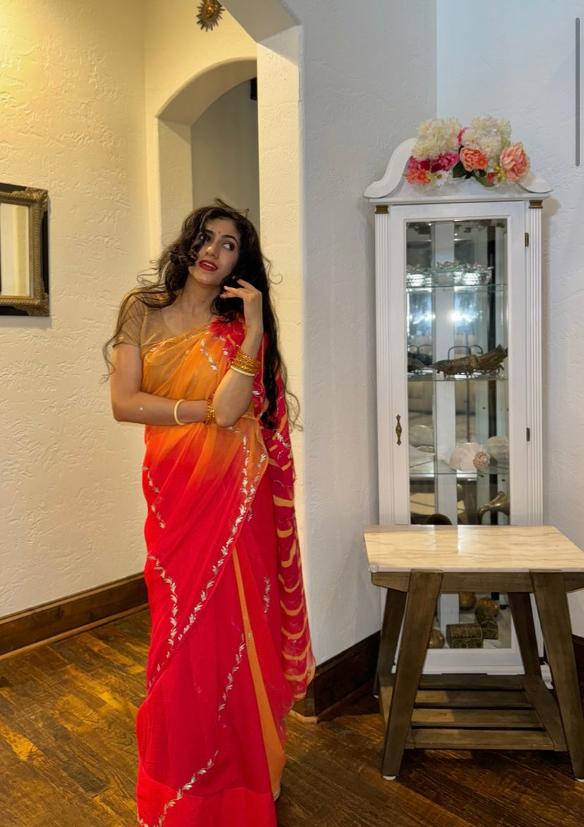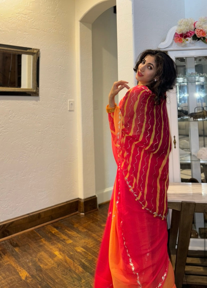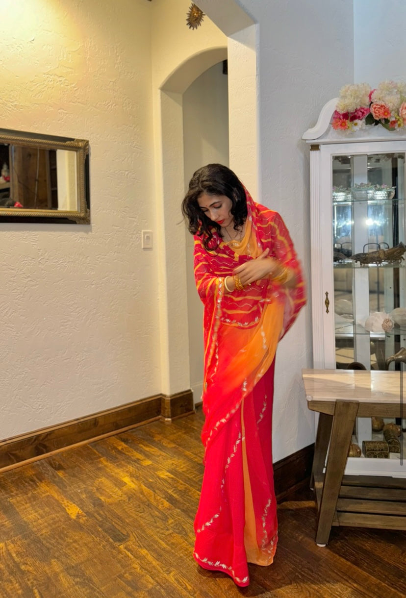 Amalgamating the tie and dye (leheriya) art with the craft of aari embroidery on chiffon.