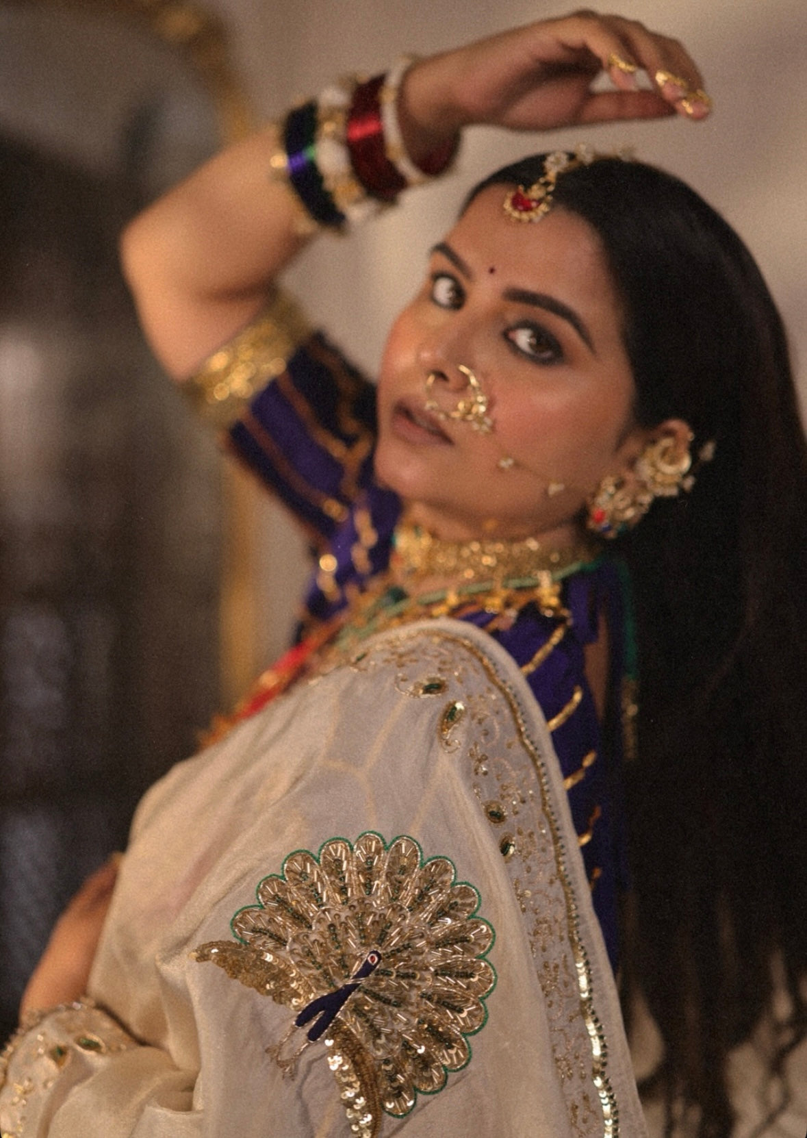 Grace in every fold — a cream tissue saree adorned with delicate golden borders and timeless peacock motifs, paired with a striking blue blouse piece for a touch of contrast.