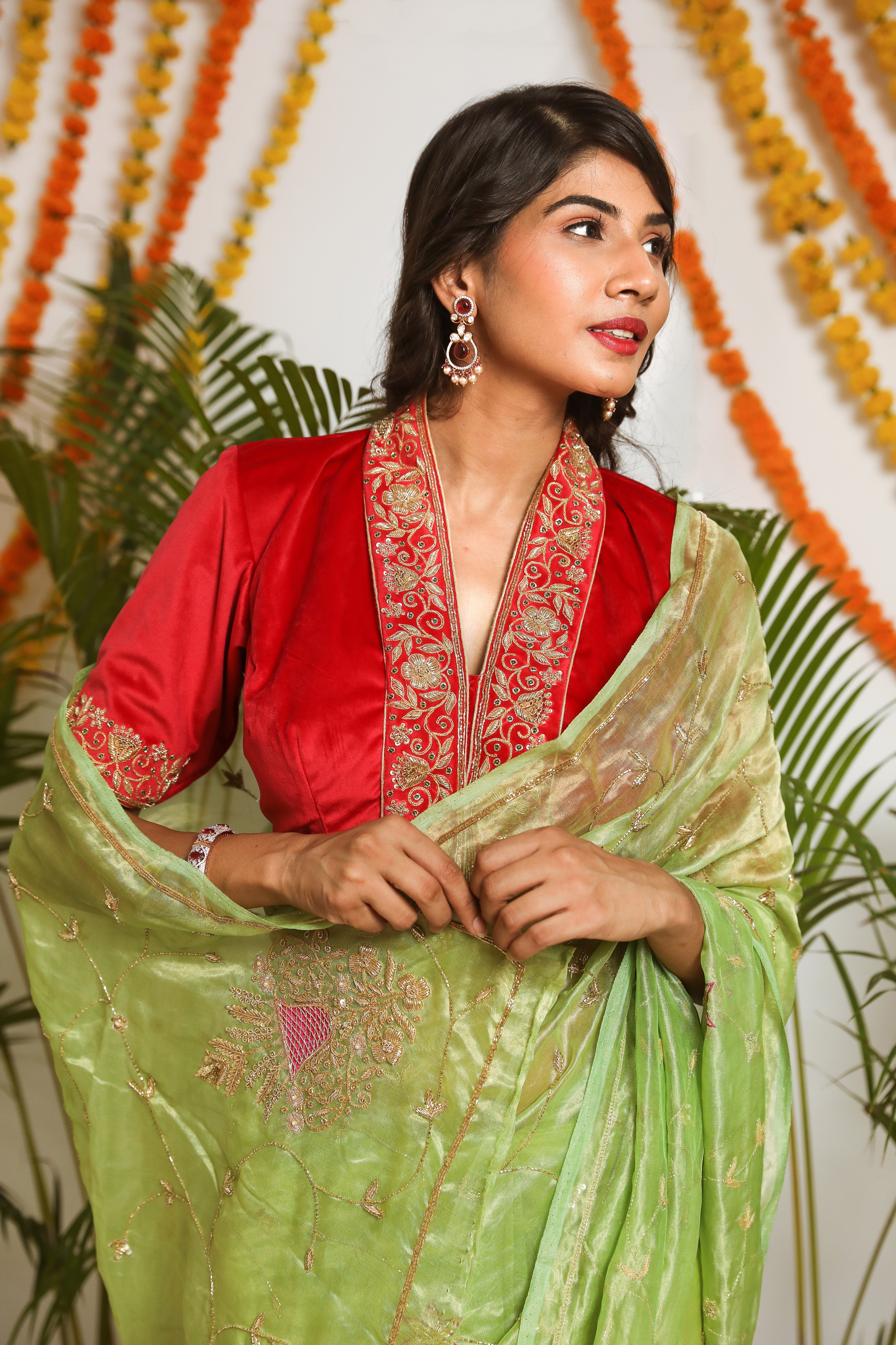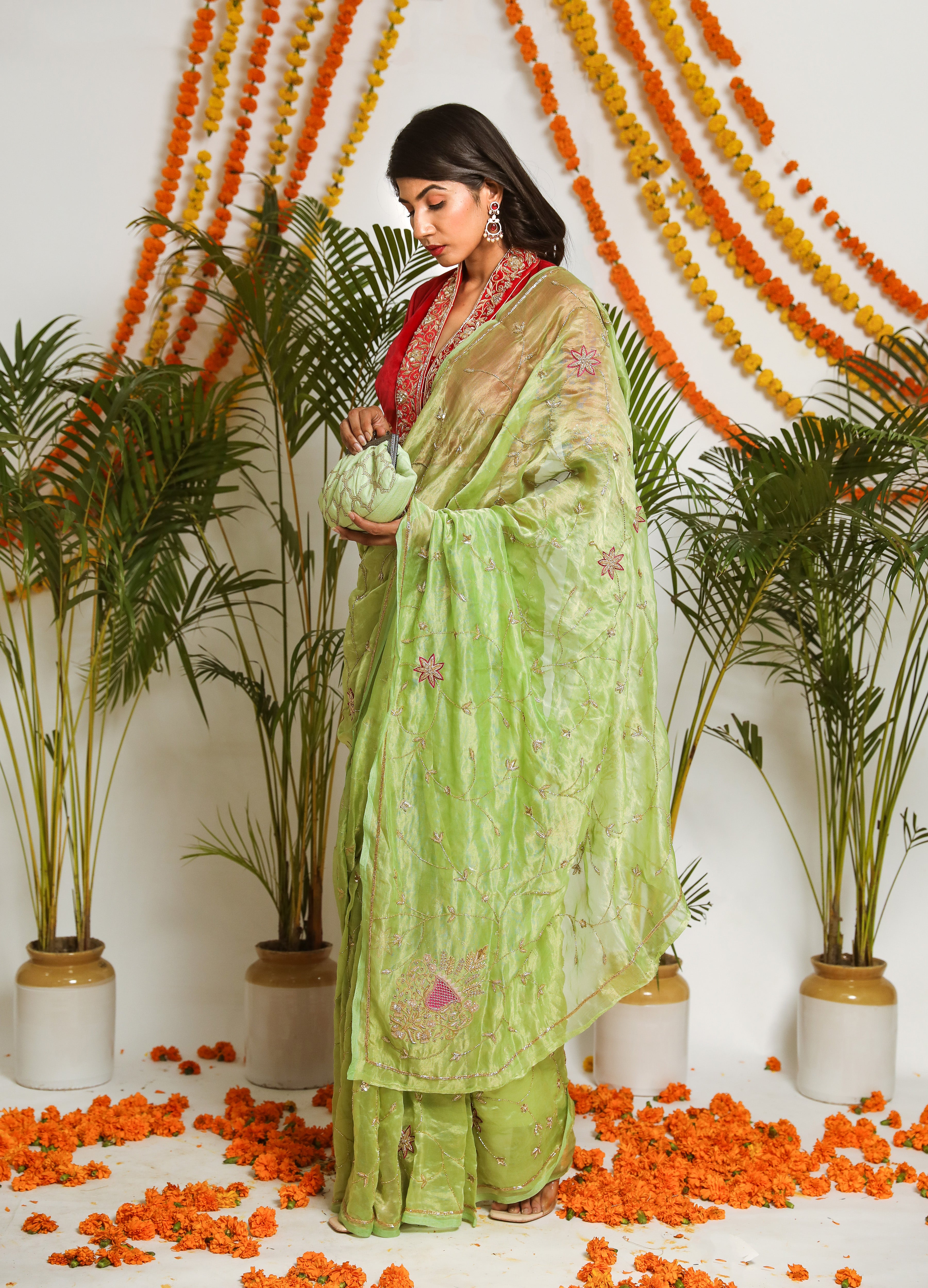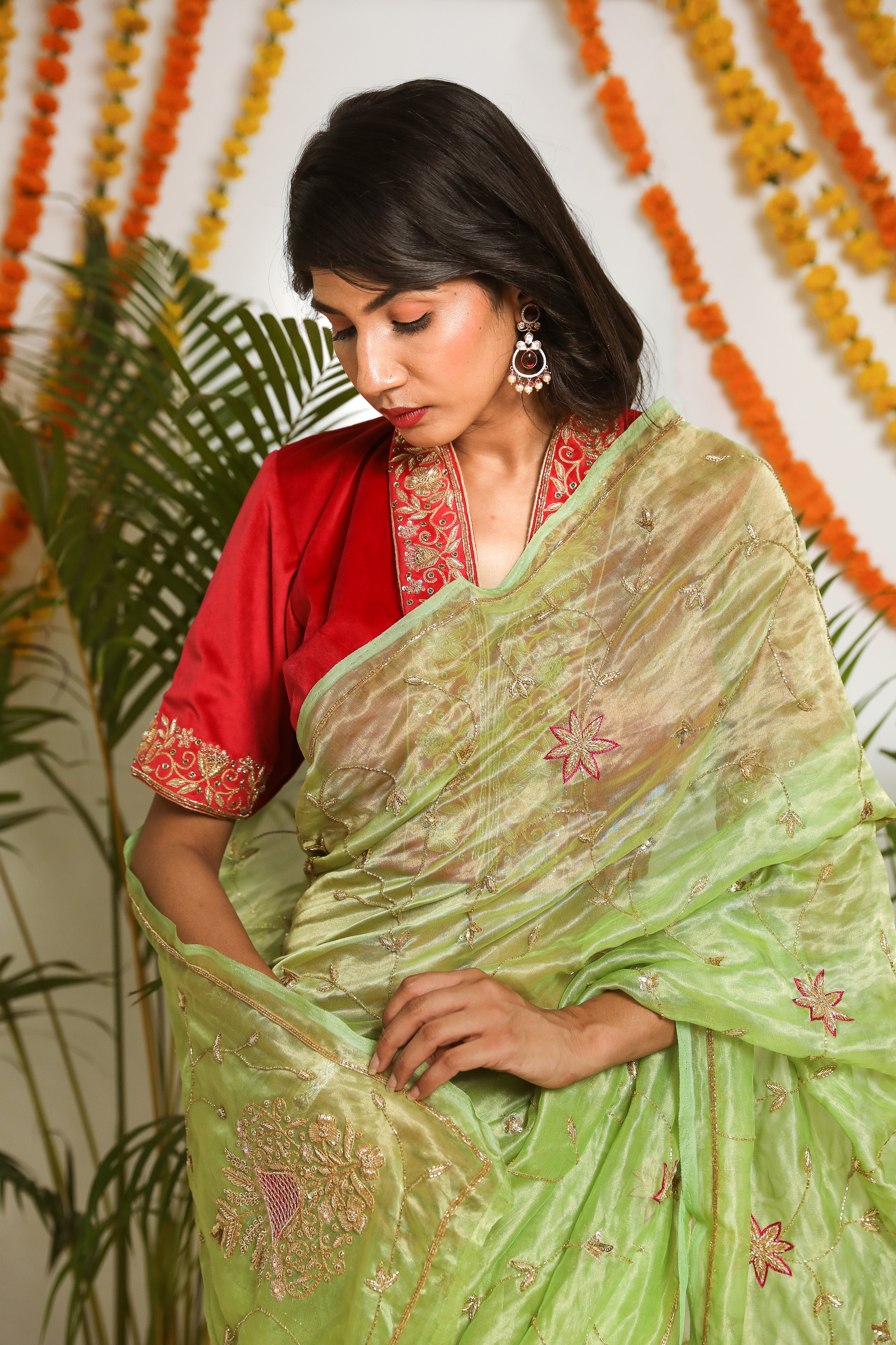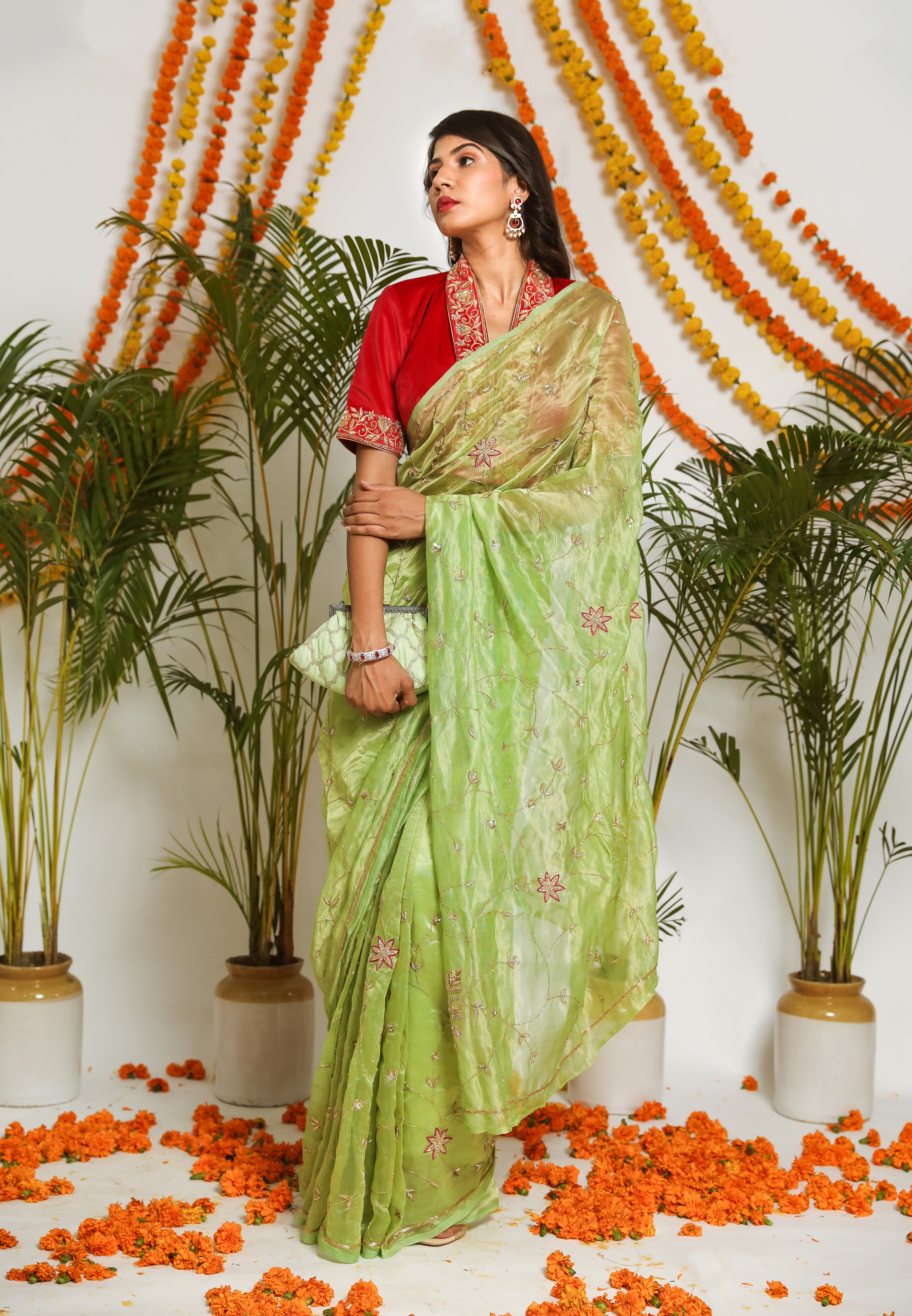 A soothing green pure tissue saree with patchwork & cutdana with sequins embroidered on it. The saree comes with a stitched blouse as shown on model.