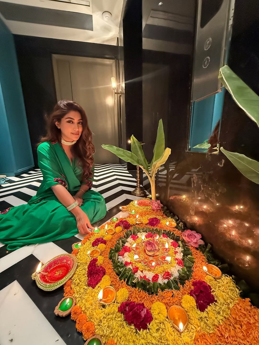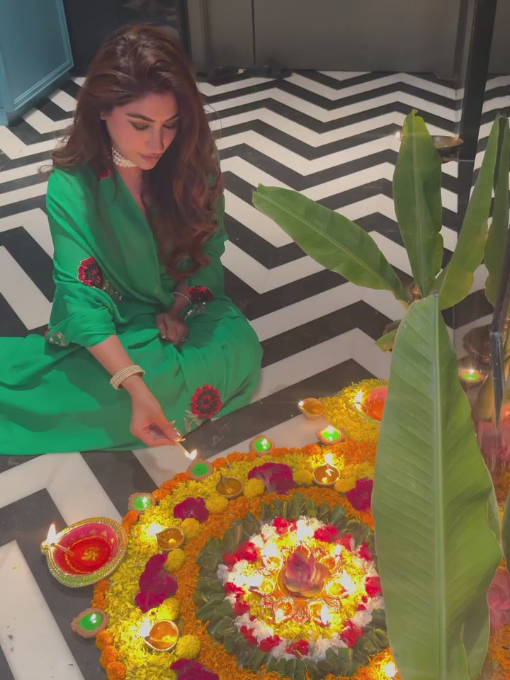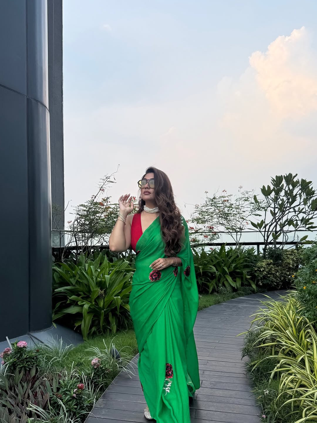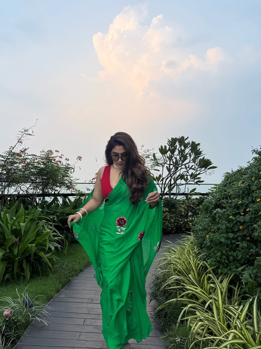 Our emeralds green pure chiffon saree with rose motifs in black and red sequins and border of same sequins.