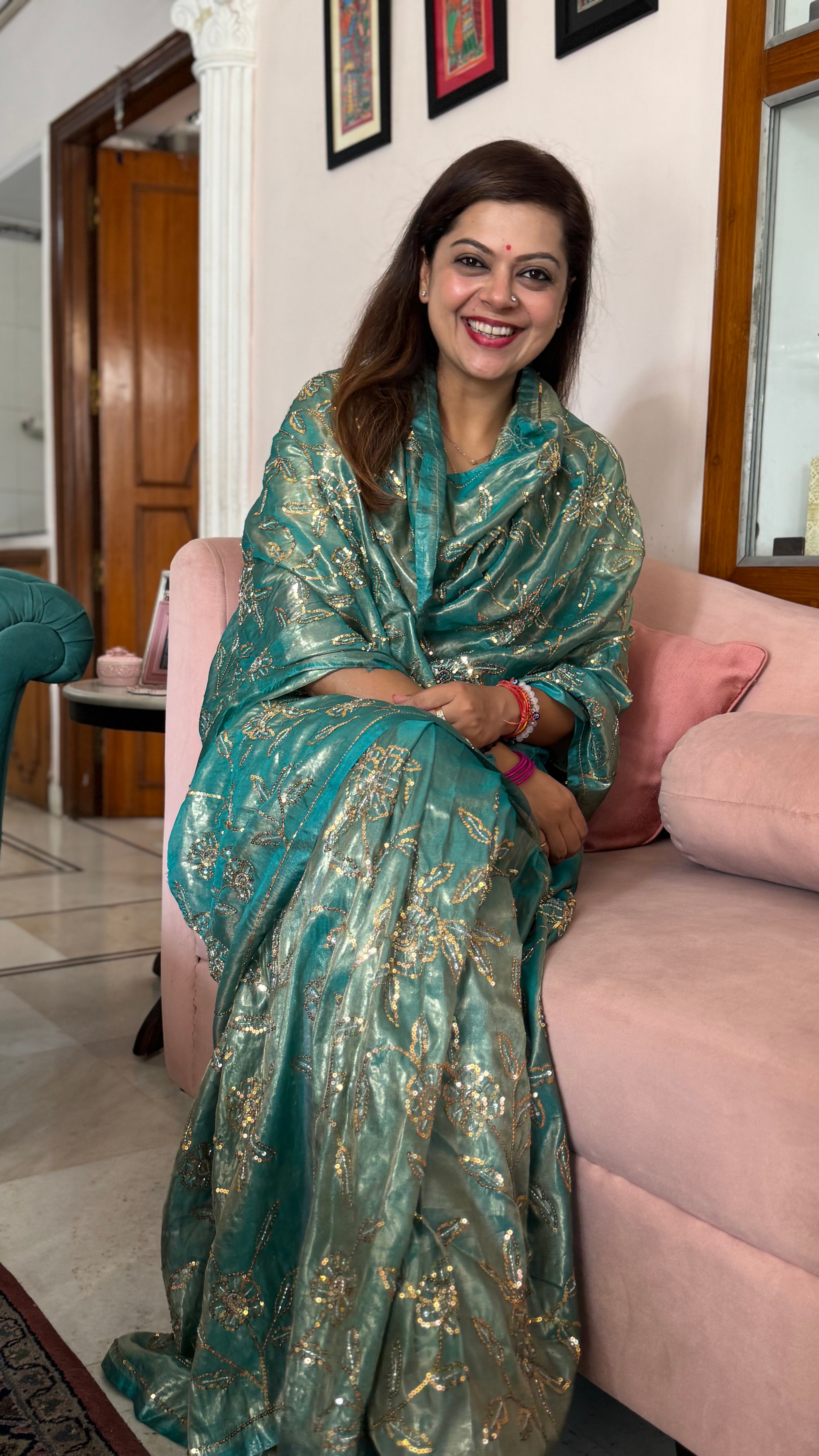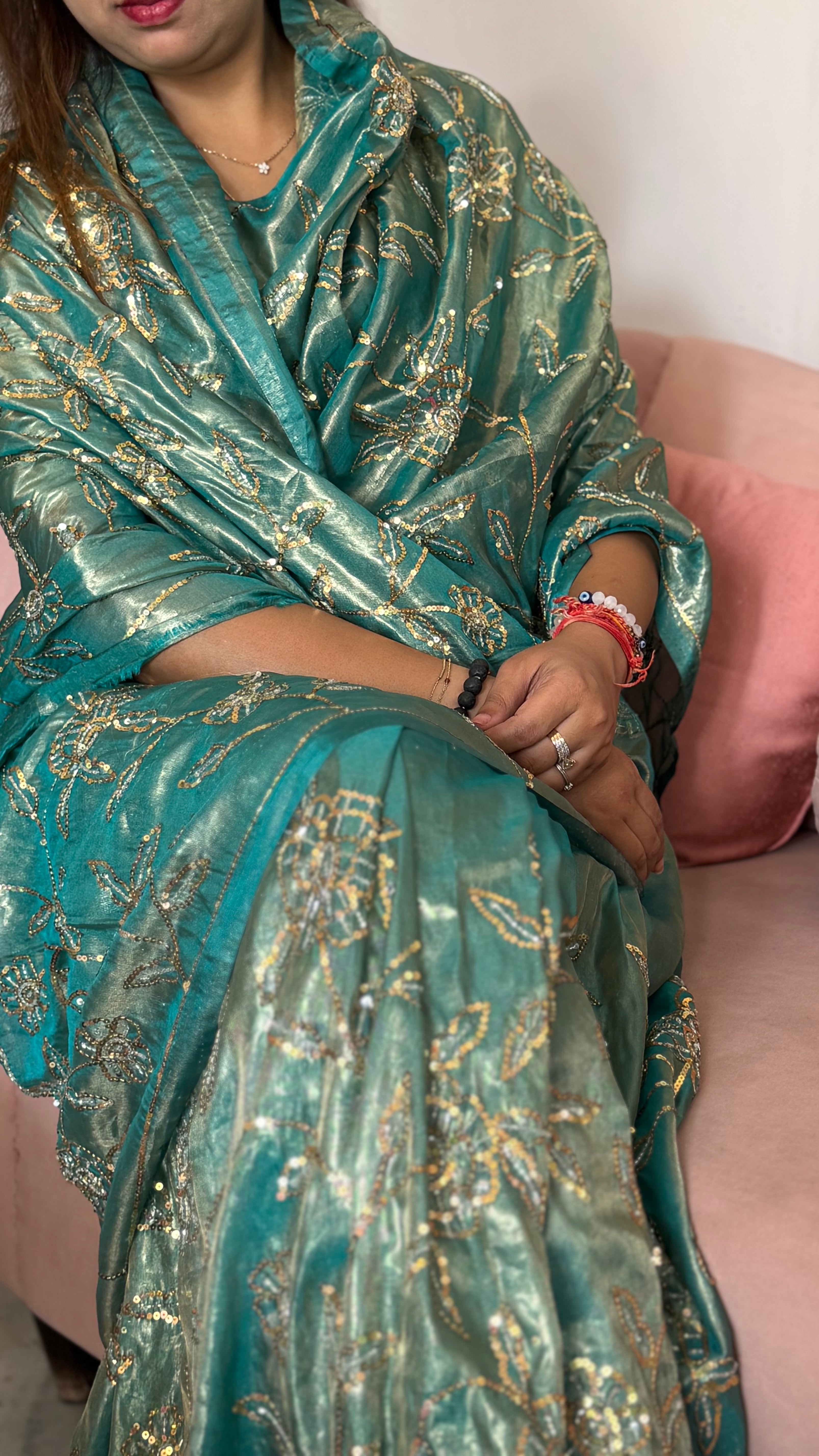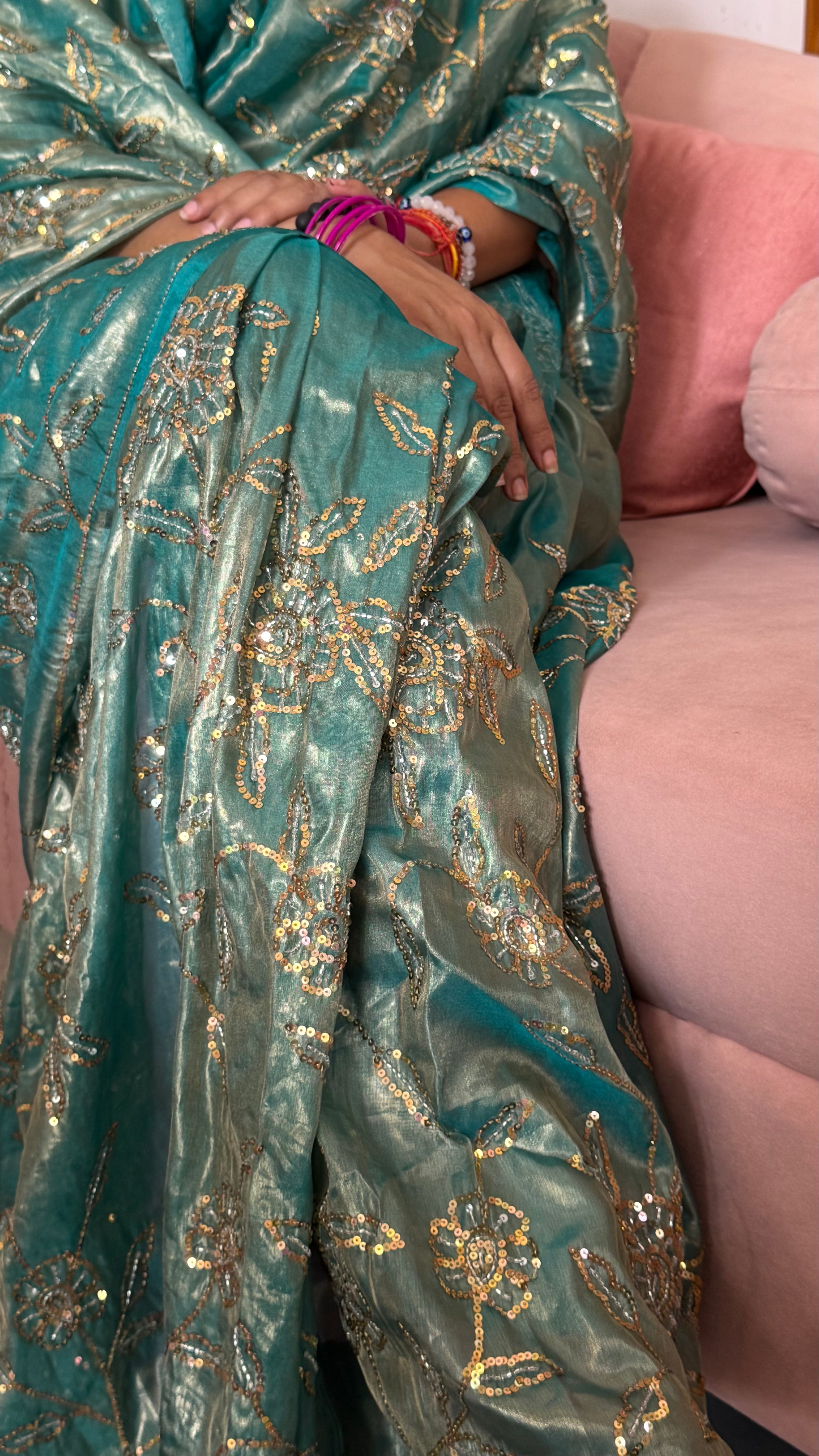 One of our best seller sarees for all season weddings. Its a perfect drape in tissu laden heavily golden sequins. The saree will be made on order.