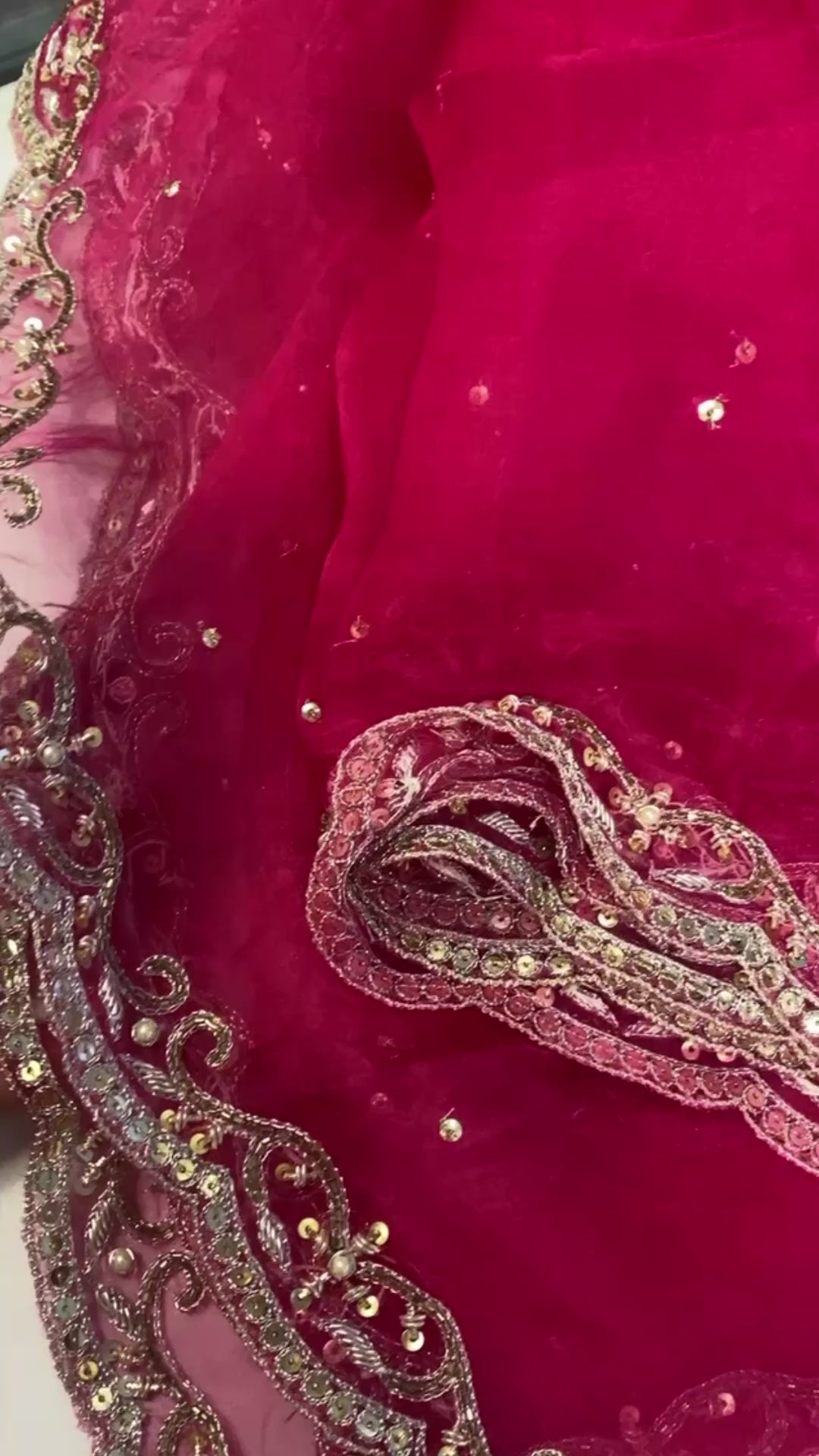 Our rani pink scallops organza saree with sequins spread out all over the saree.