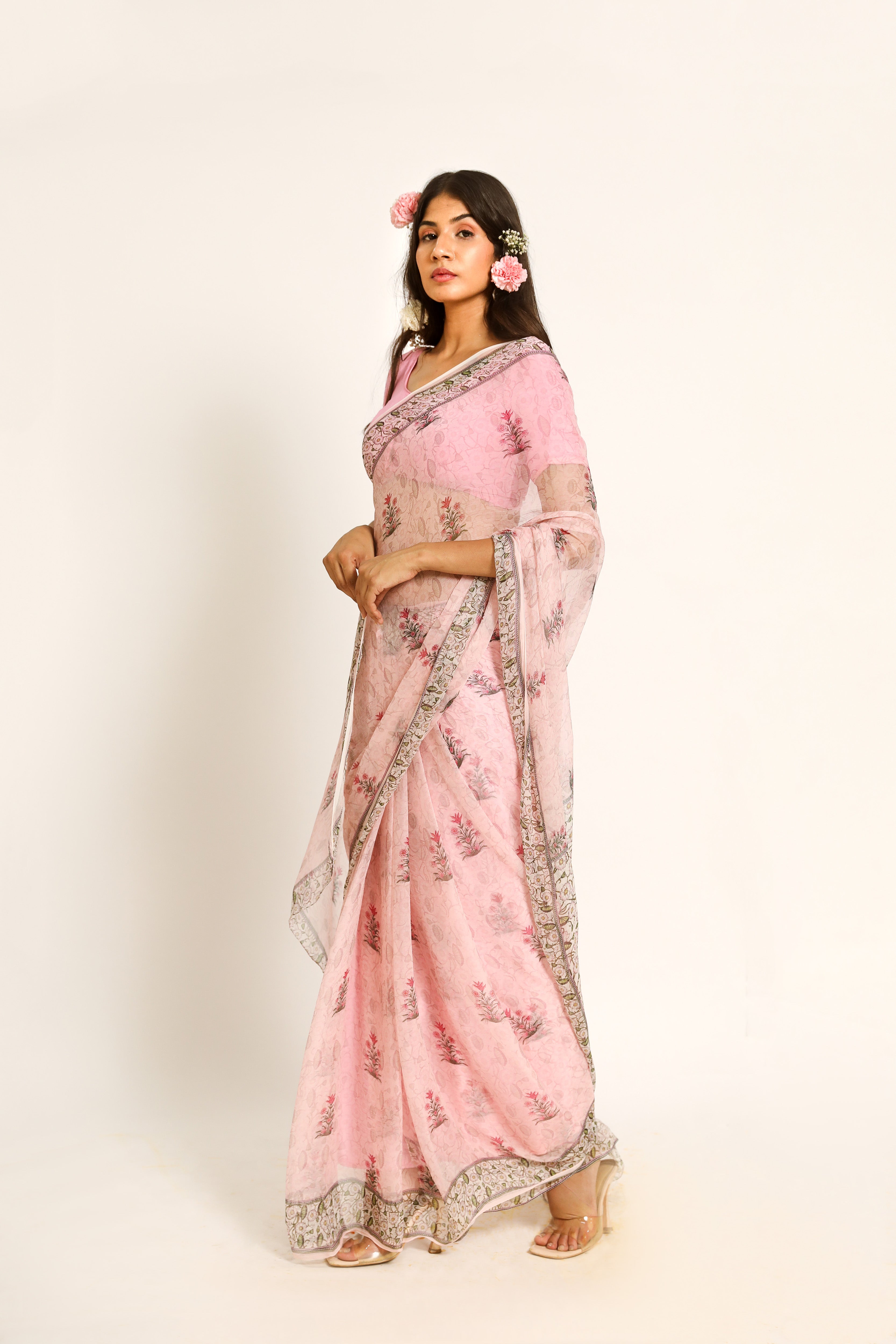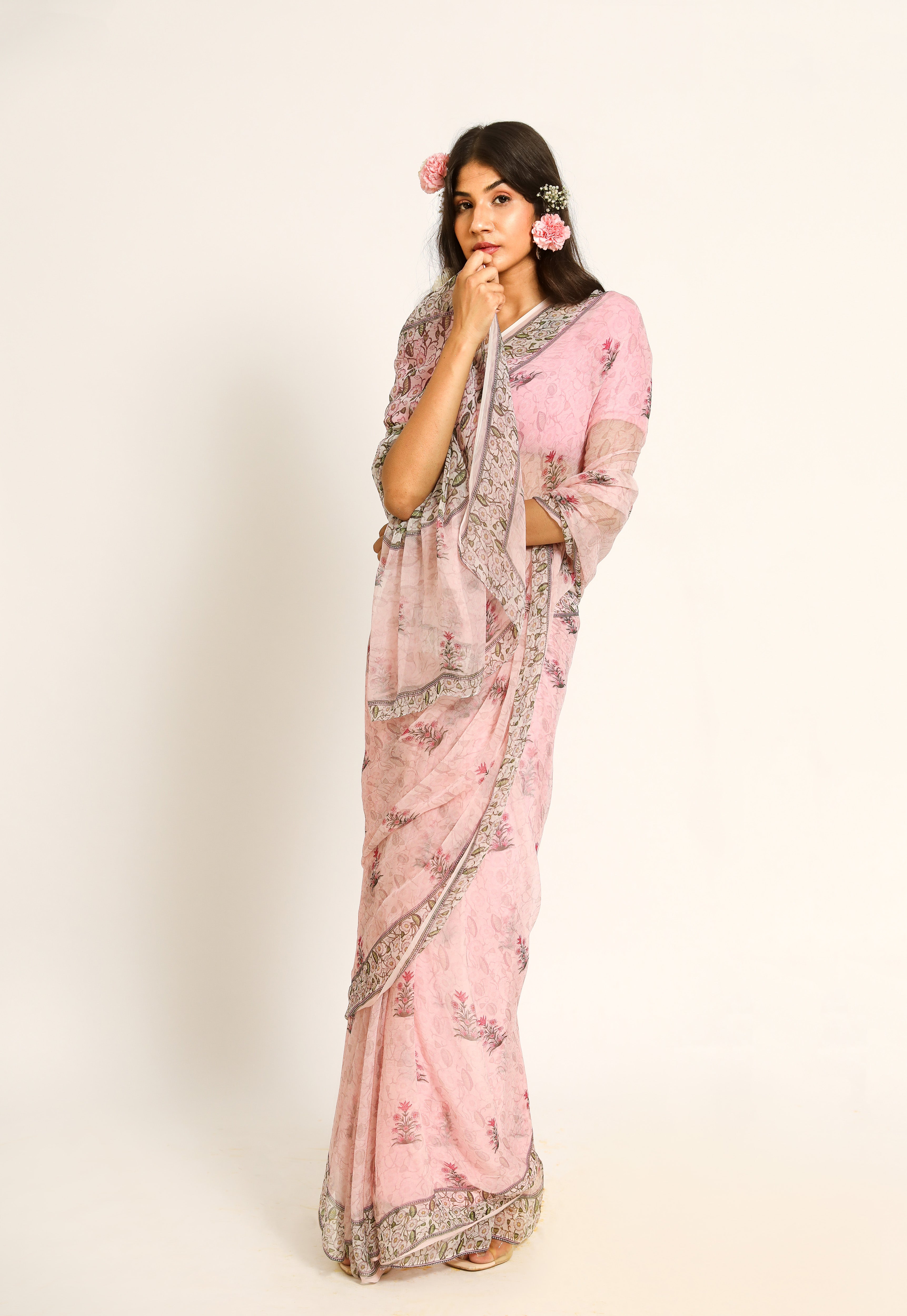 A printed soft pure chiffon saree paired with a baby pink crepe blouse.