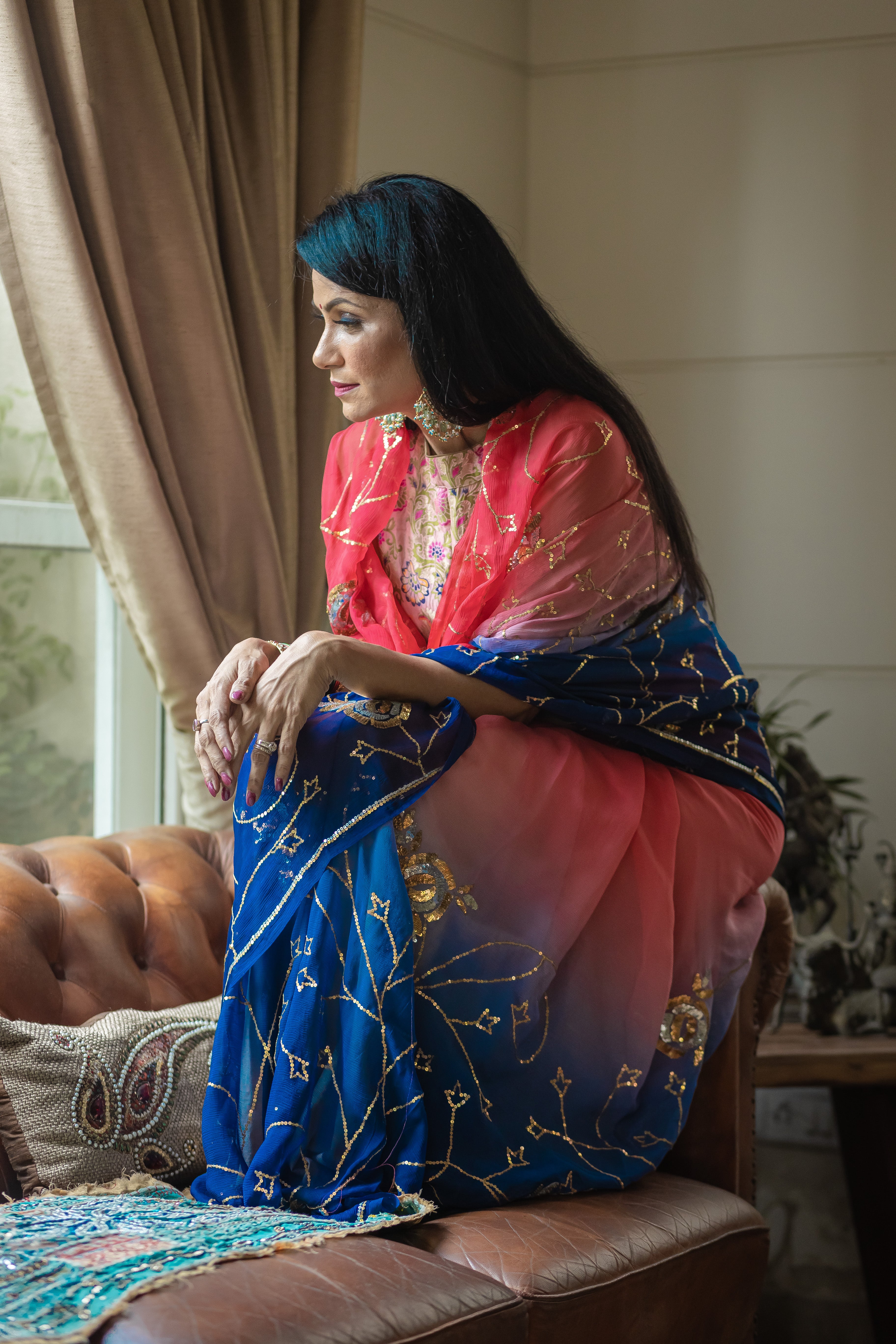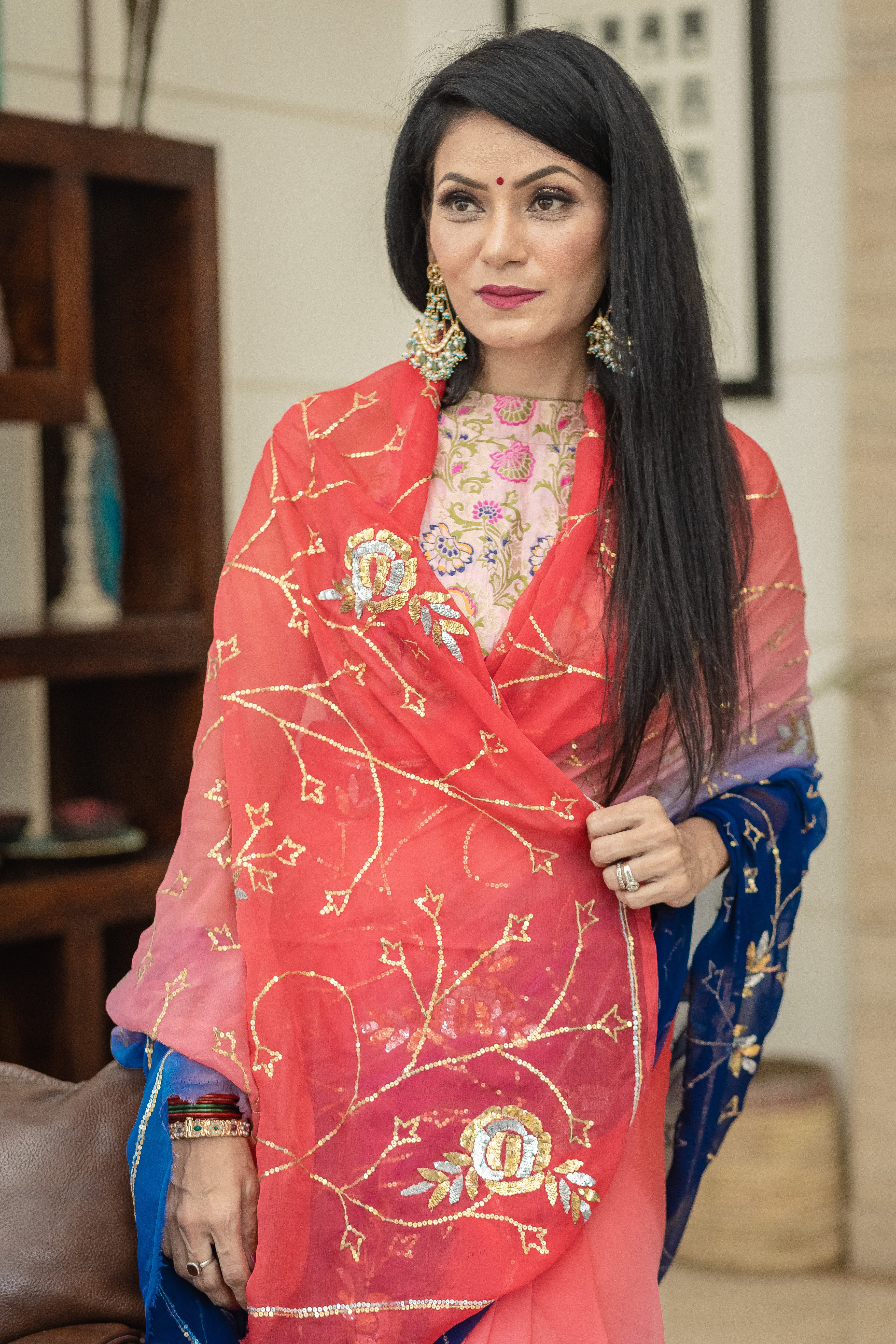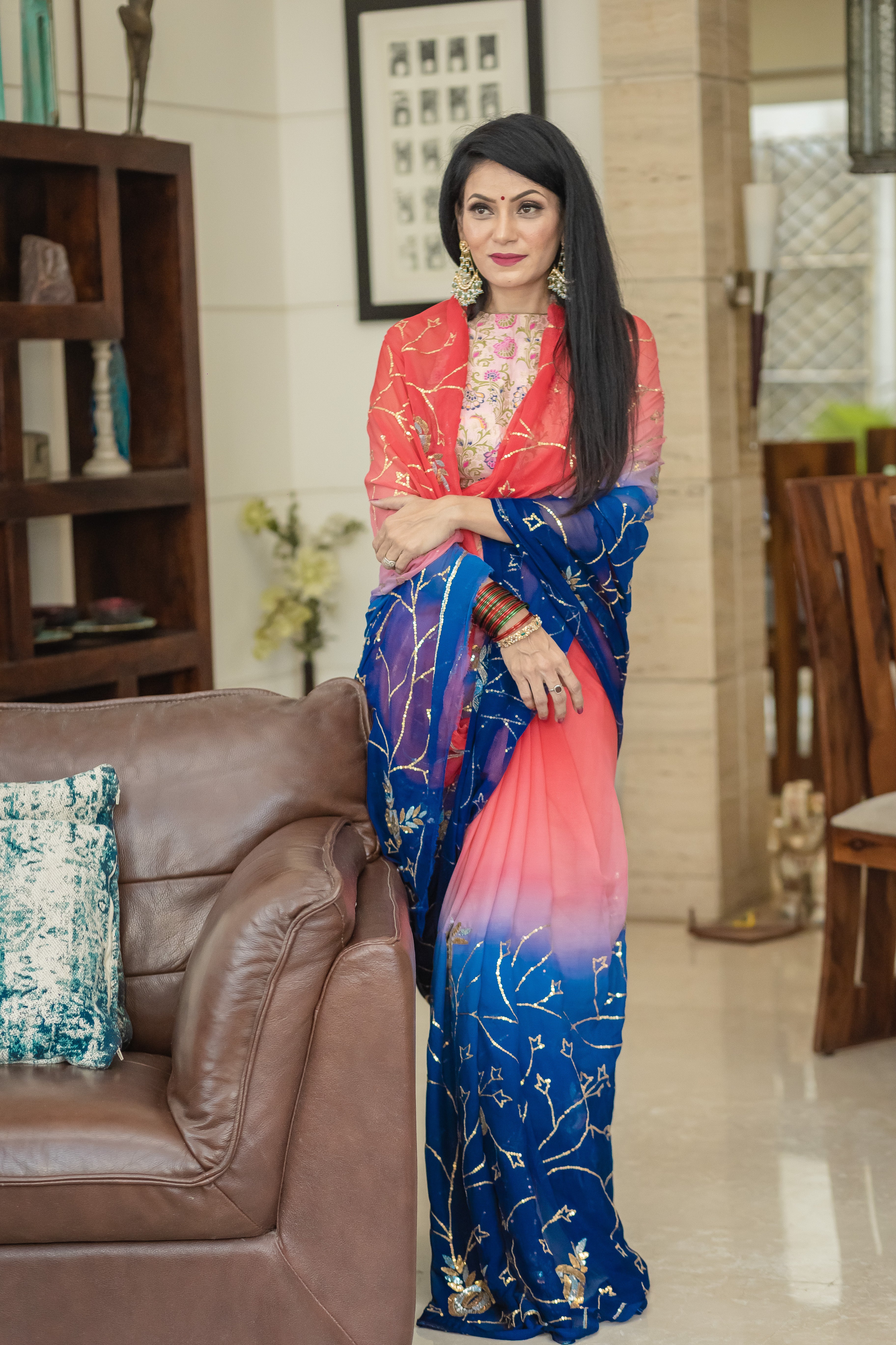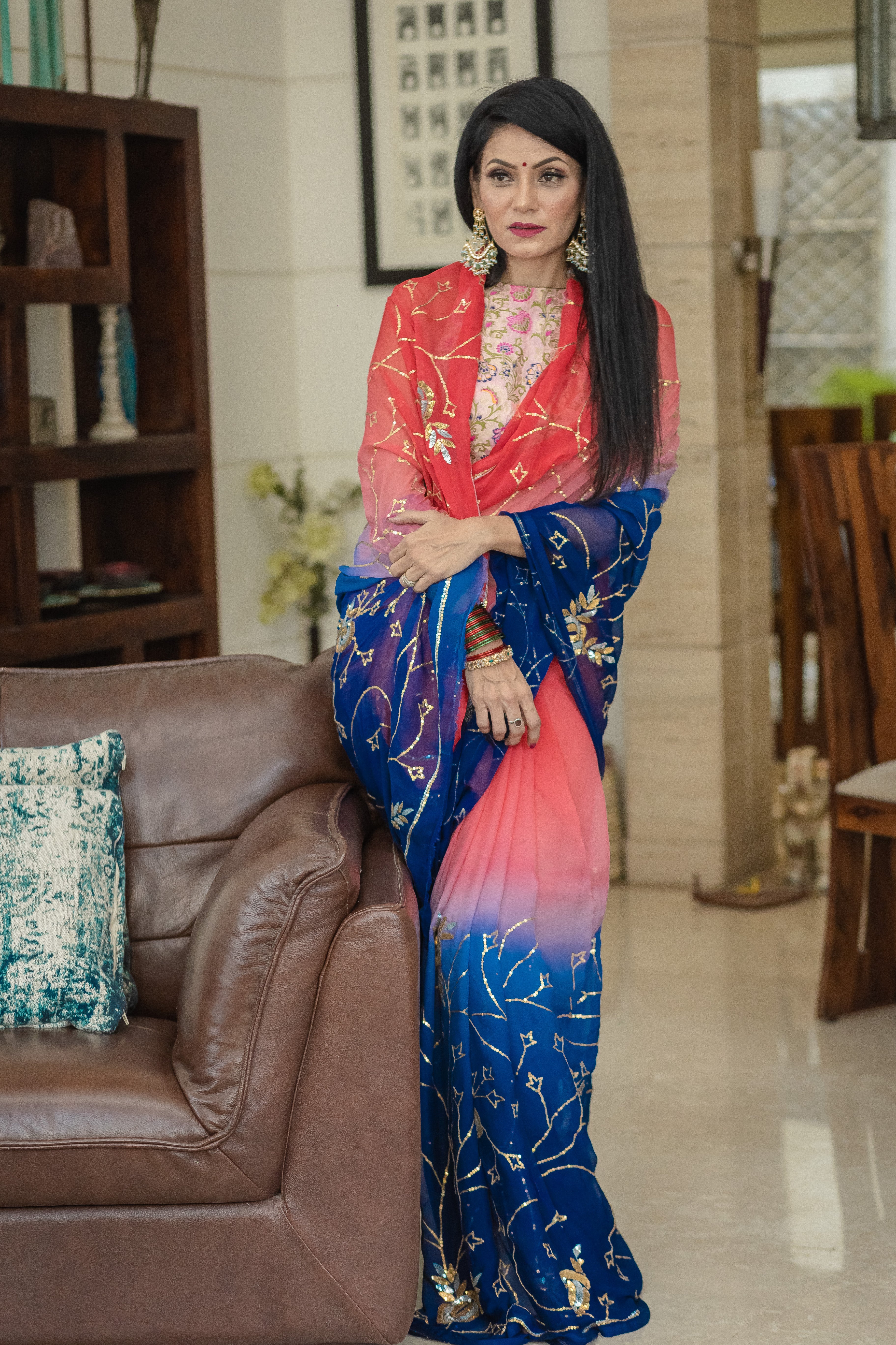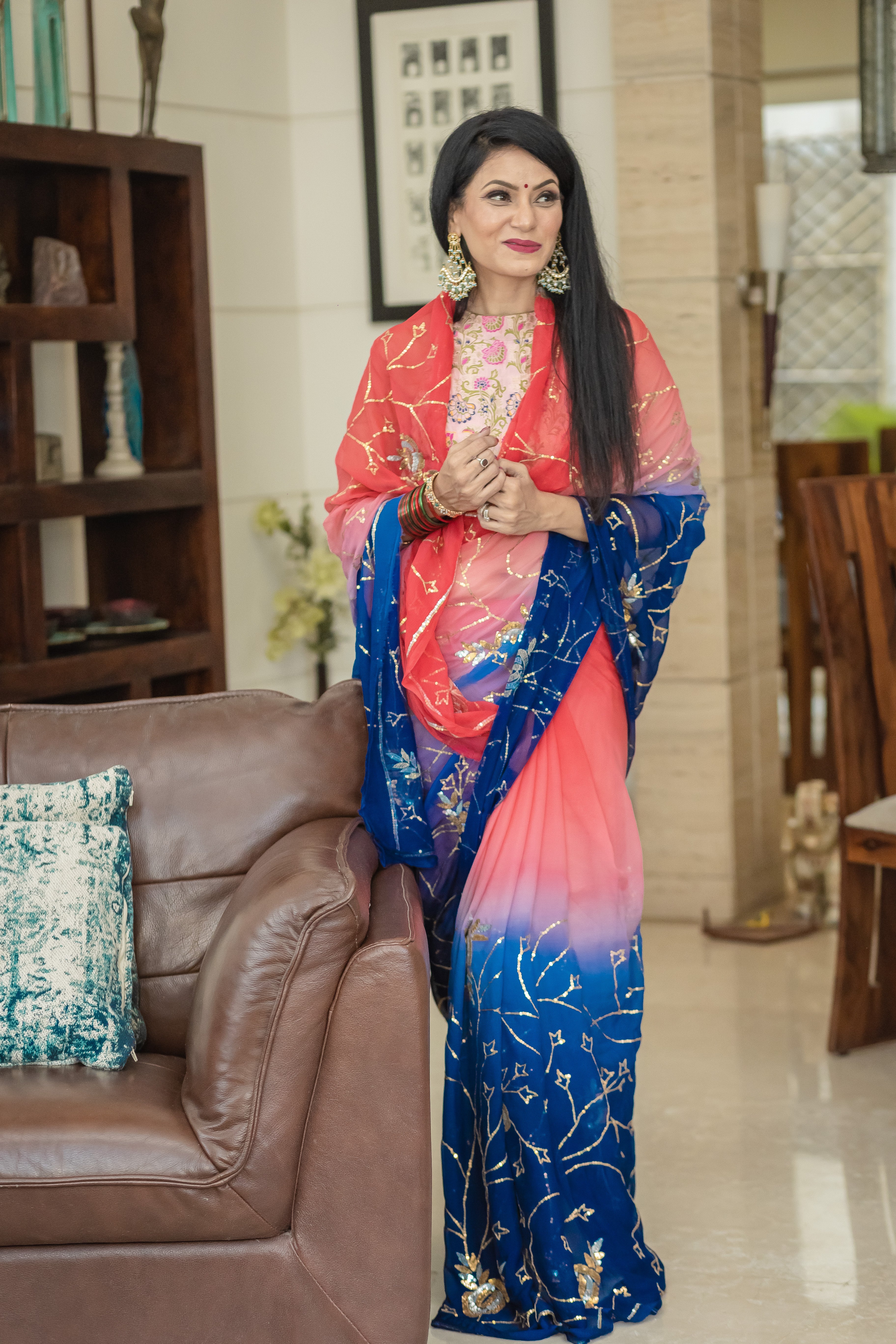 An ombre chiffon with the ganga jamuni sequins on the saree.
