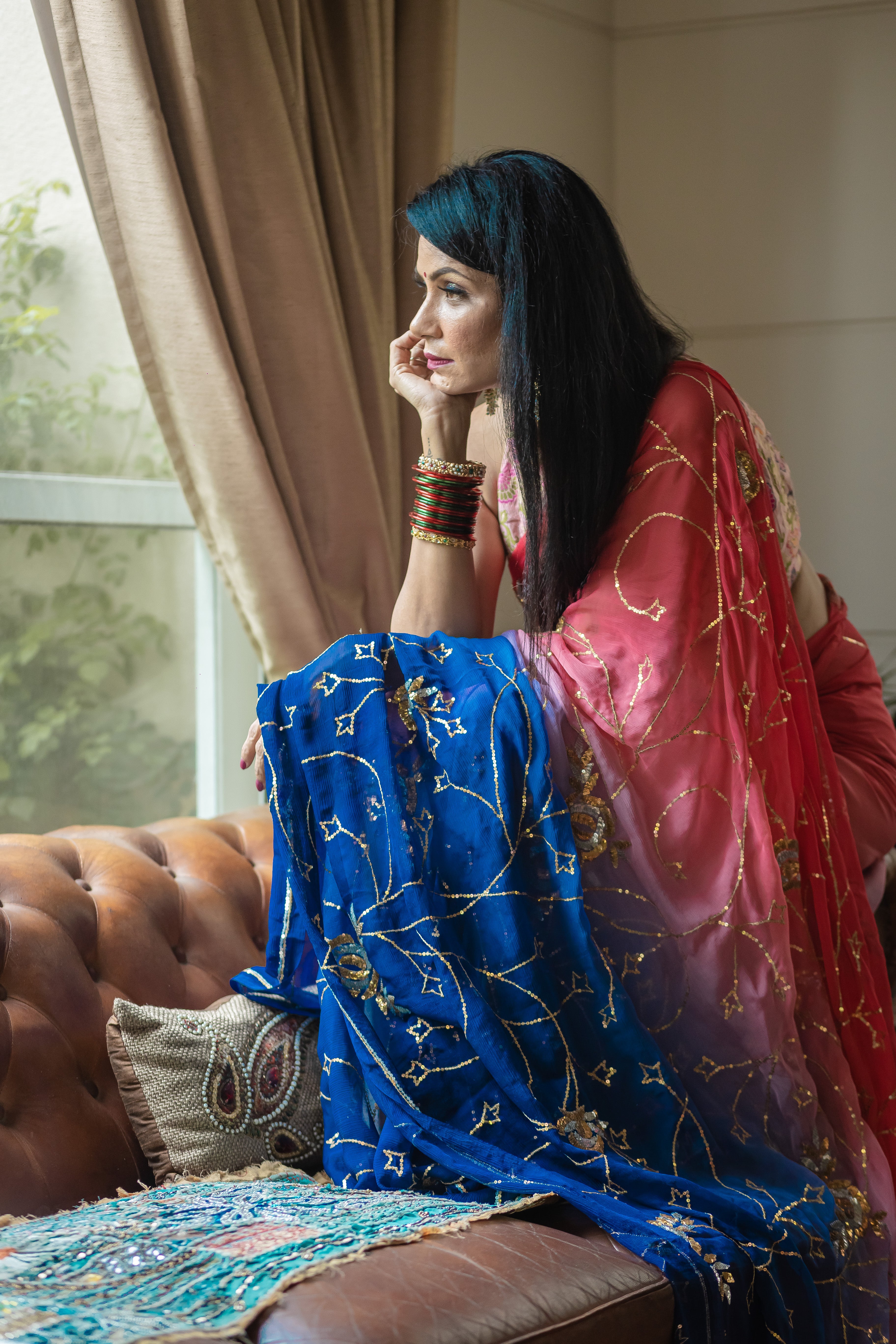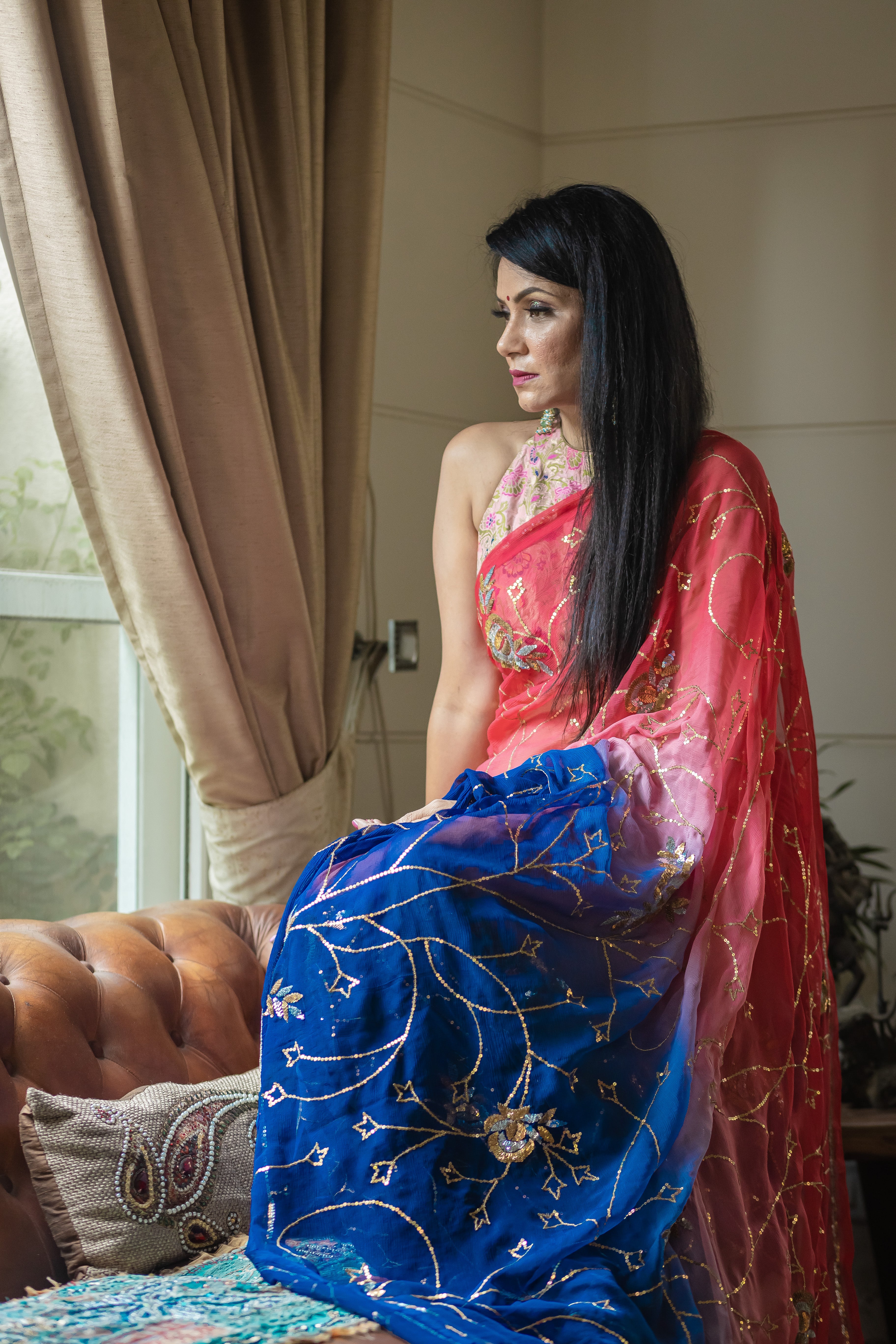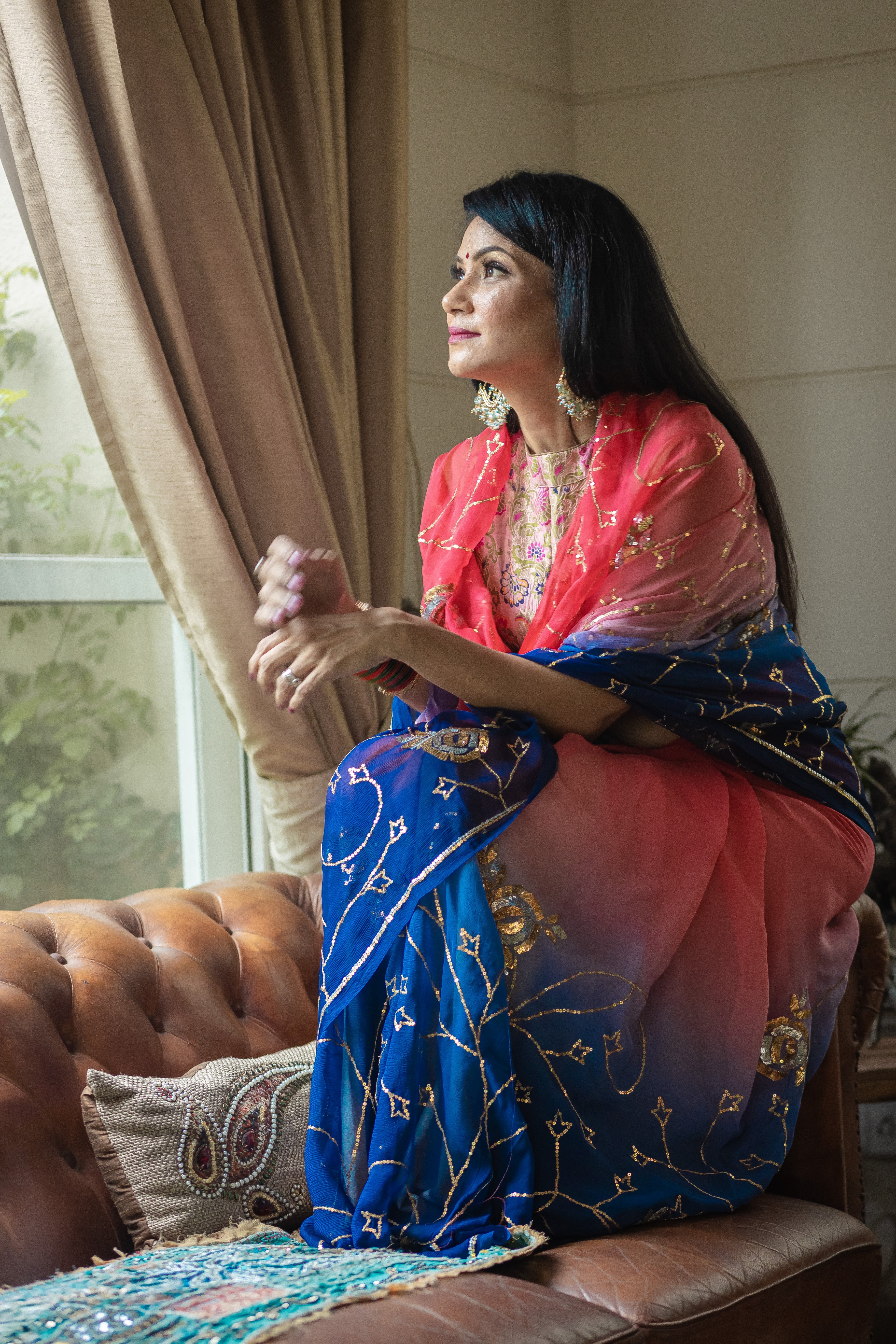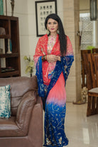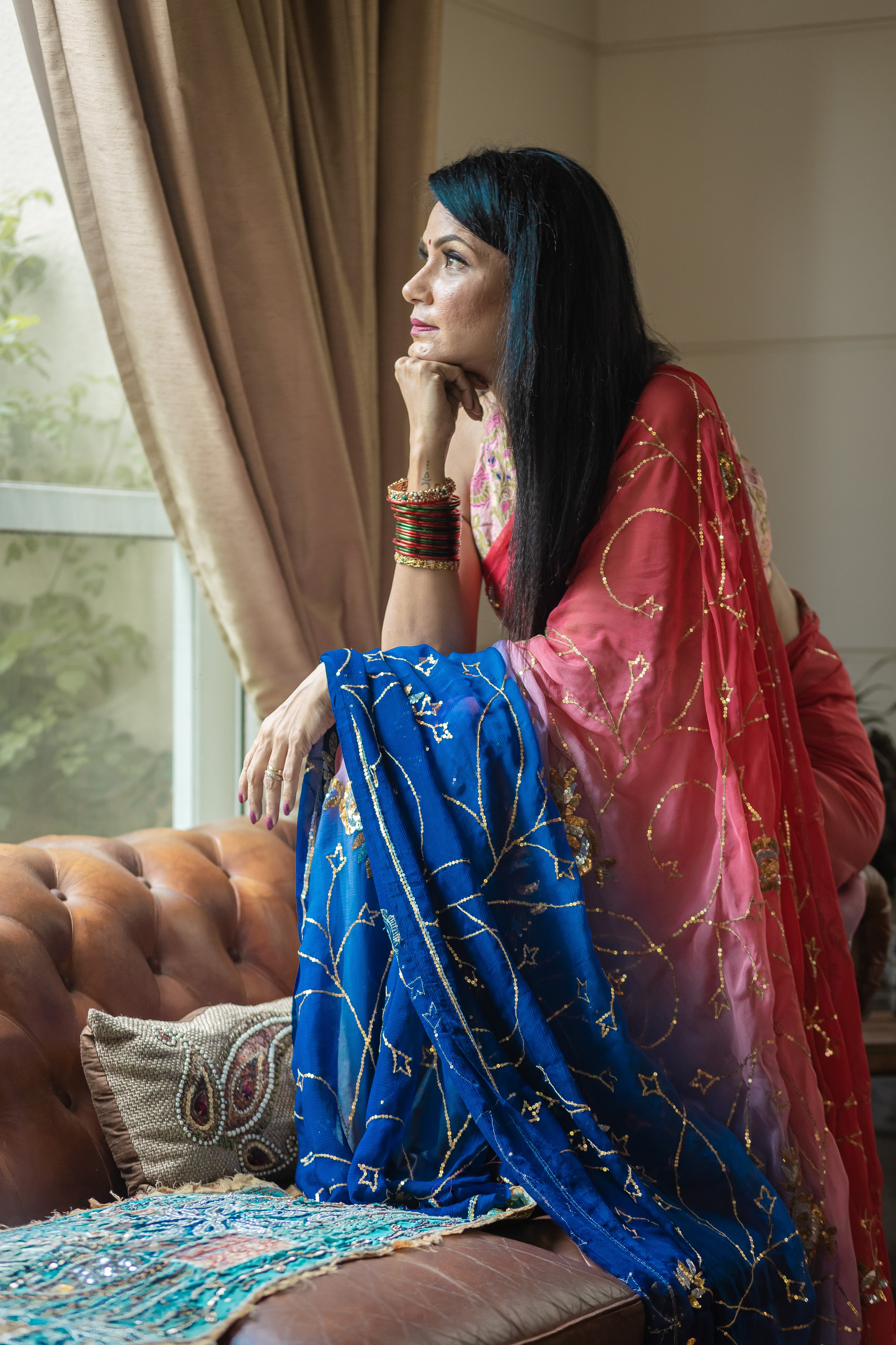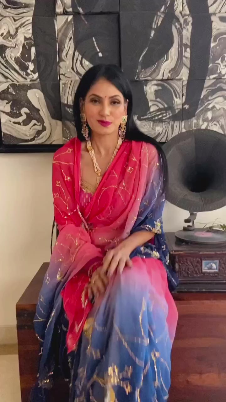 An ombre chiffon with the ganga jamuni sequins on the saree.