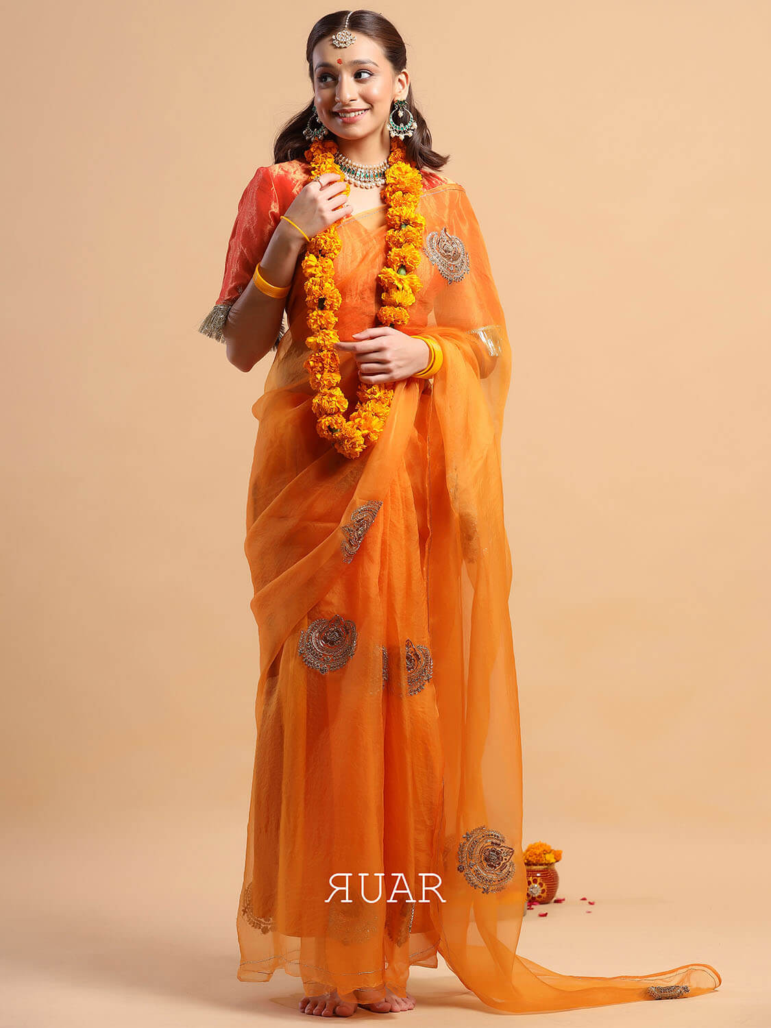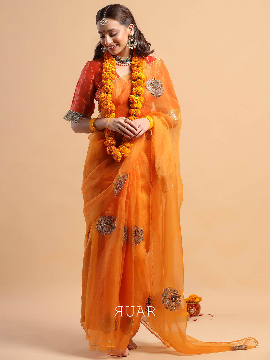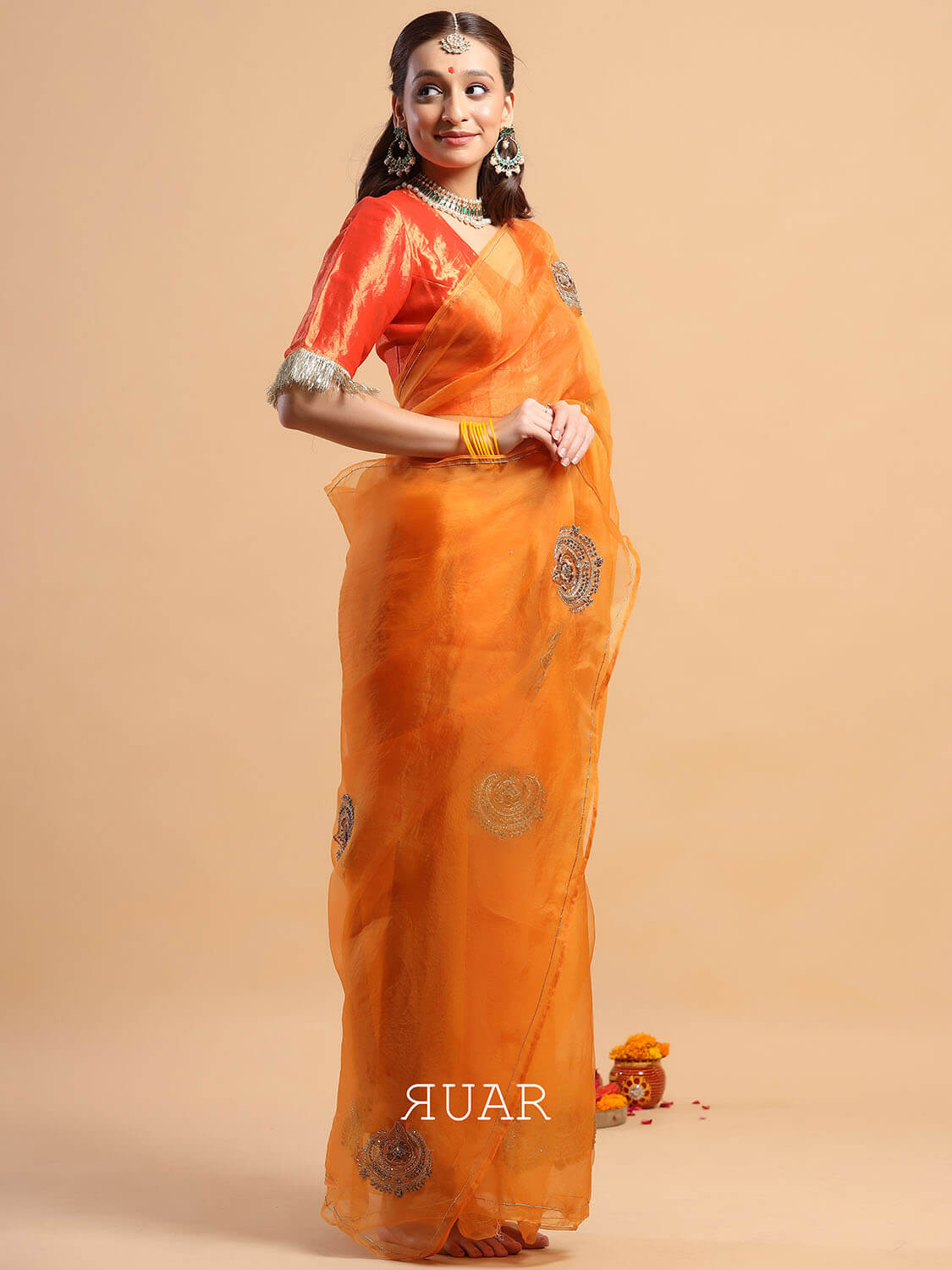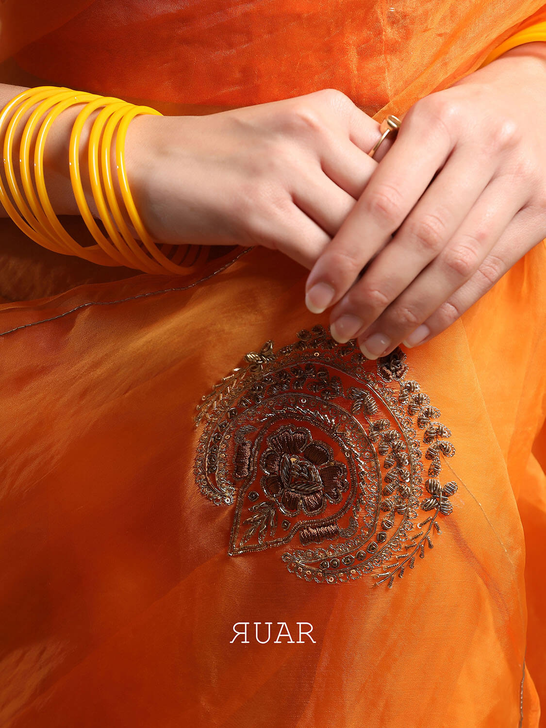 An elegant saffron coloured organza saree with beautiful chand tara motif embroidered in antique zardozi.