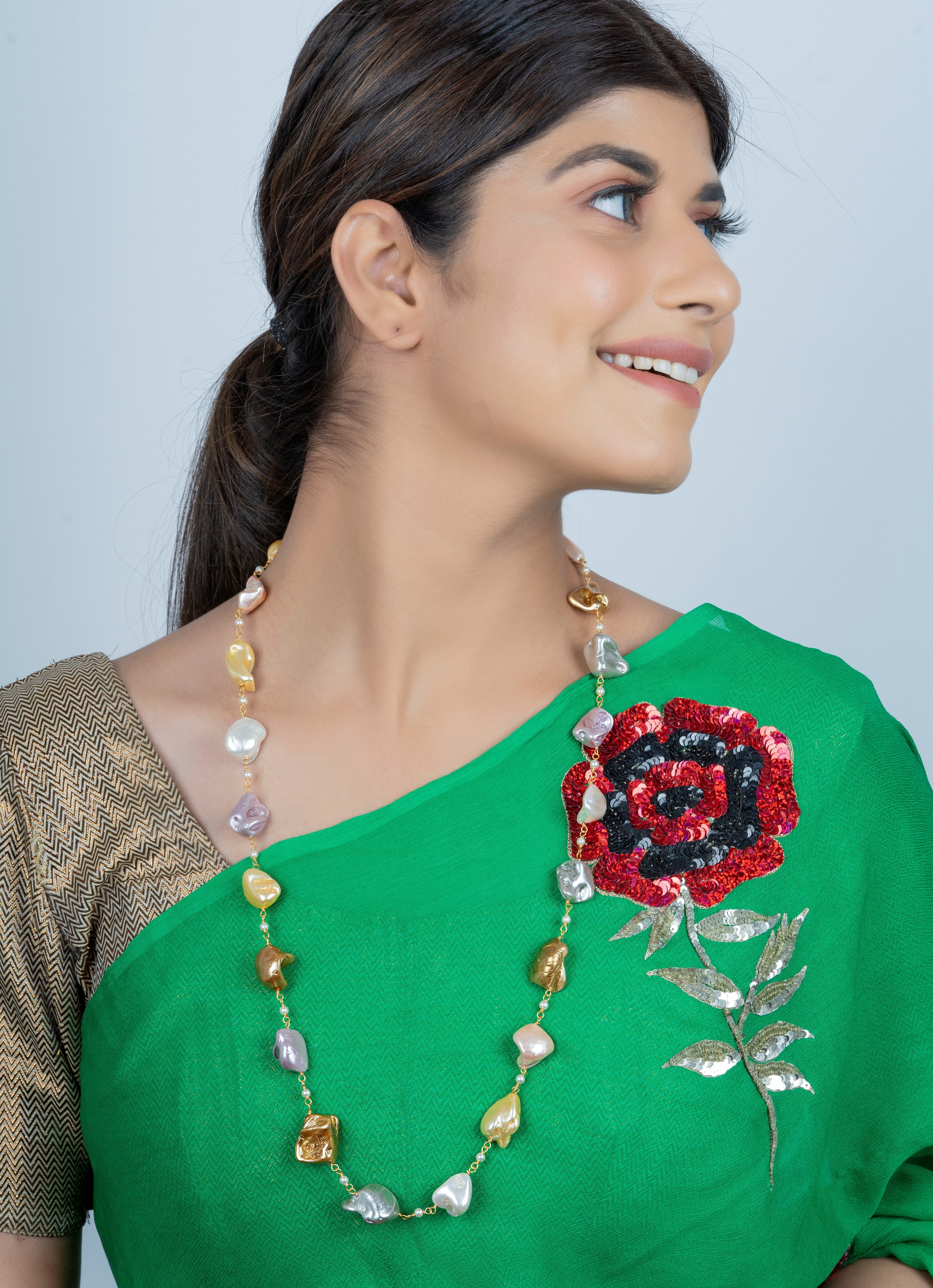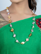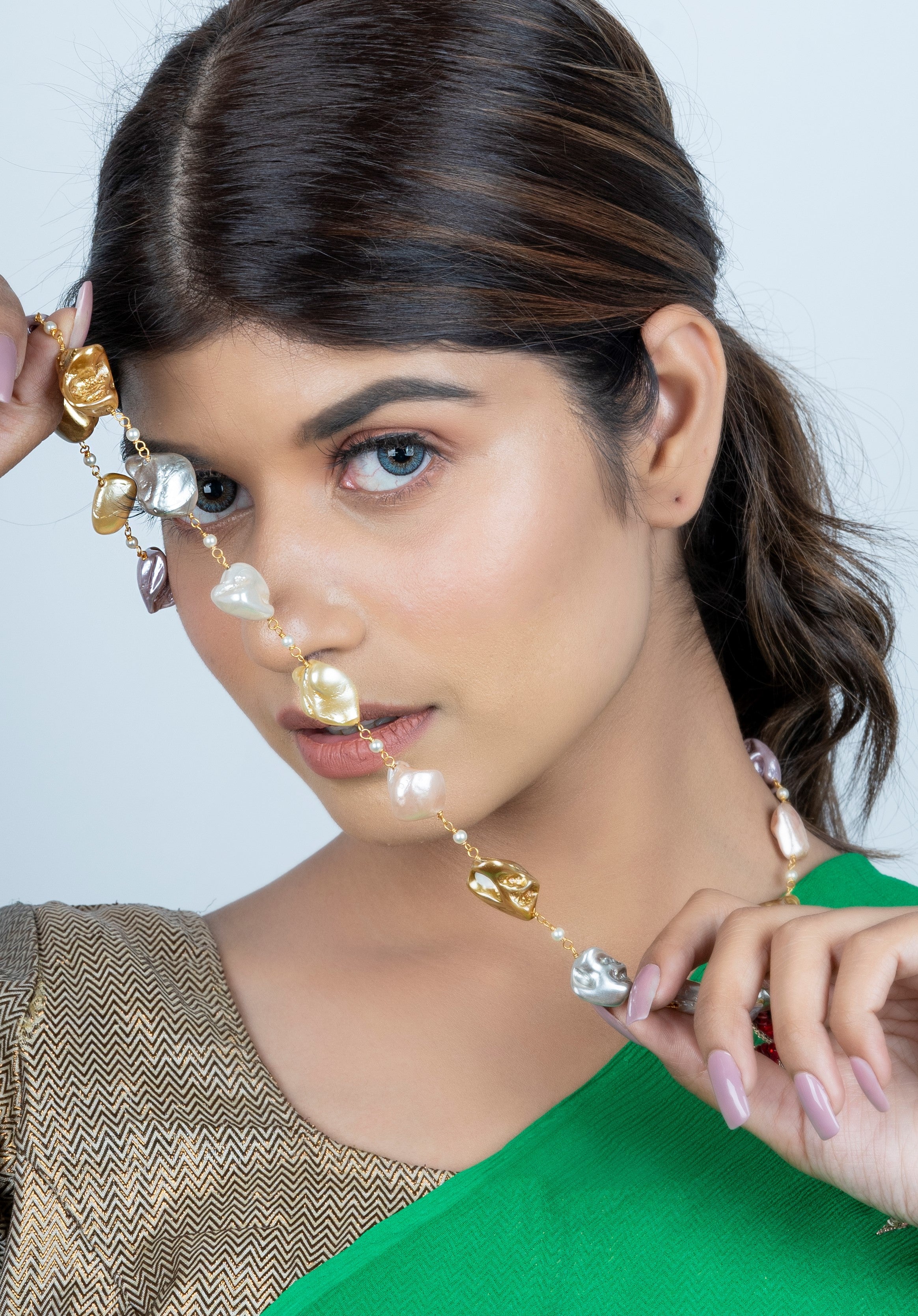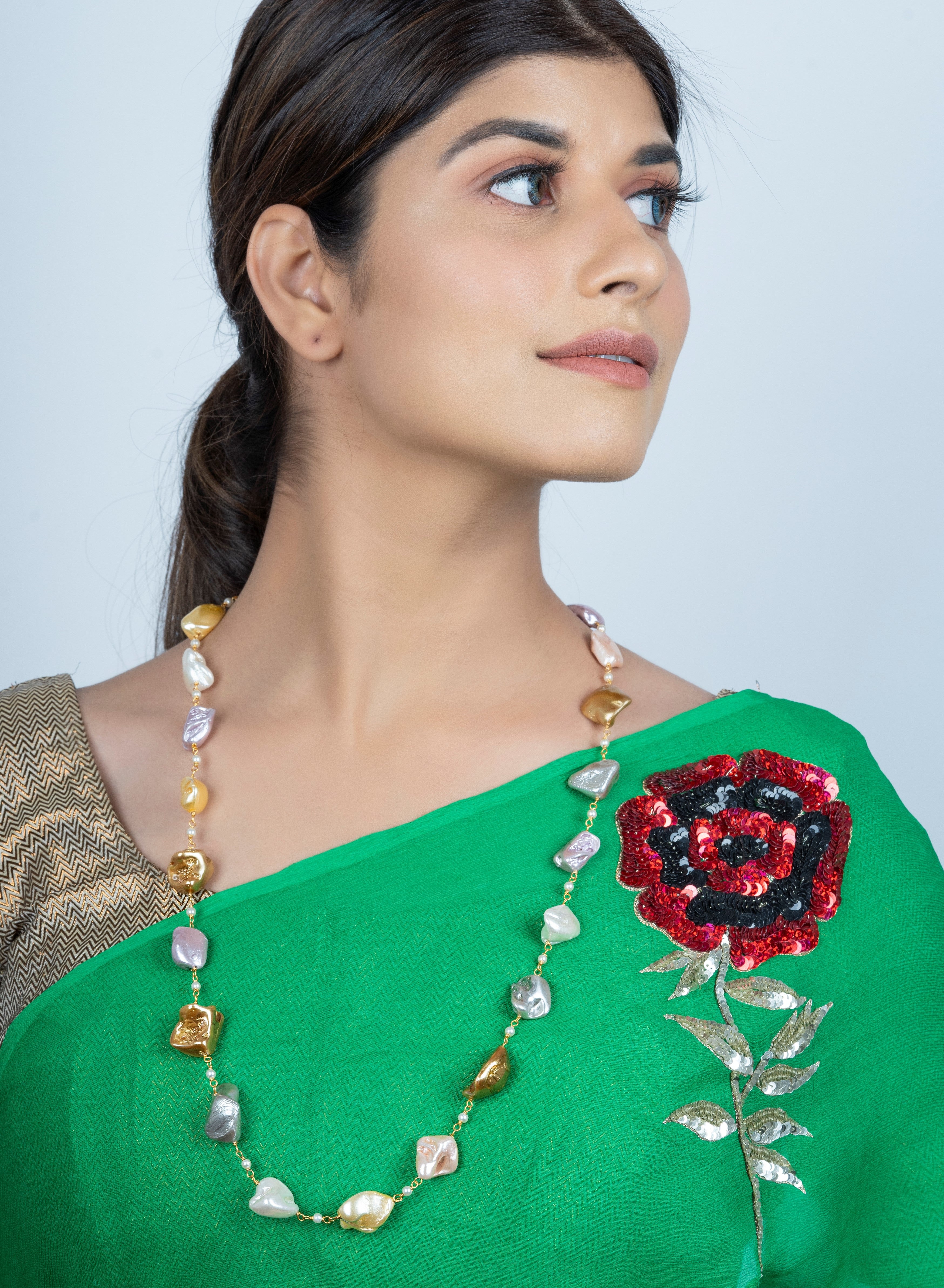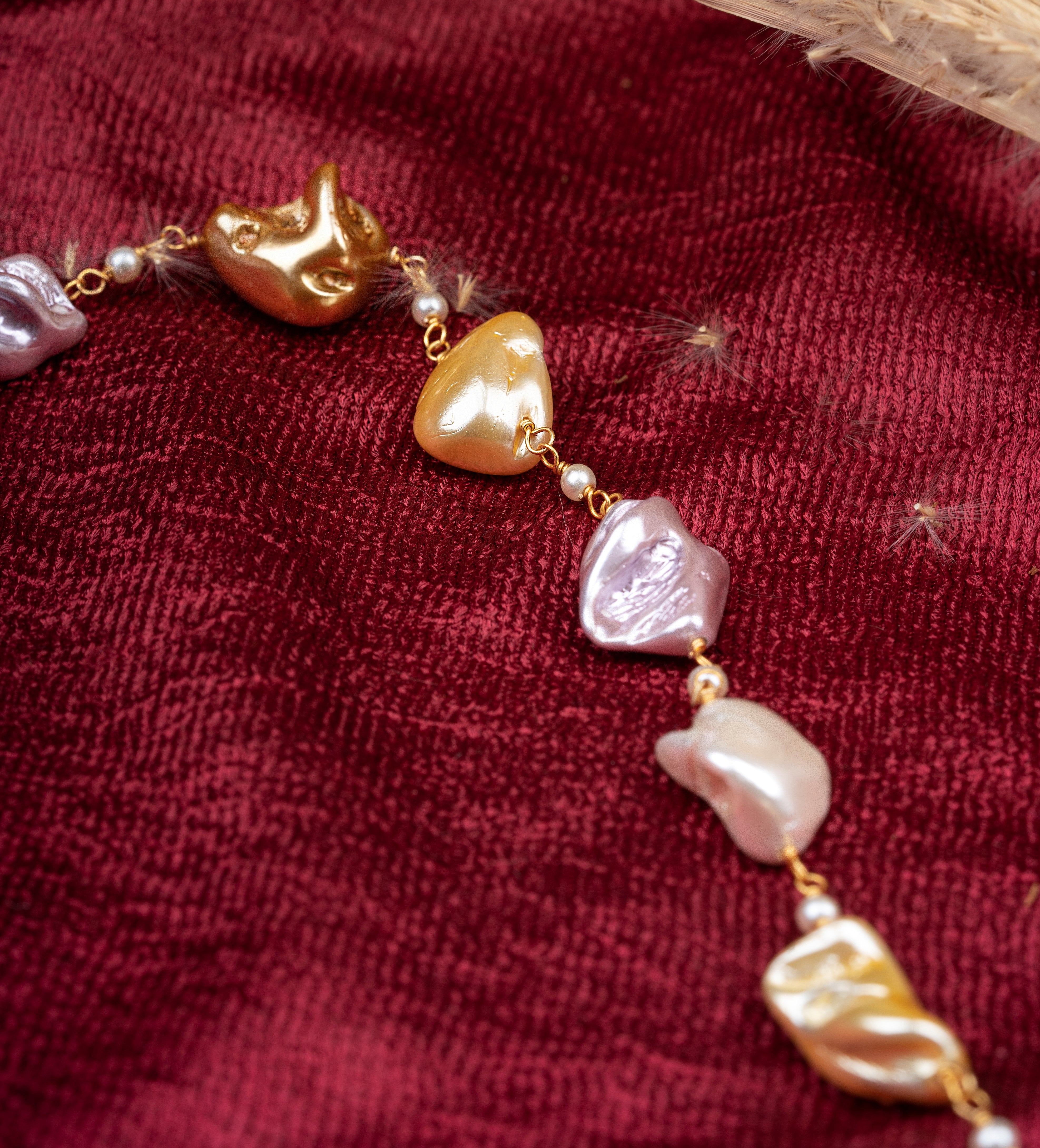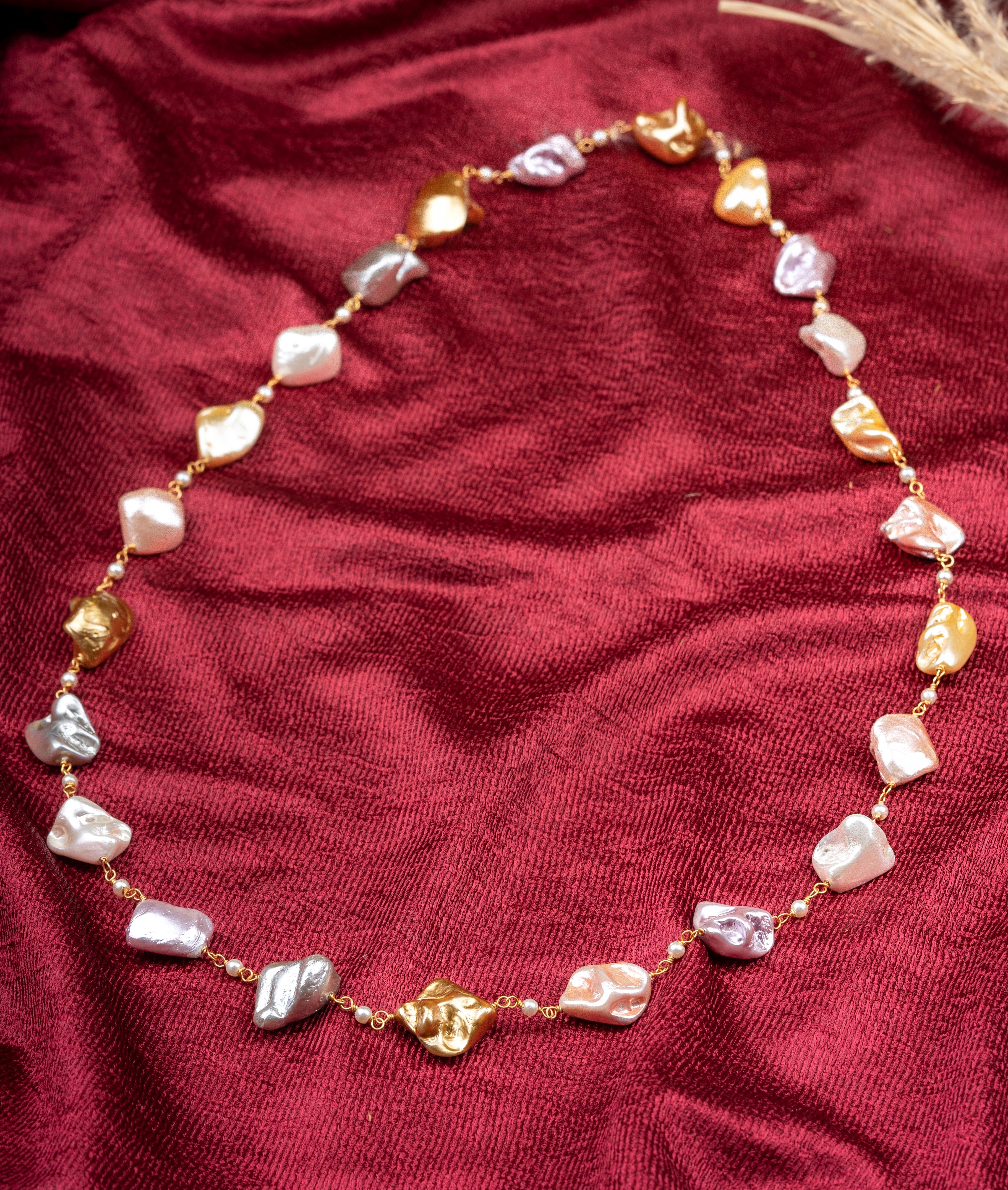 Gold-plated three color pearl-beaded single-stranded handcrafted necklace, secured with an adjustable fastening.