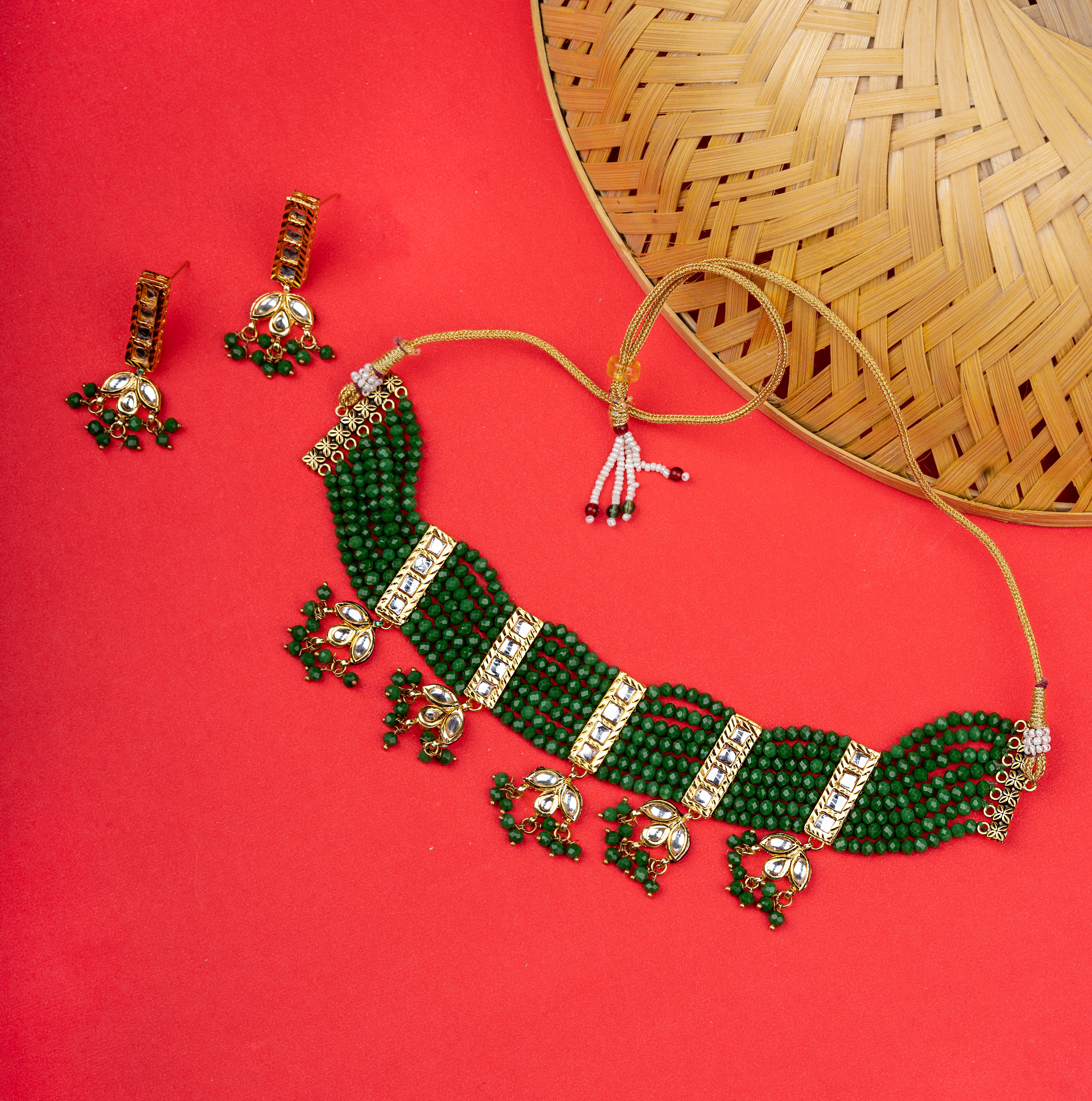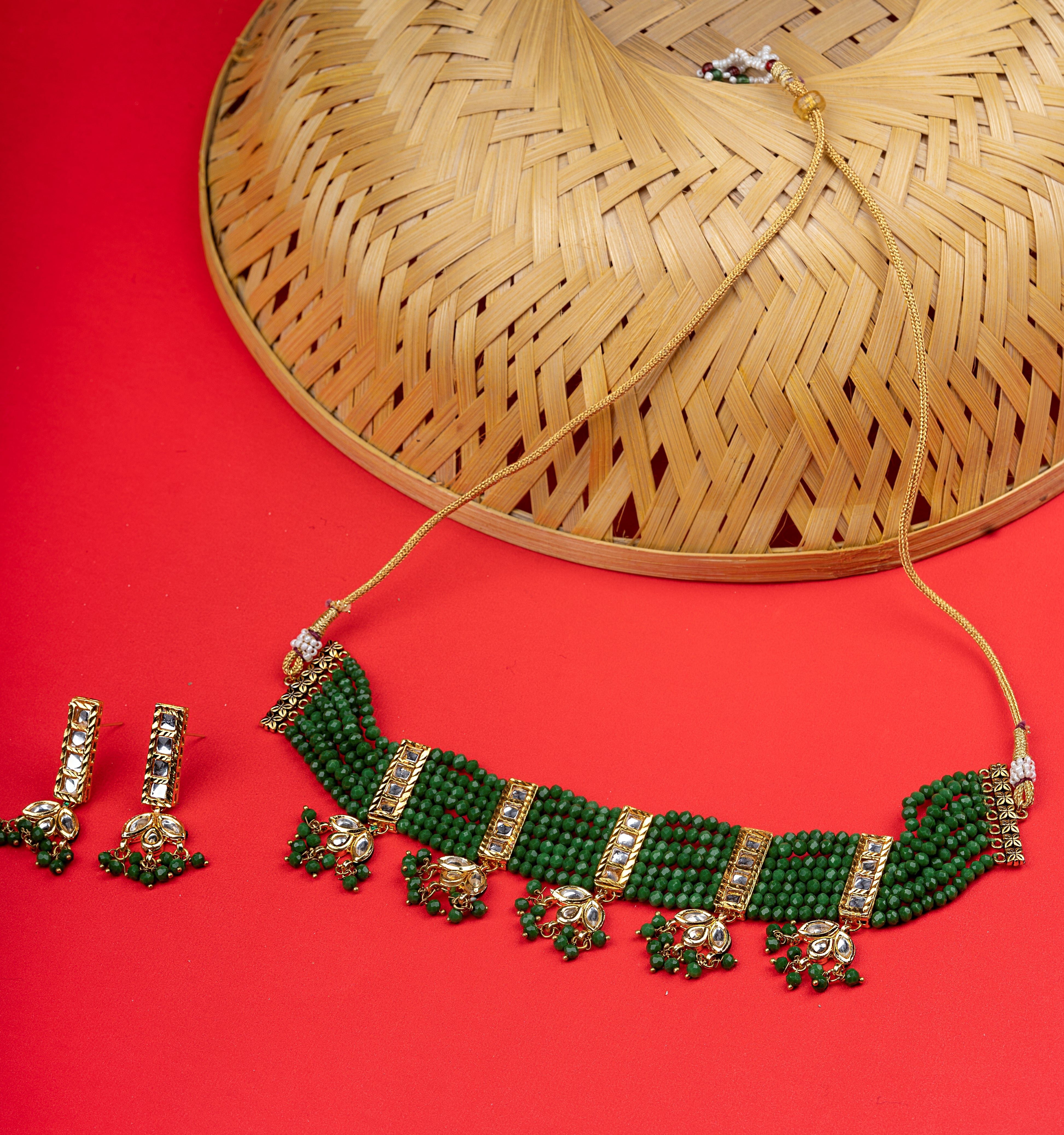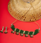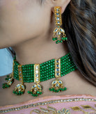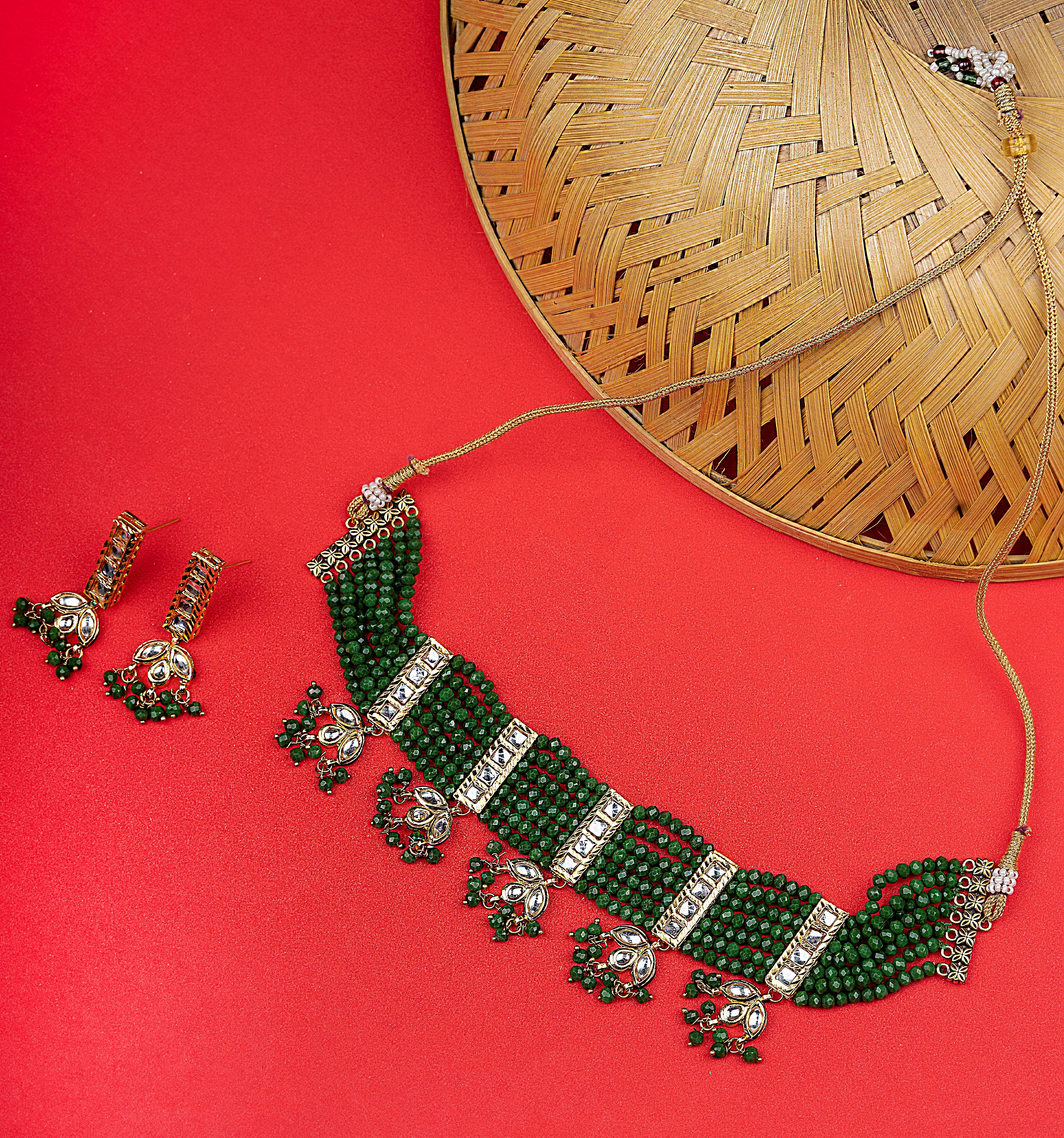 Green and Gold-plated stone and beads studded choker necklace, secured by drawstring closure