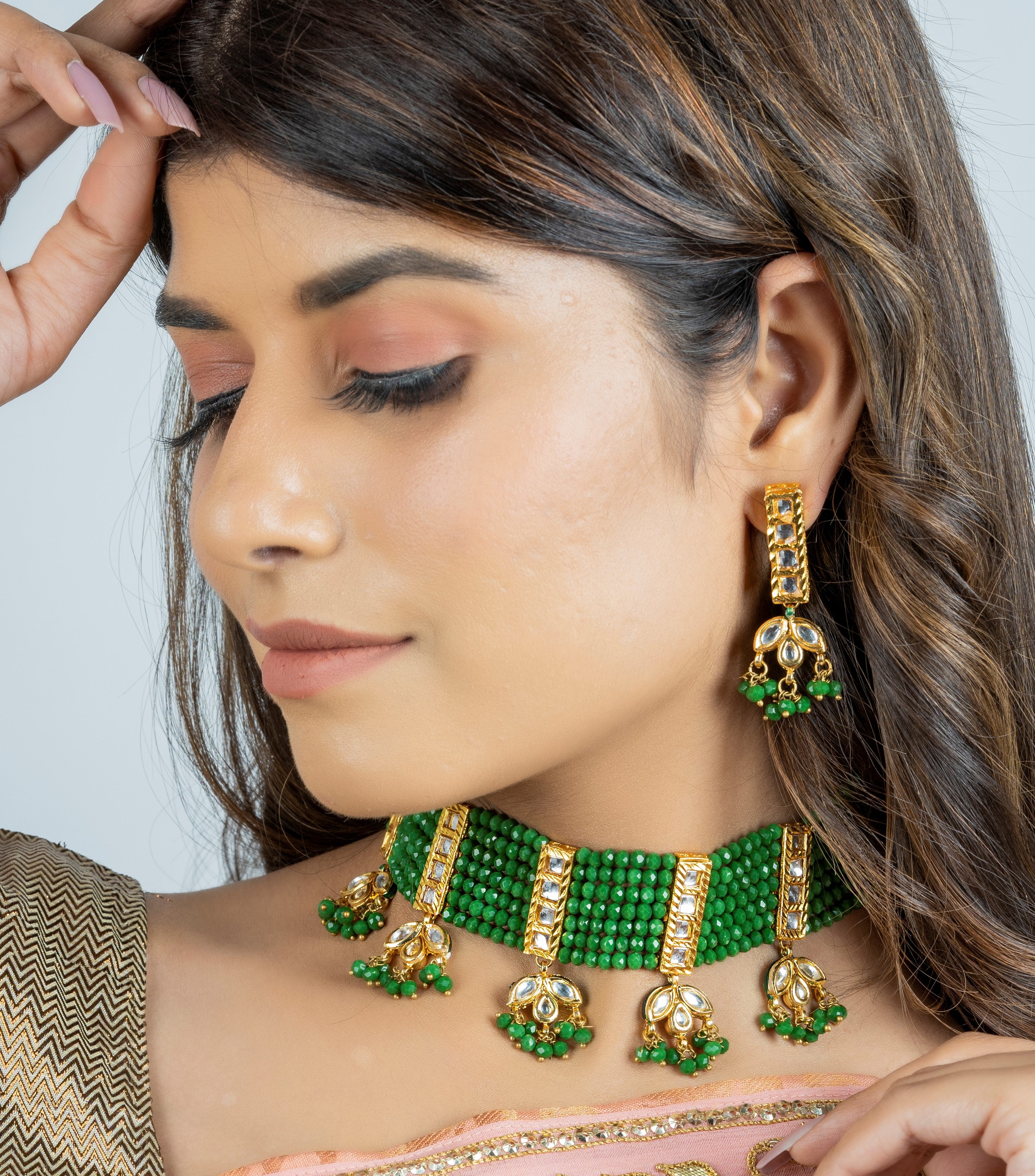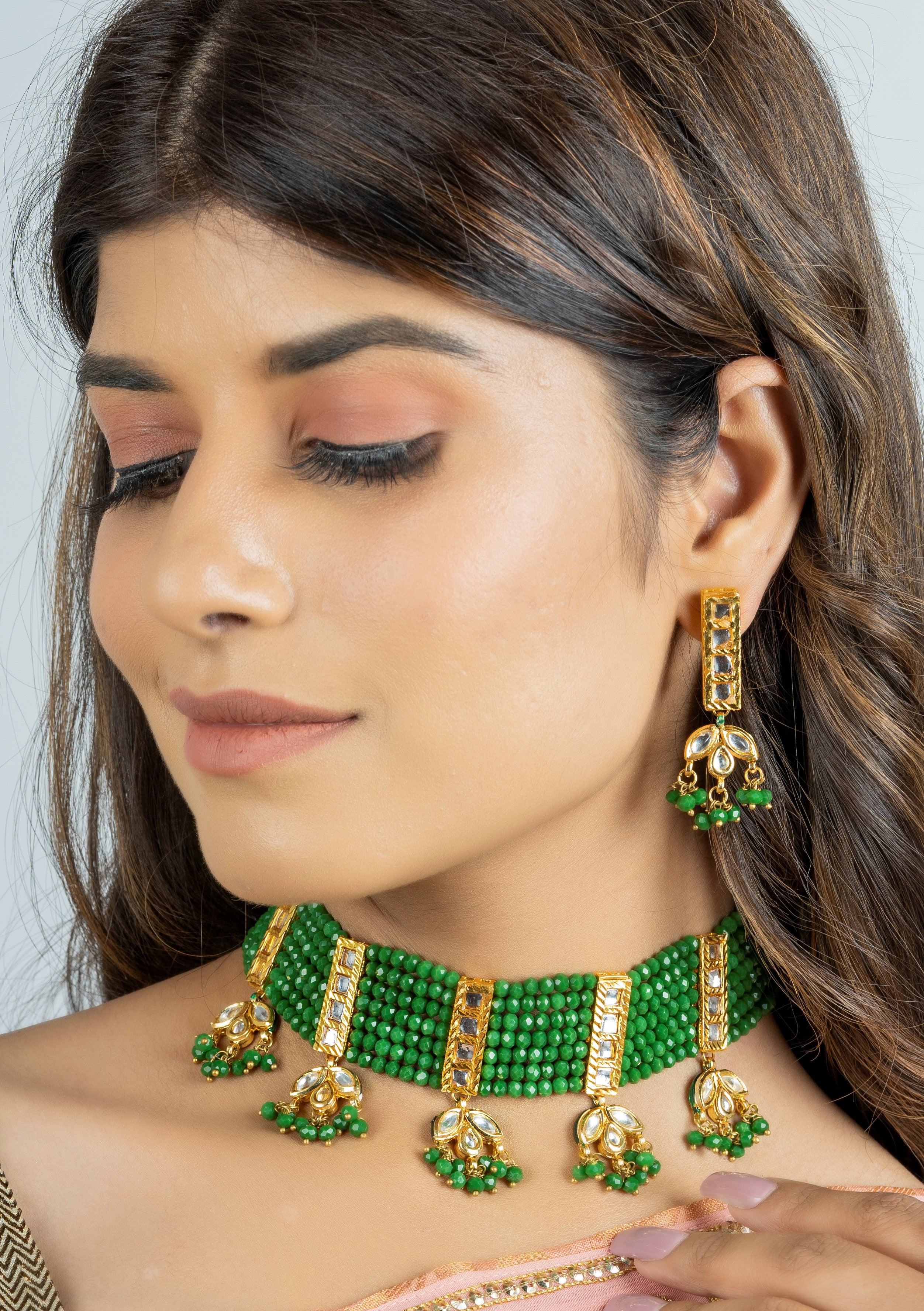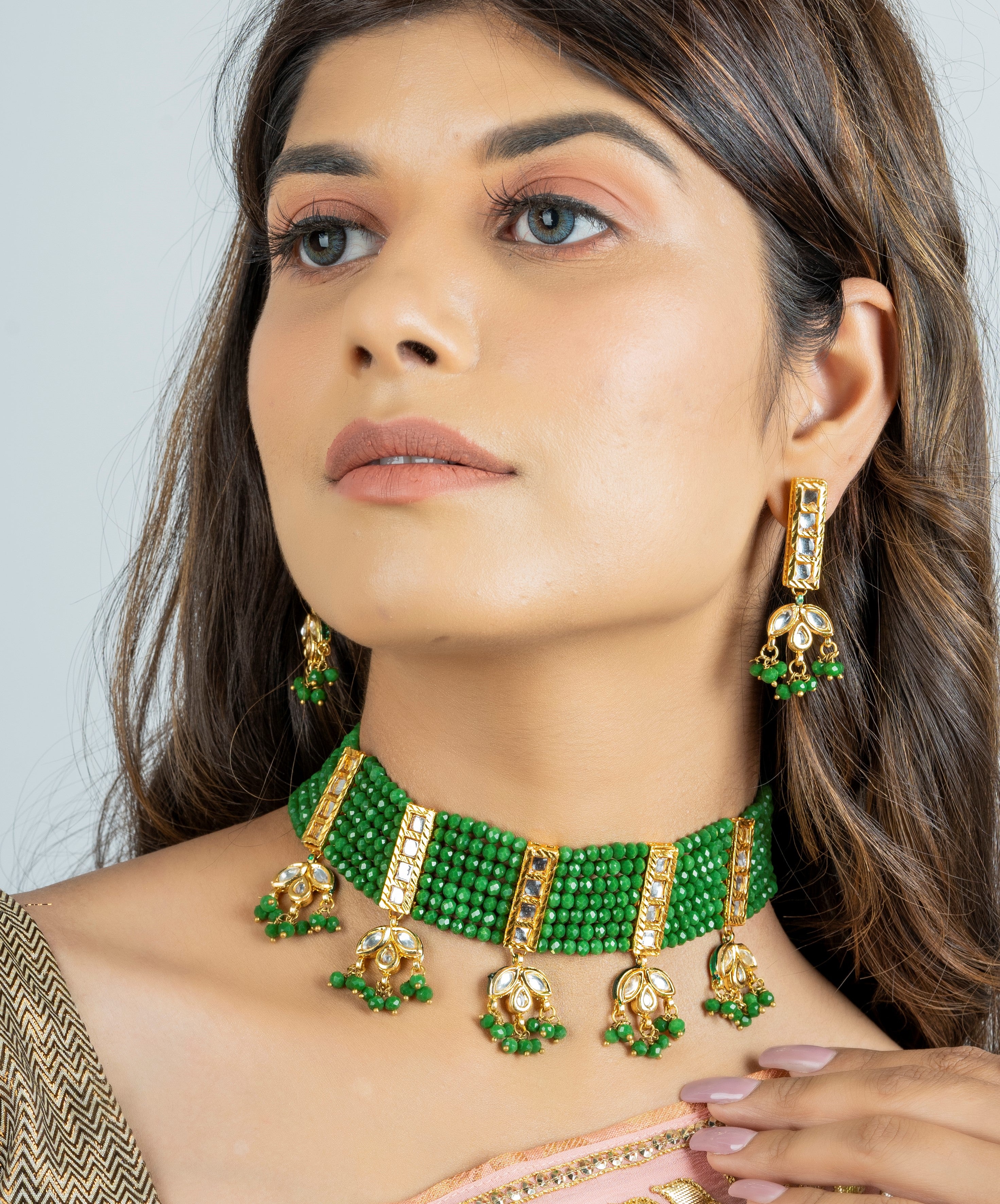 Green and Gold-plated stone and beads studded choker necklace, secured by drawstring closure