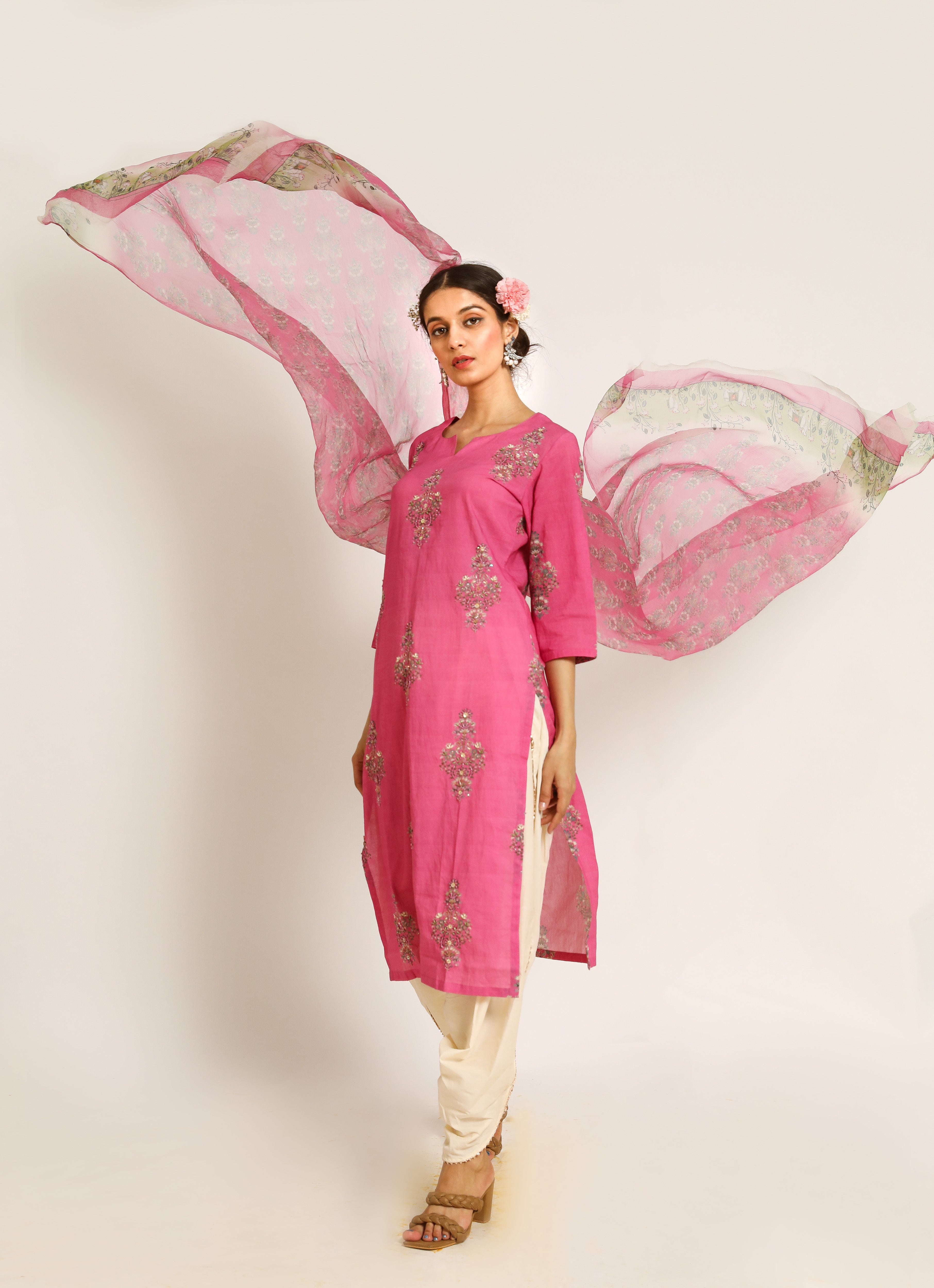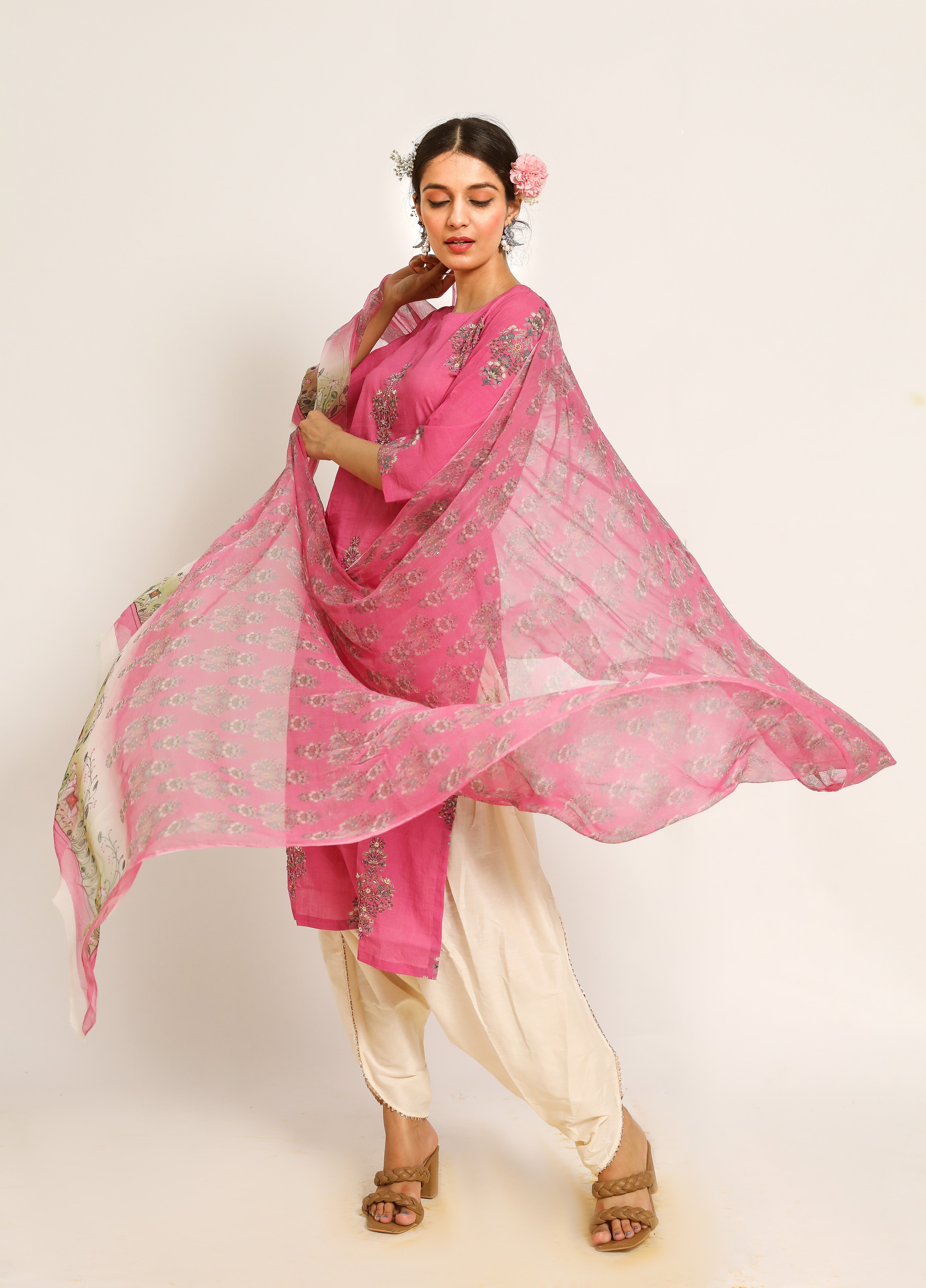 A printed votton kurta and chiffon dupatta set paired with dhoti cotton pants.