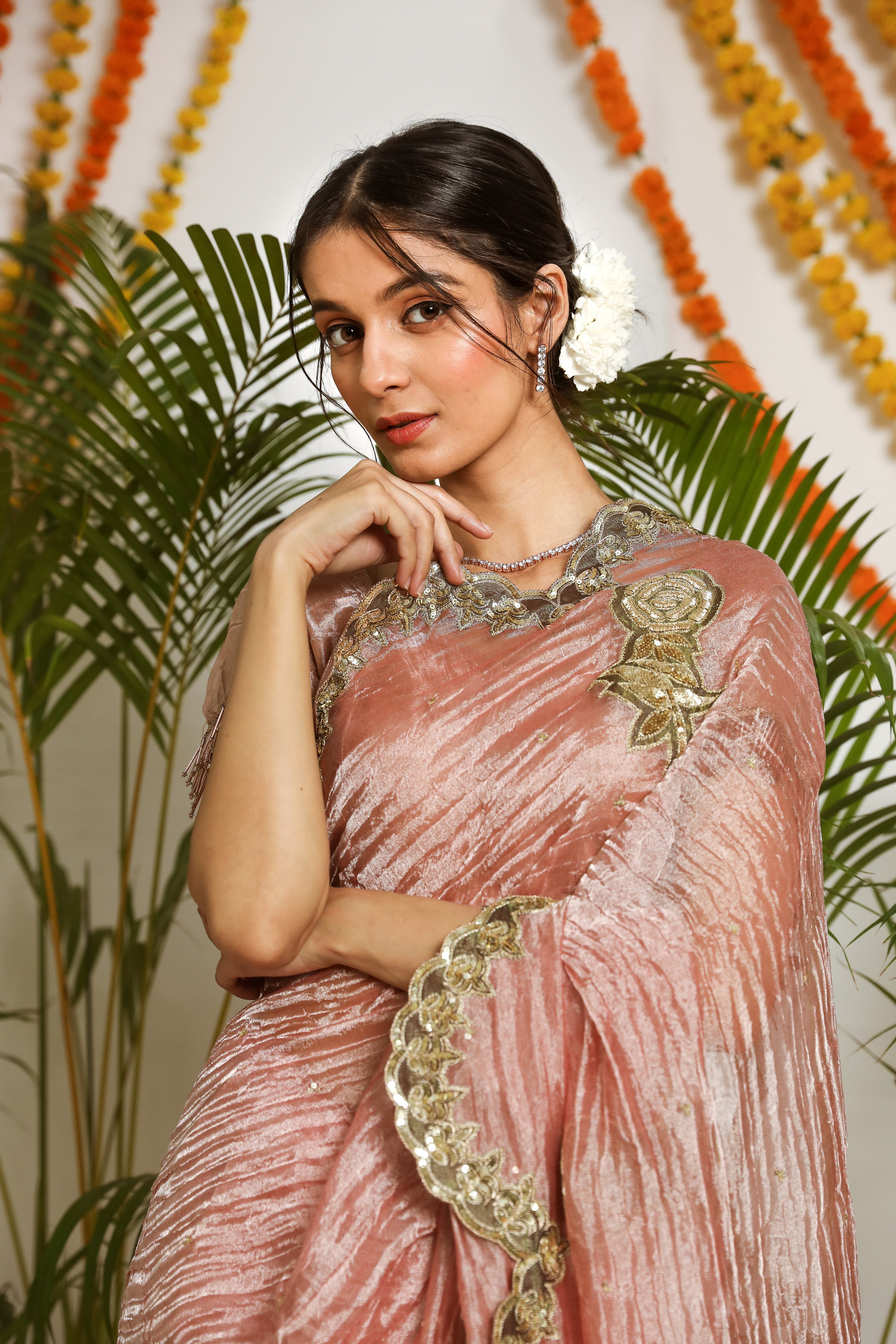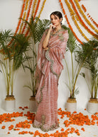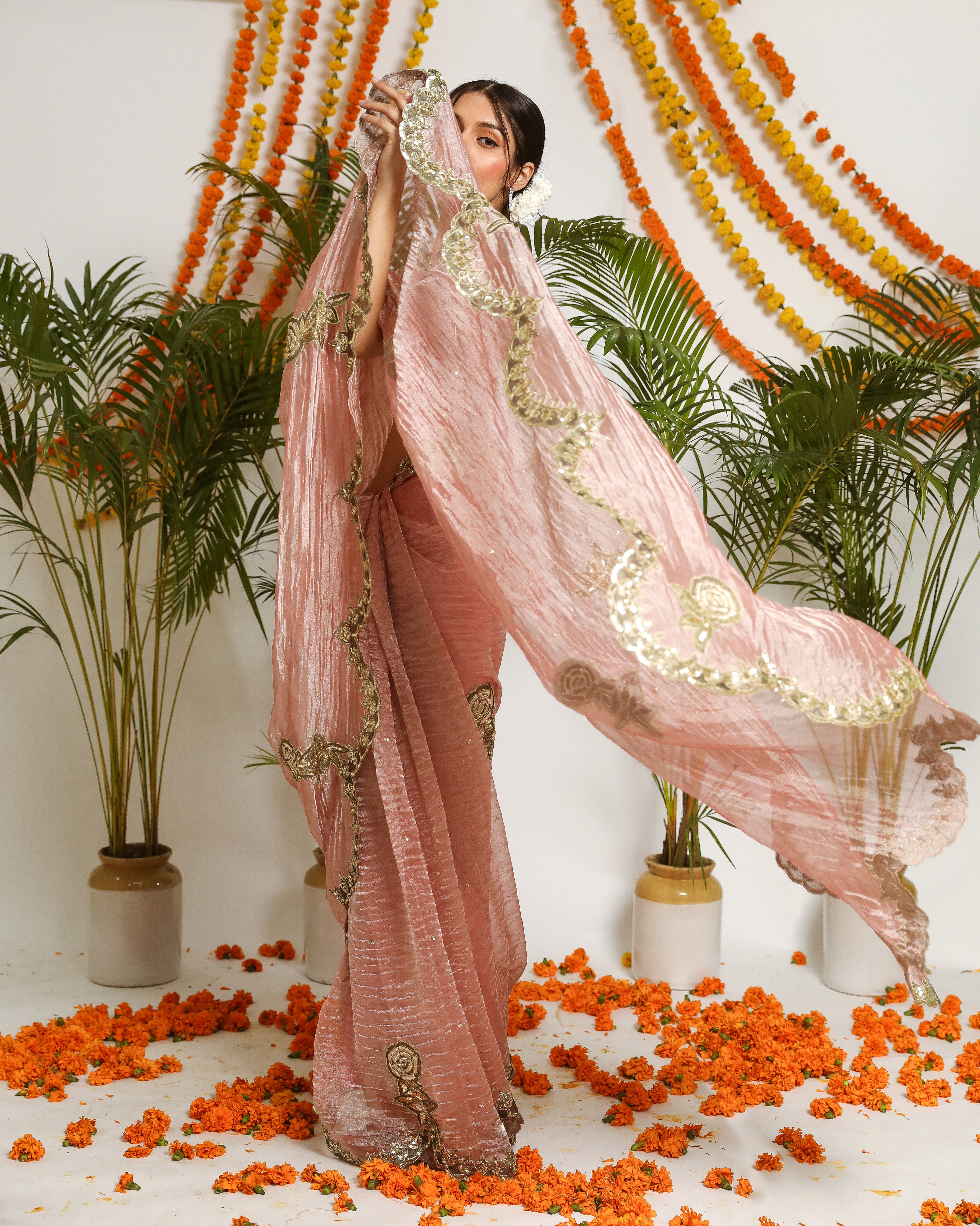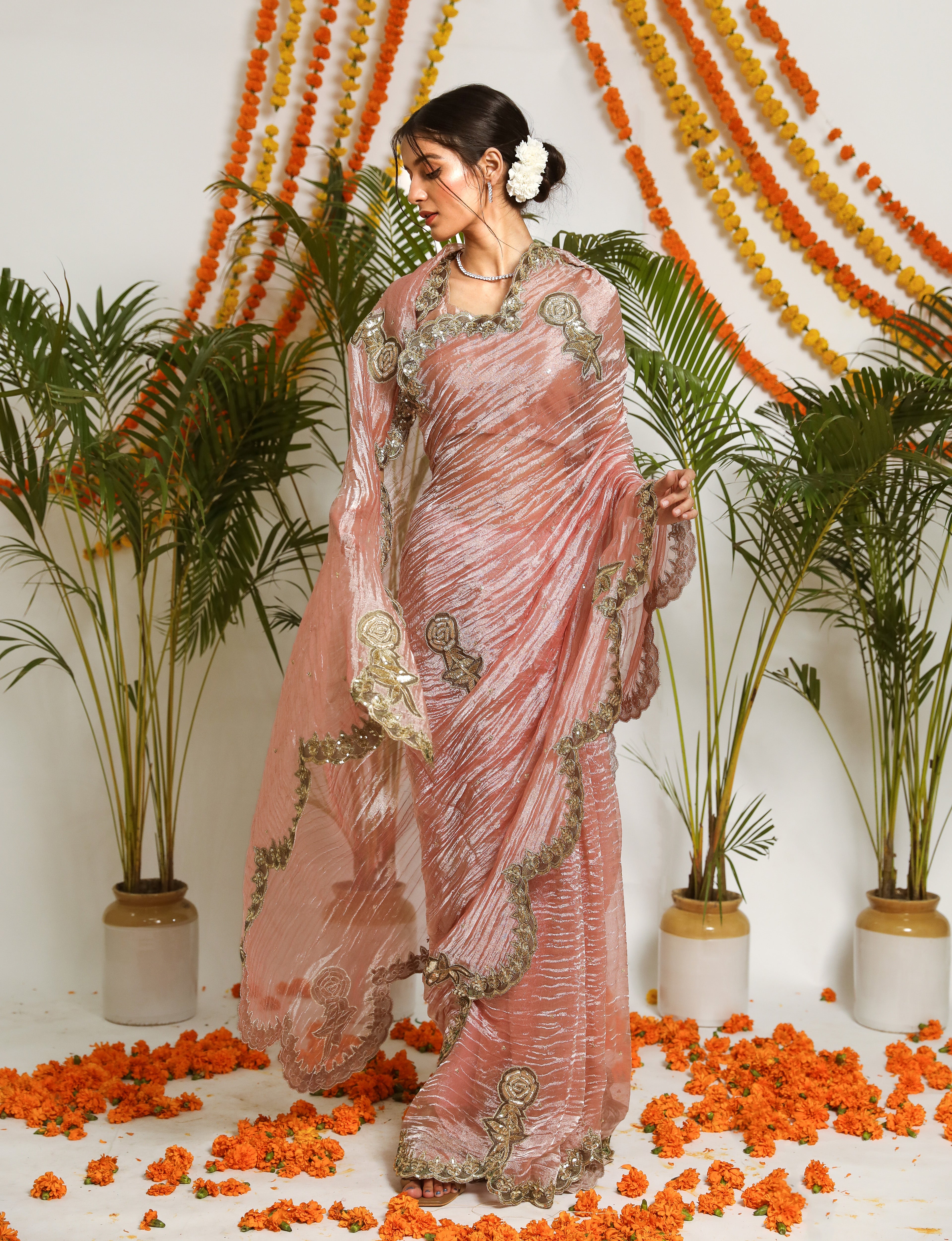 Our new rose colored silk tissue saree with zardosi roses handcrafted as patchwork. The saree comes with a stitched blouse as shown on model.