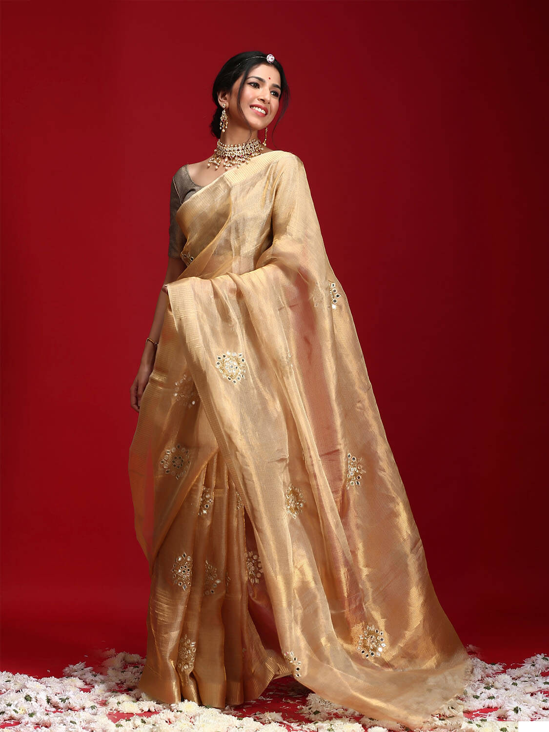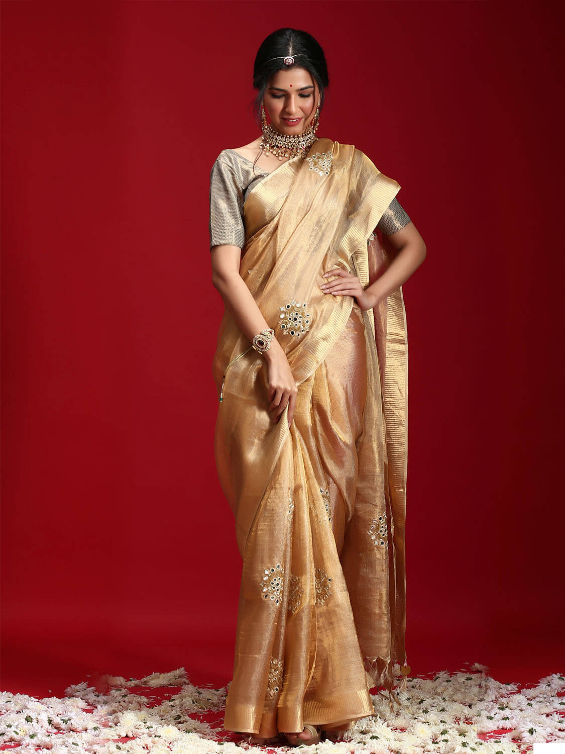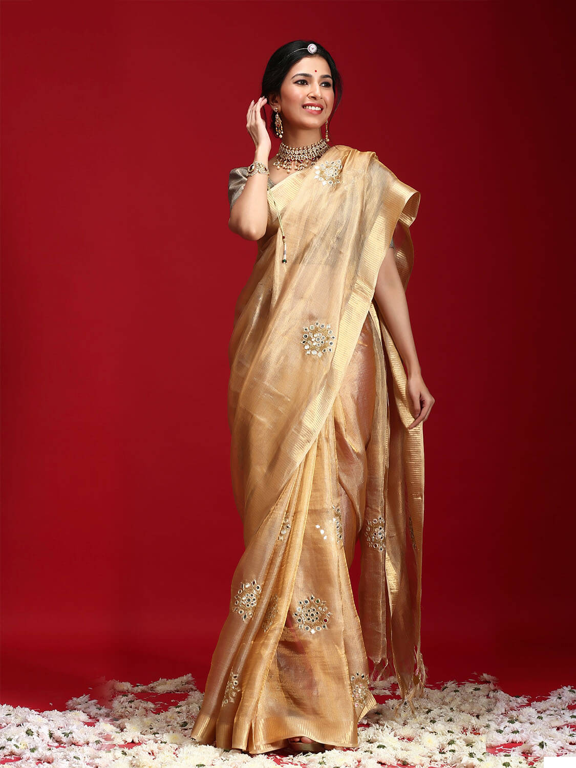 Karnavati Saree is a classic golden tissue with motifs of mirrorwork inspired by the Jaipur aesthetics, this is one a kind, Truly!