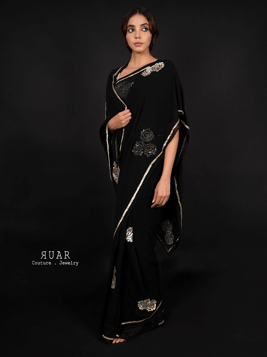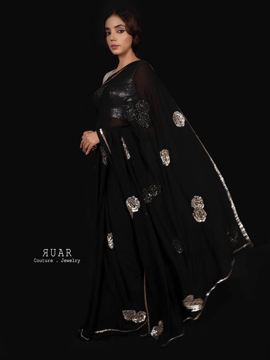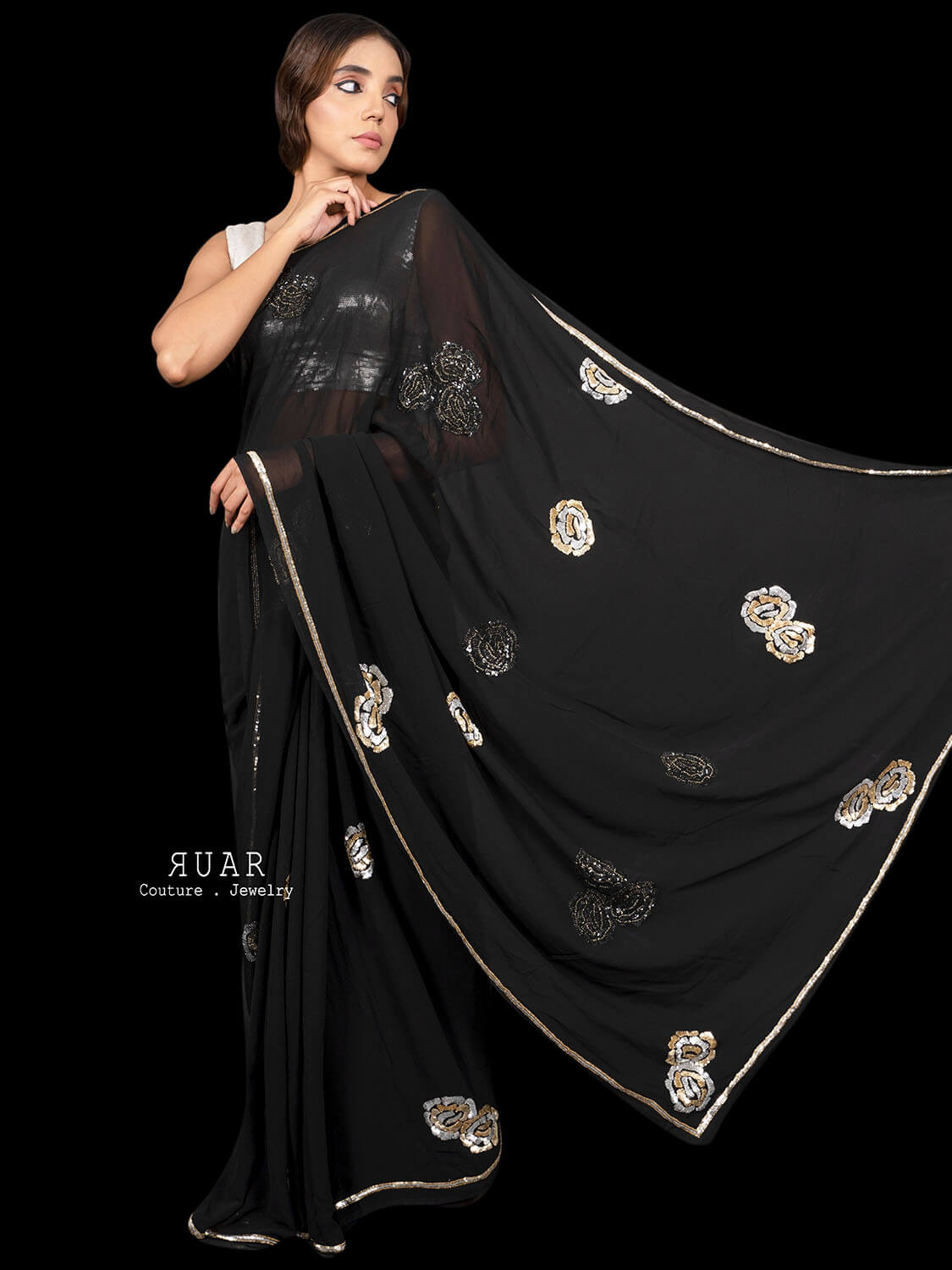 All about the mystical and magical Madhubala, our black rich chiffon with hand embroidered bling flowers all over the Saree is a tribute to the veteran actress.