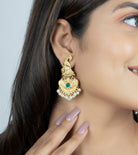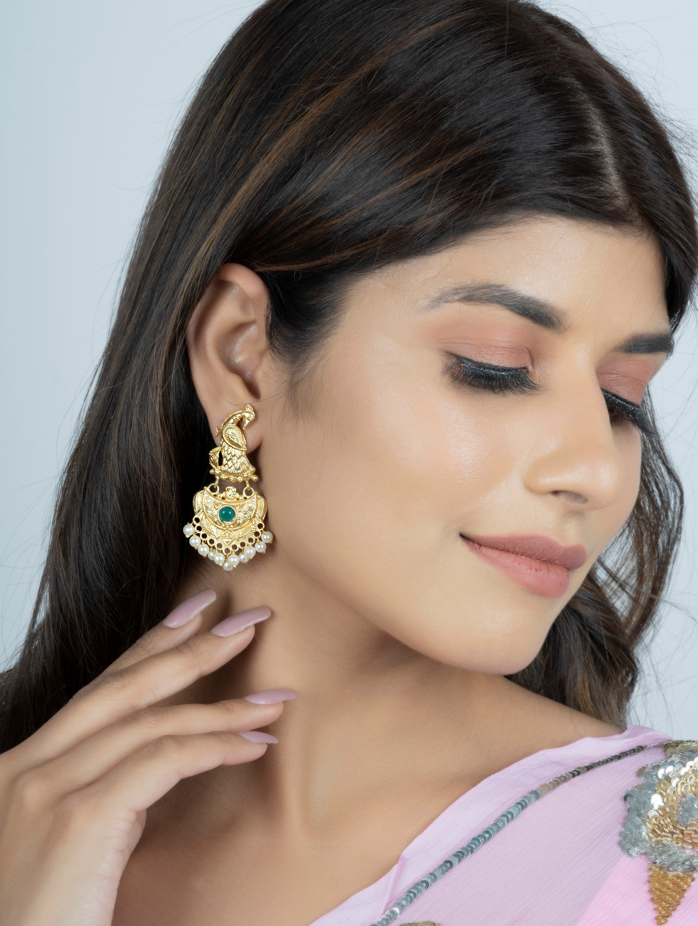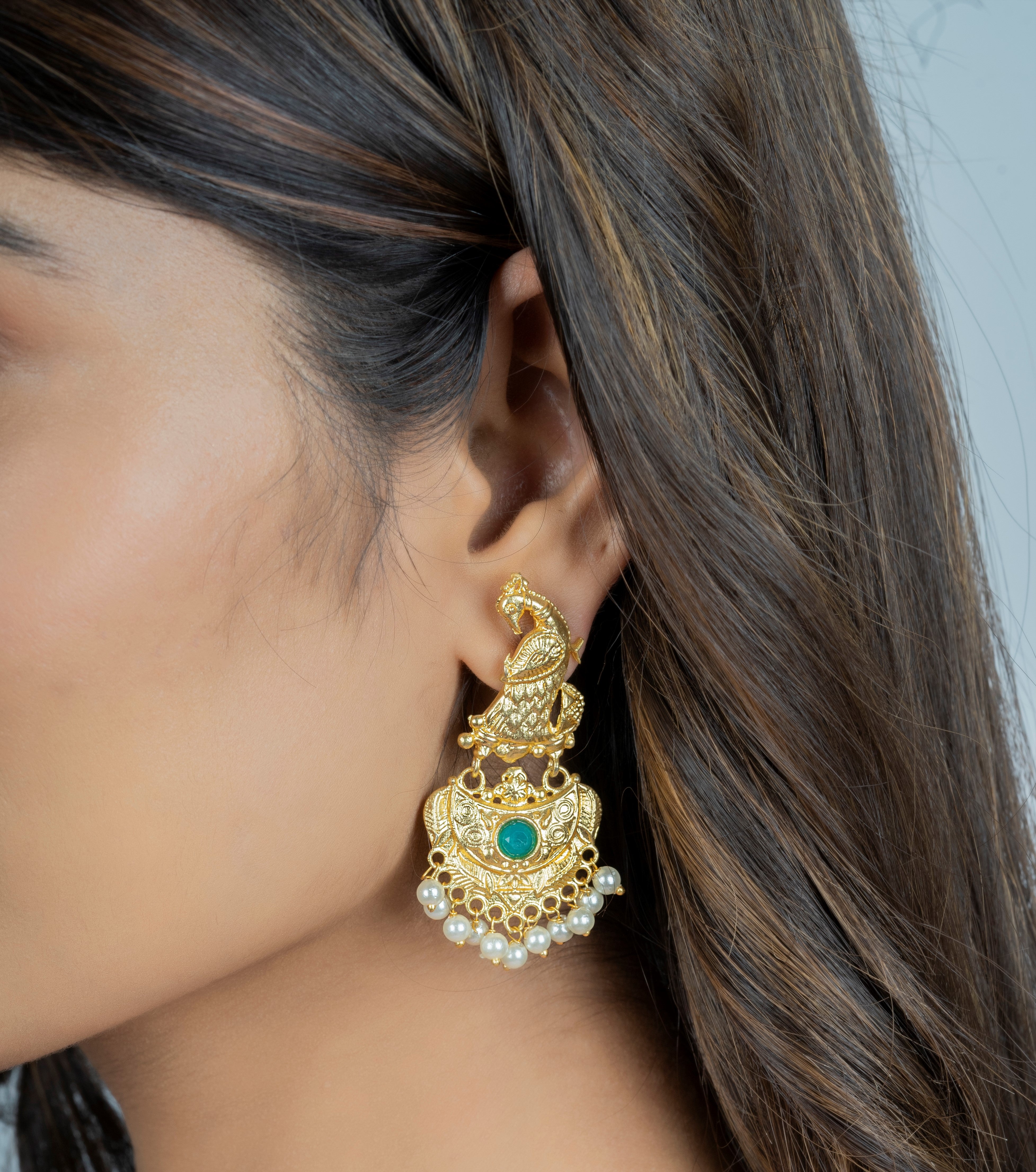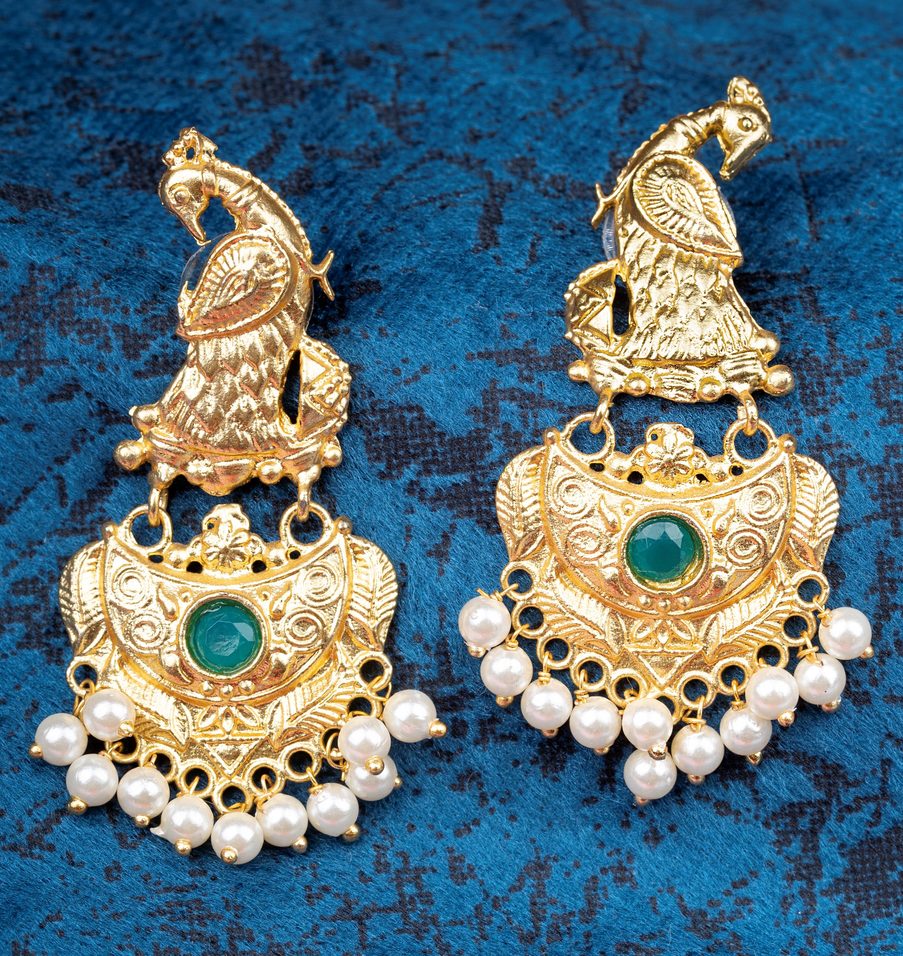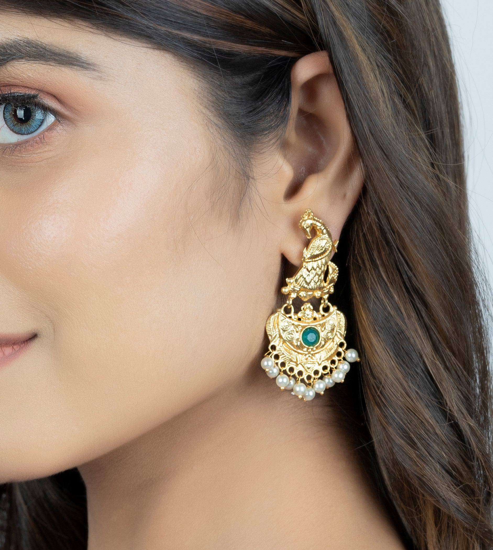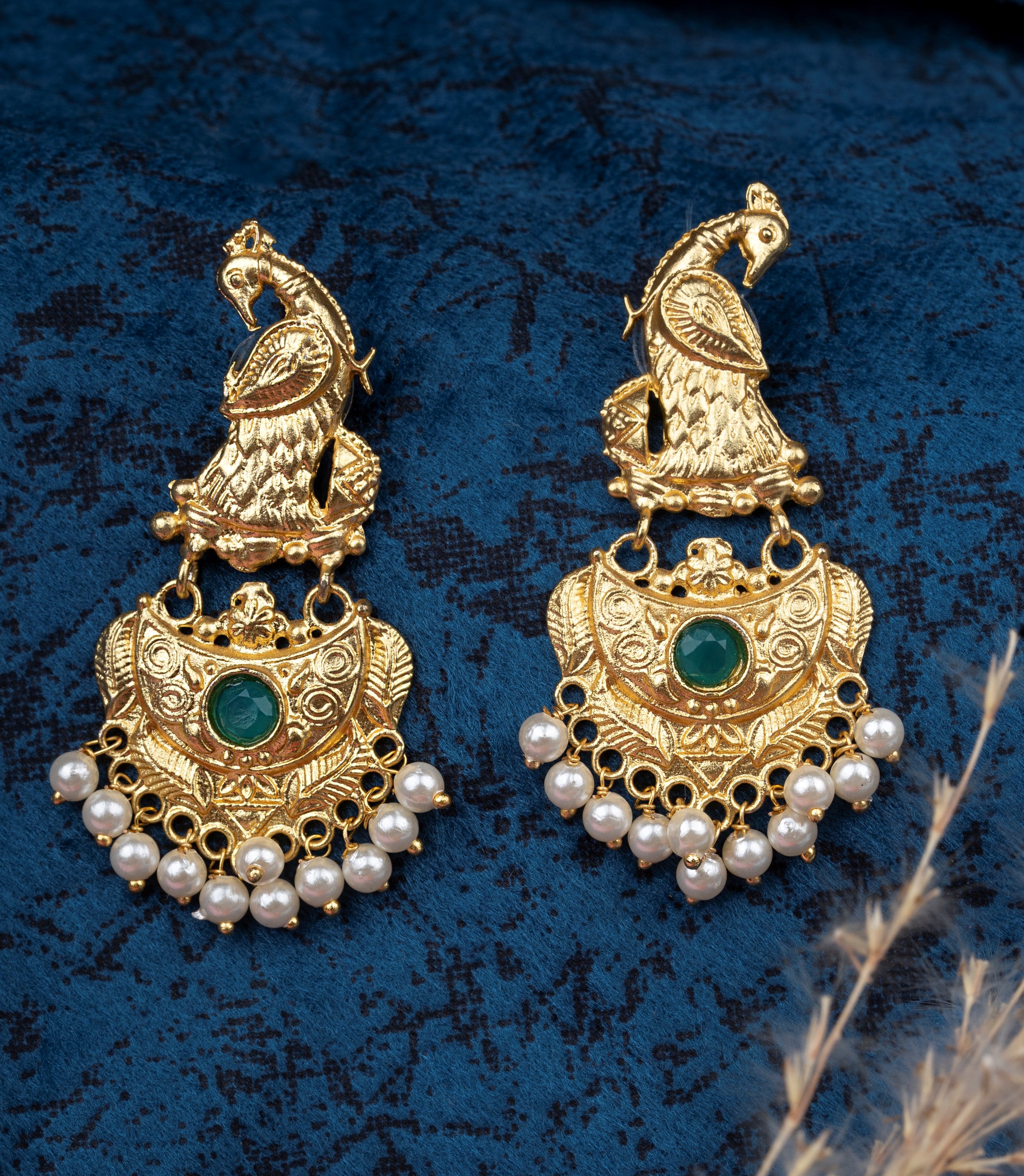 Gold-Toned and Peacock Shaped Earrings, gold-plated, and has artificial stone and pearls.