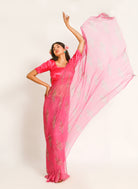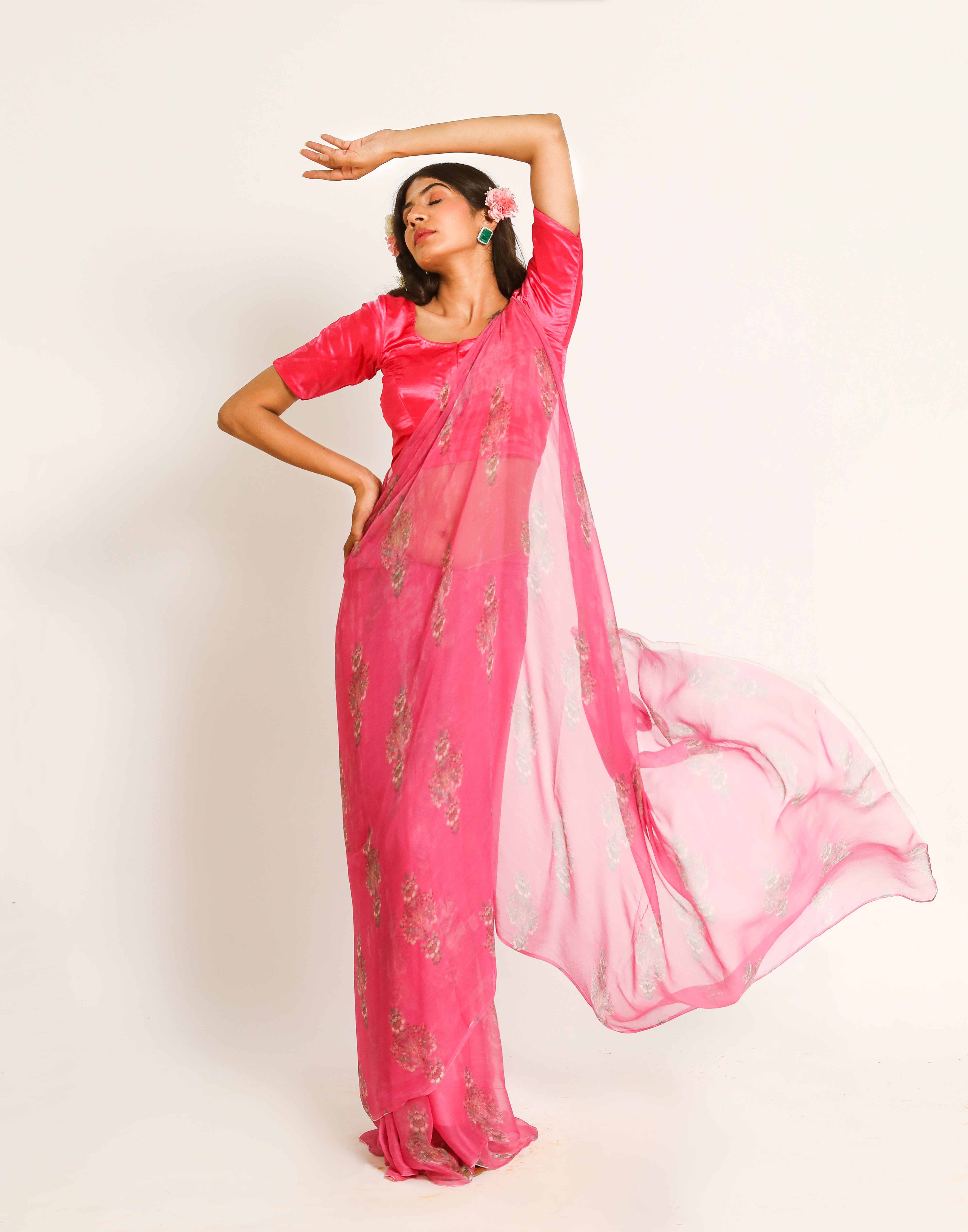 A printed soft pure chiffon saree paired with a Rani pink satin blouse.