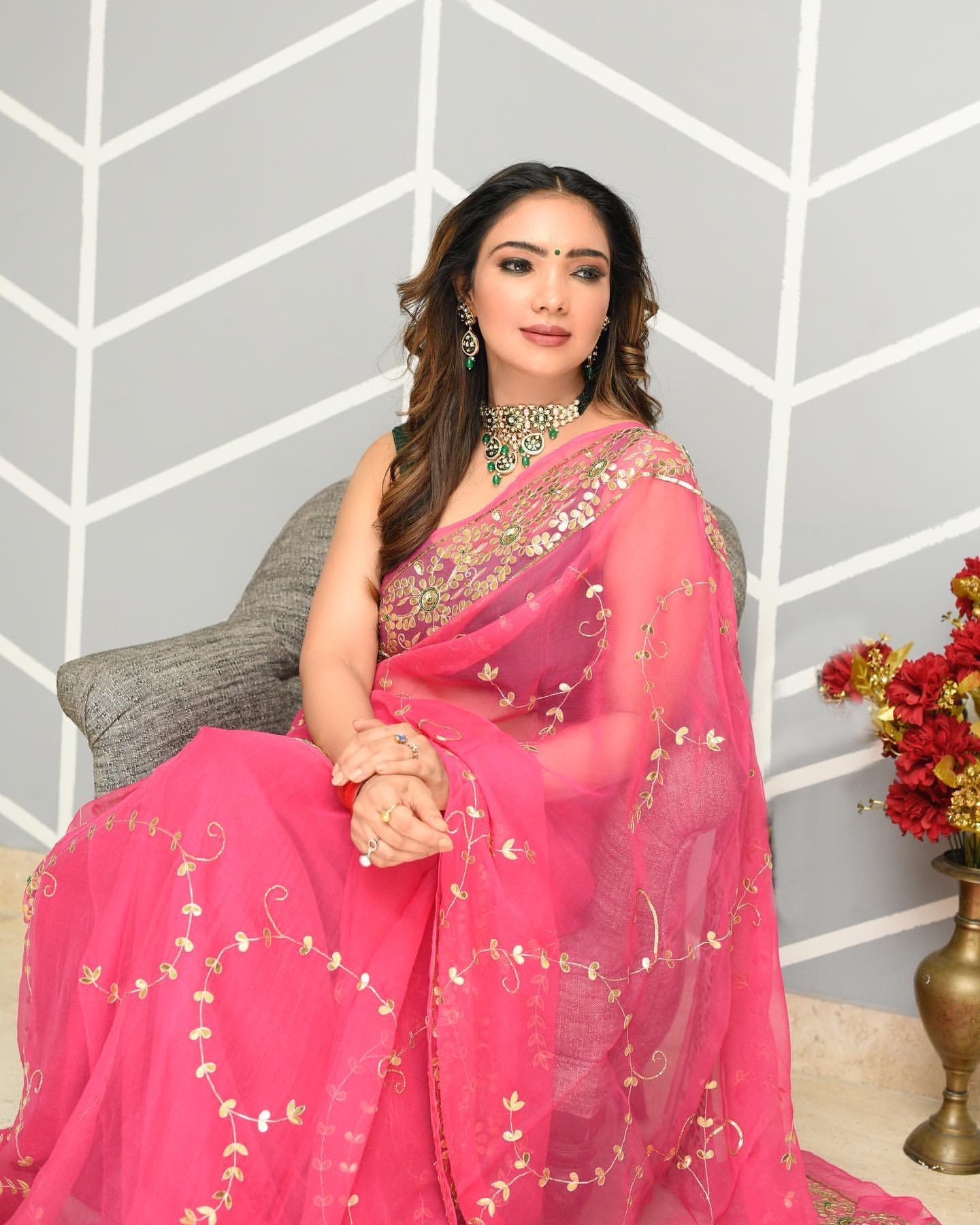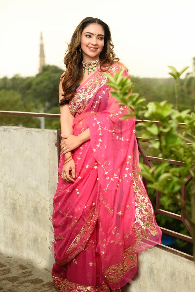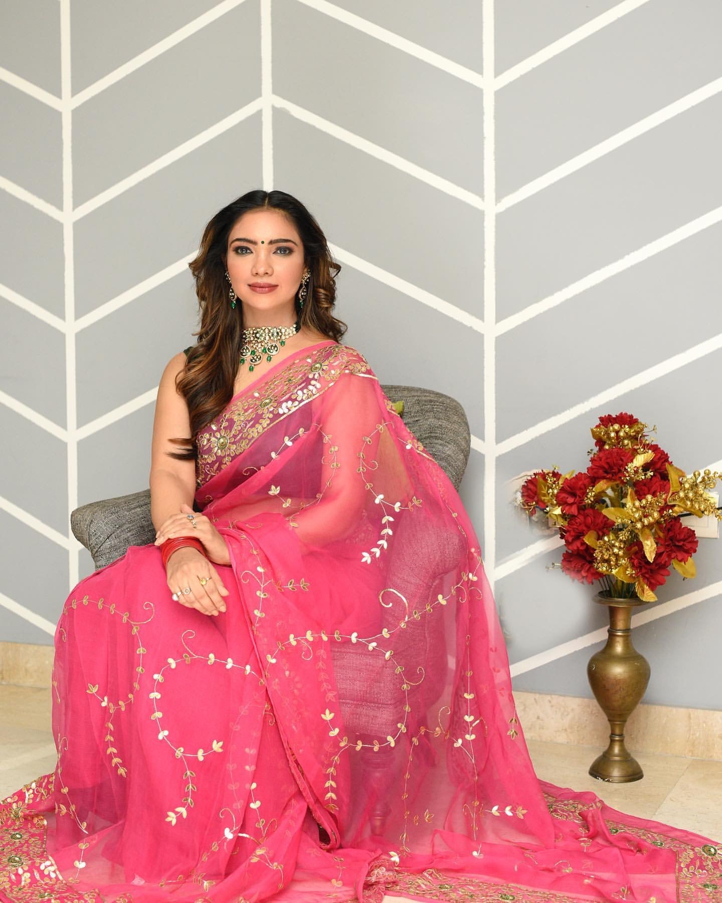 Meenakshi Saree is inspired by vintage traditions, the lightweight chiffon in pink with all-over hand embroidery is one of a kind!
