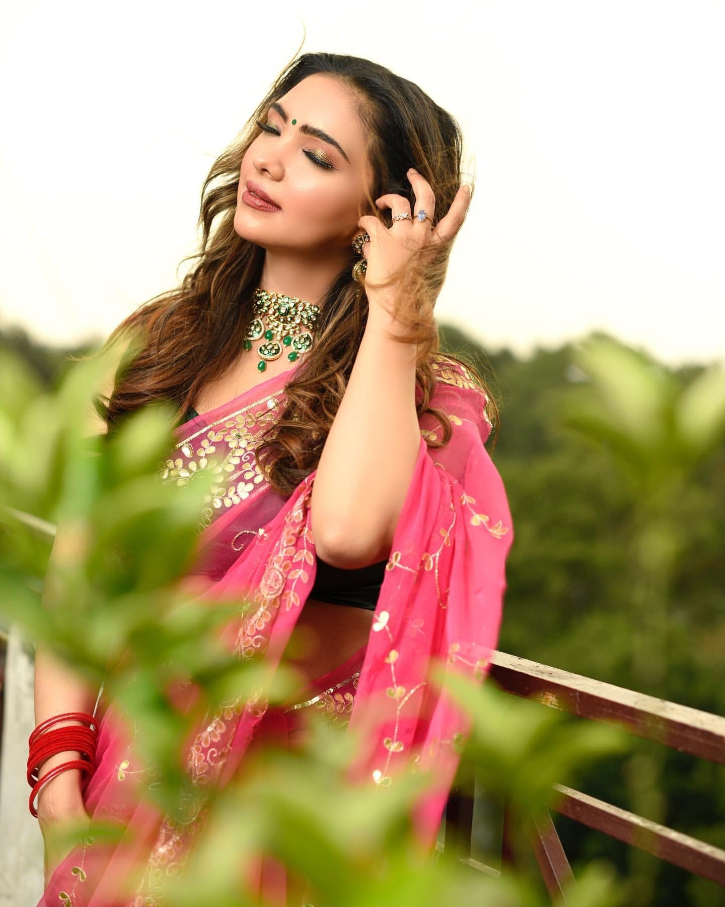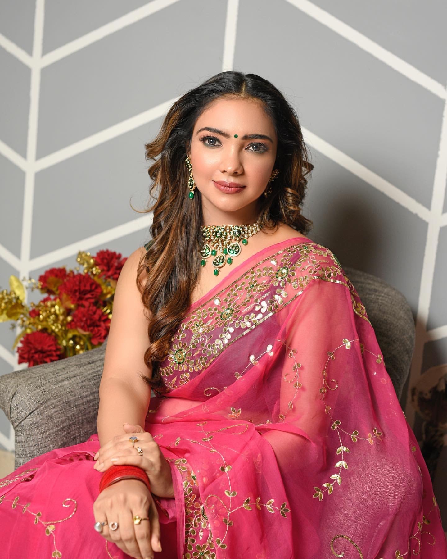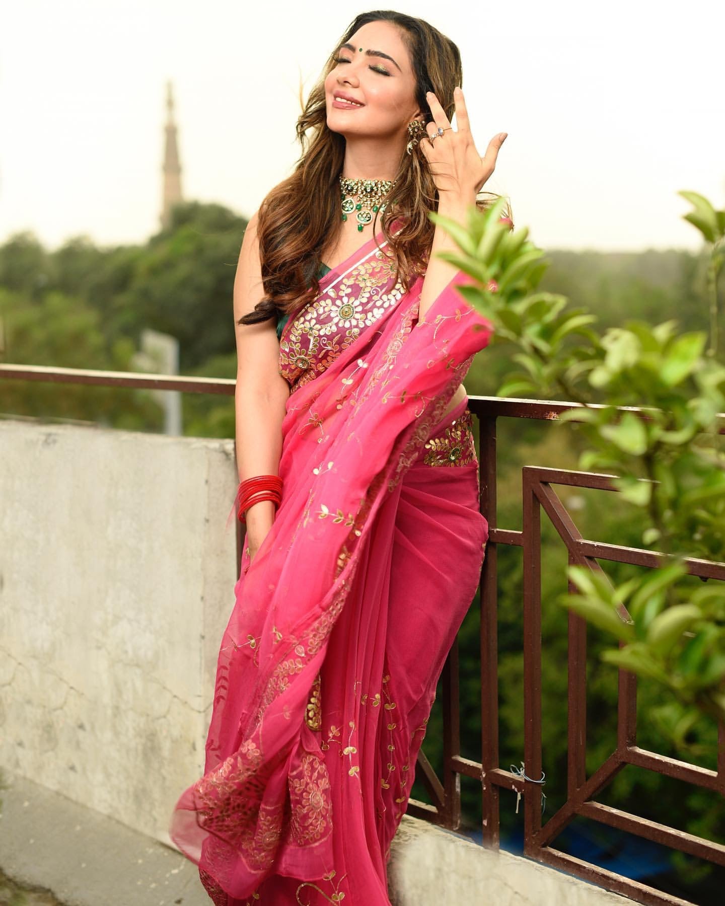 Meenakshi Saree is inspired by vintage traditions, the lightweight chiffon in pink with all-over hand embroidery is one of a kind!