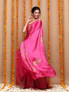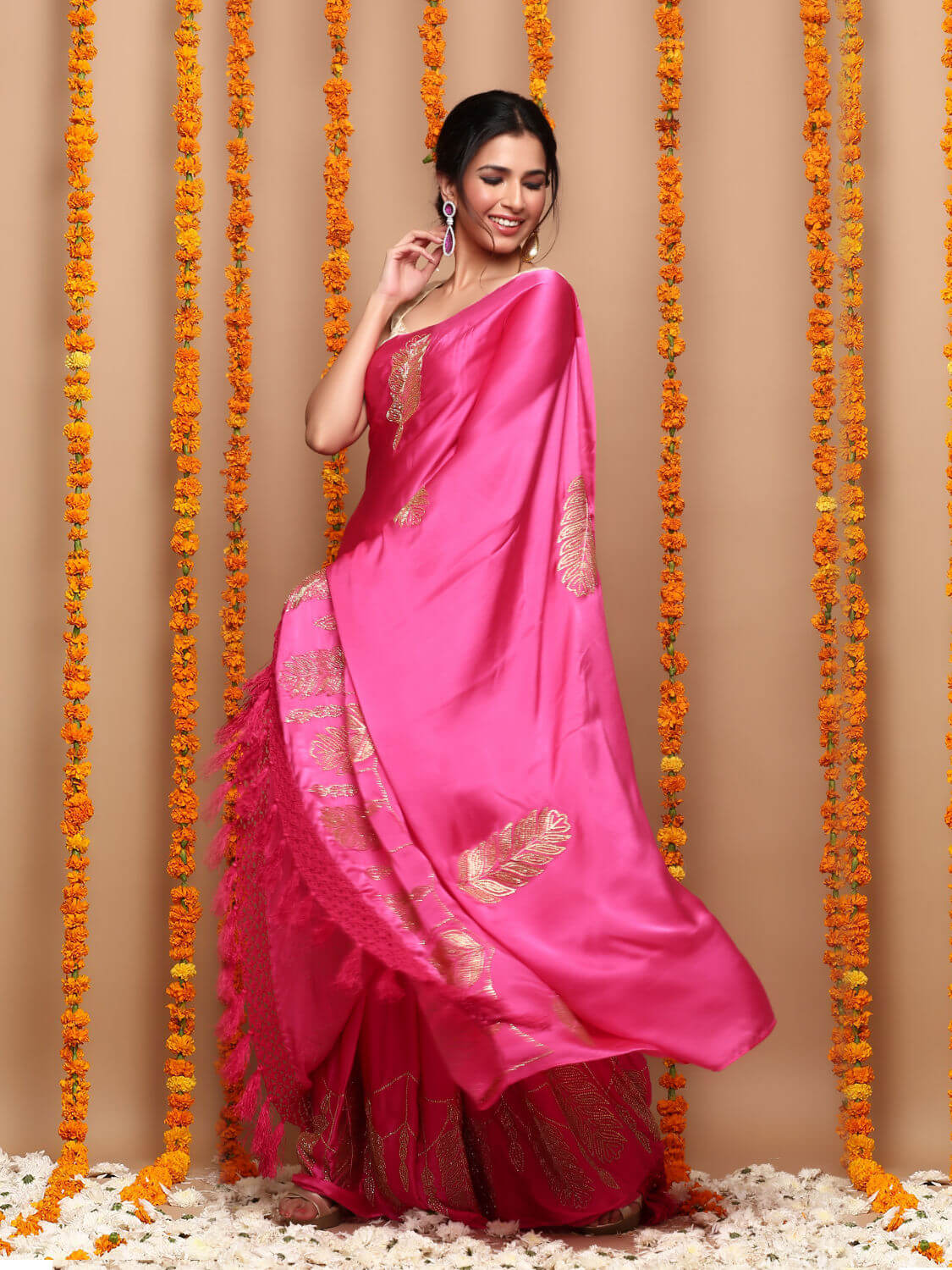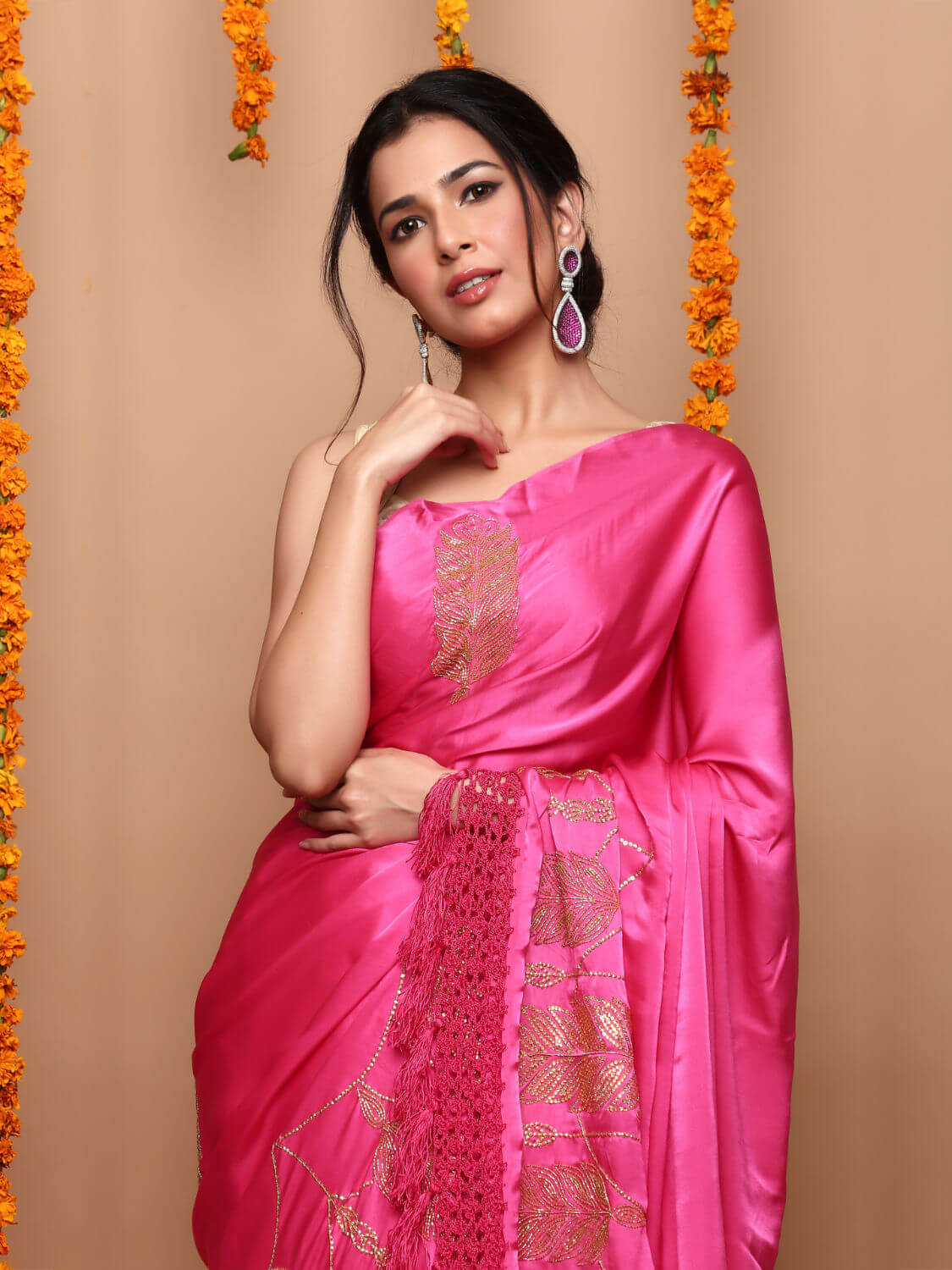 A quintessential pink satin Saree with Swarovski feathers and motifs laced with handmade crochet satin border.
