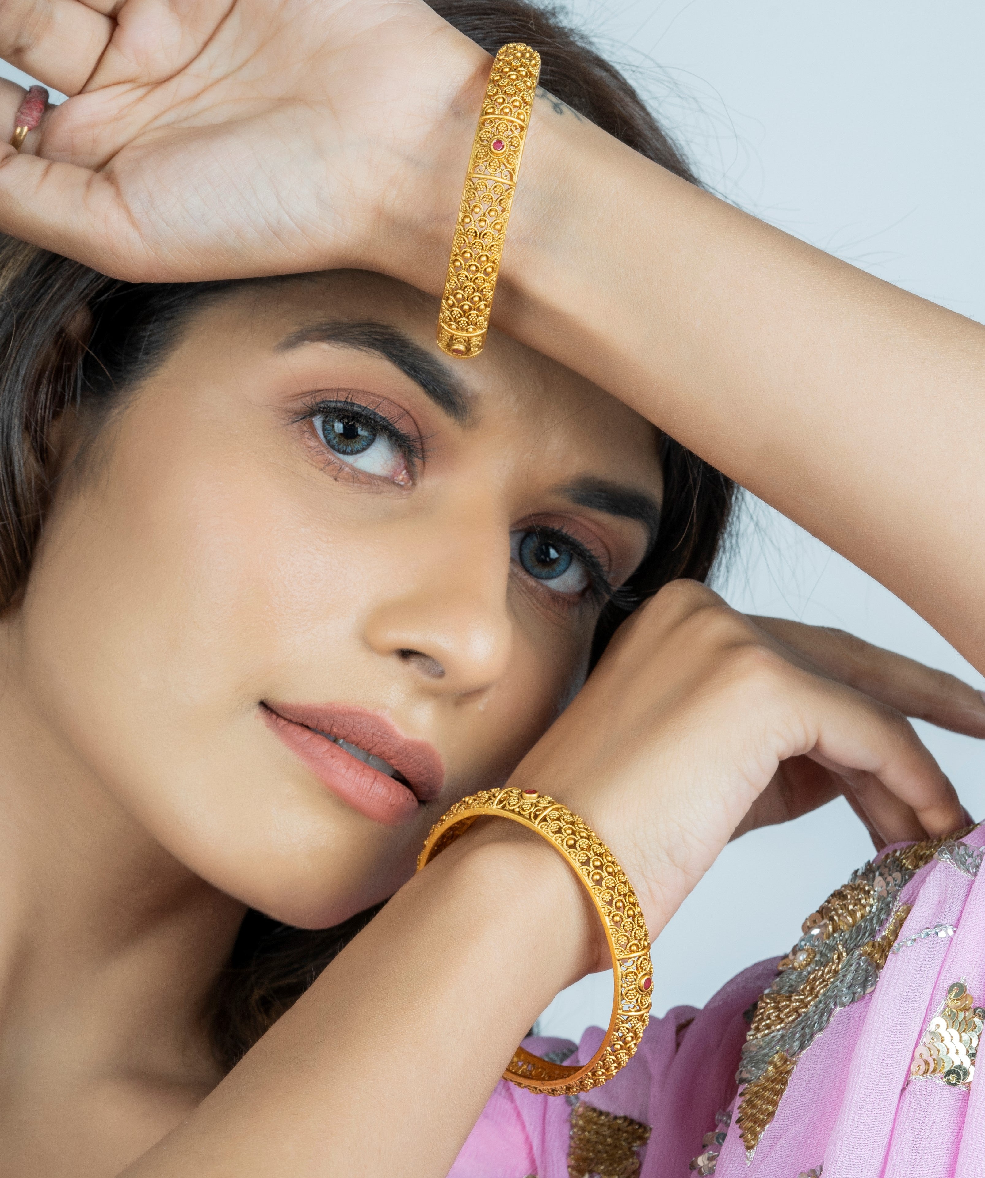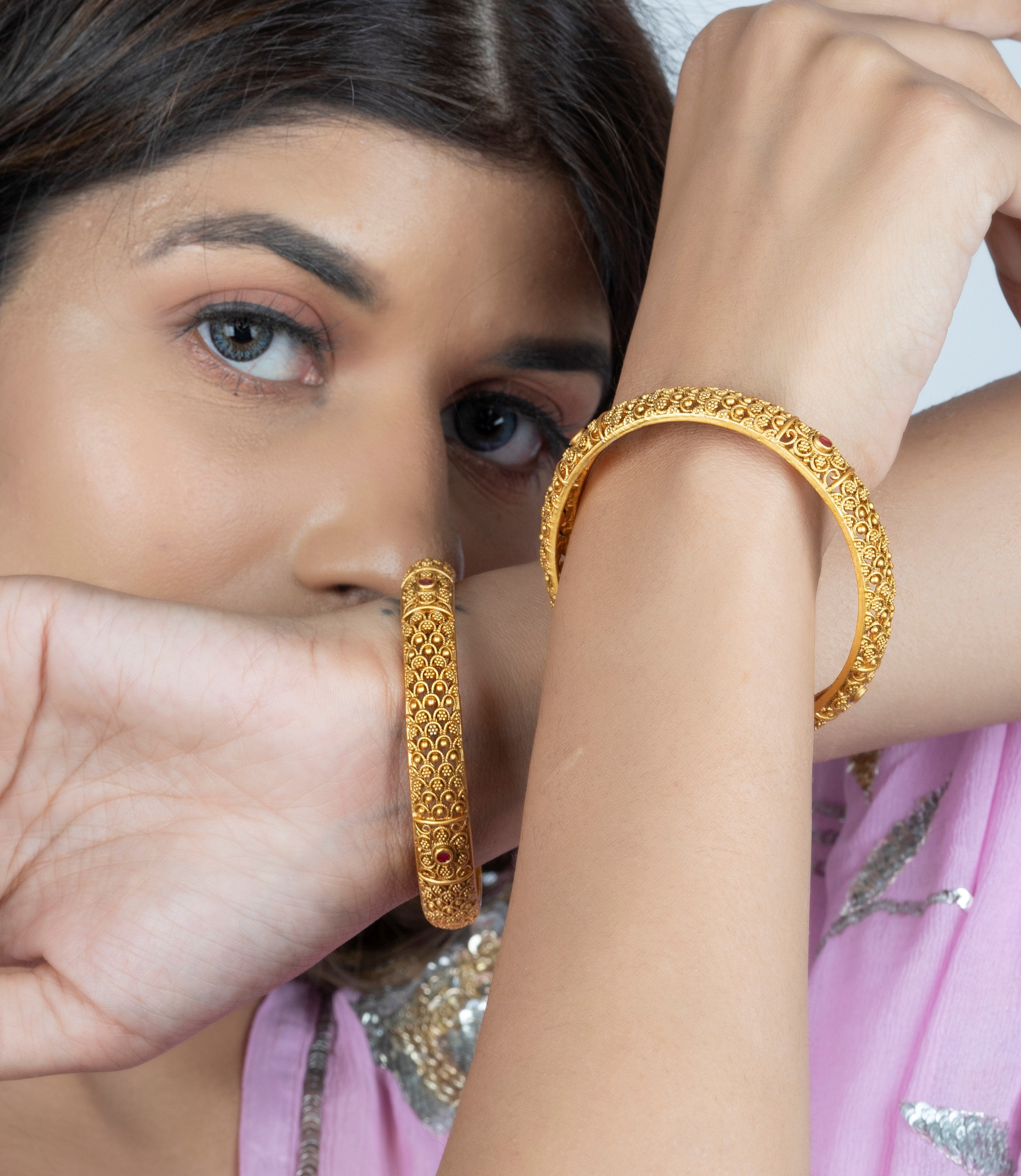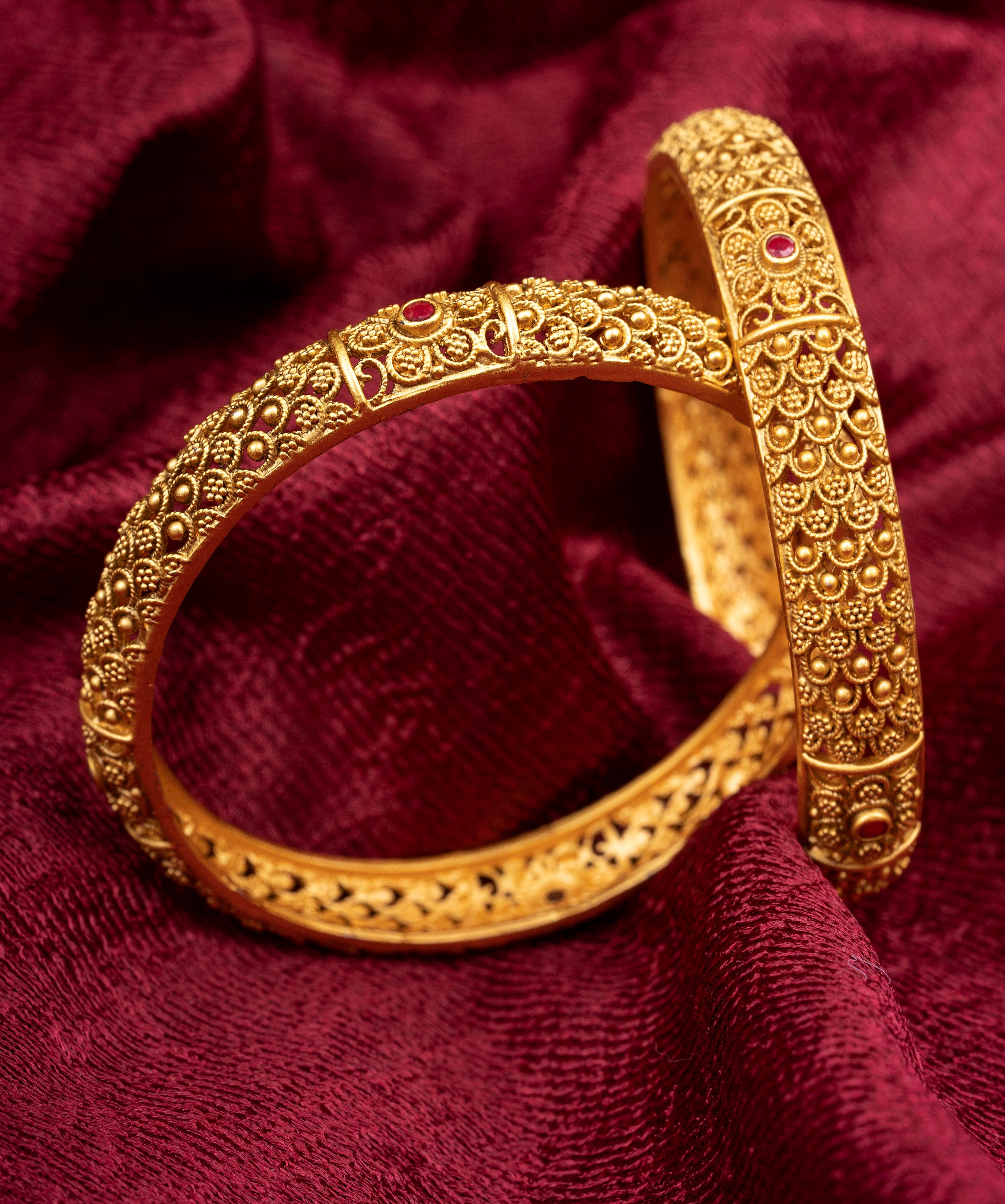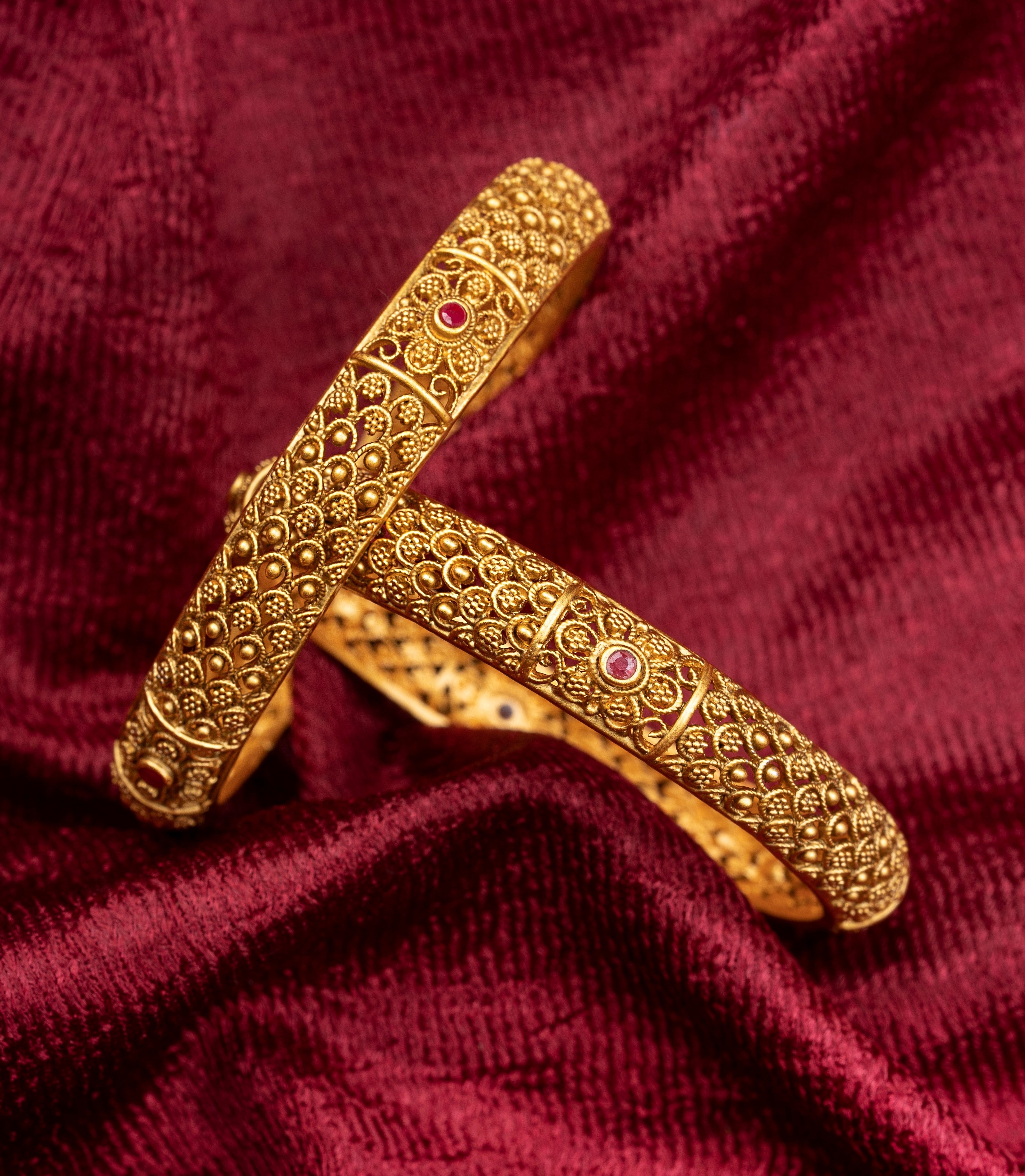 Each has intricate pattern and red-pink stone-studded handcrafted embellished bangles.